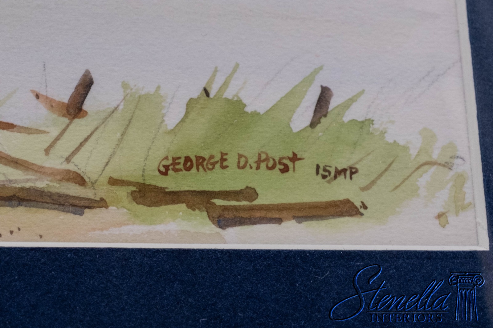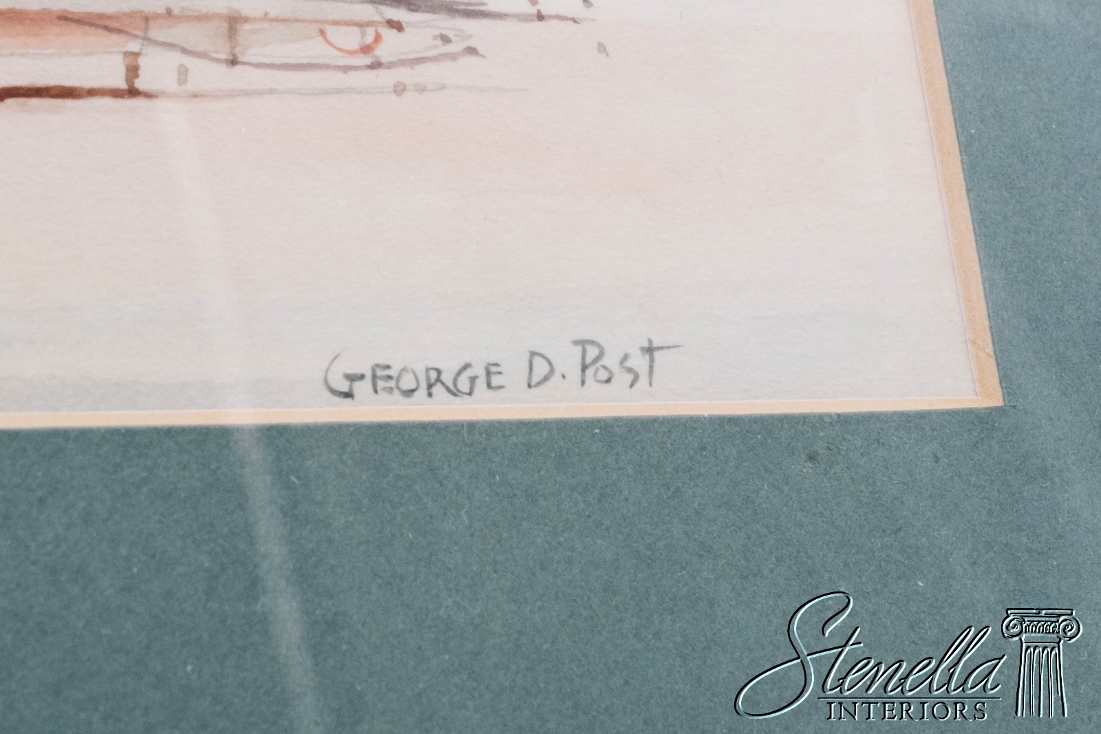 Details: Fishing boats docked at houses and sailboat moored by home. George D. Post (1906-1997), also known as George Booth Post, was an American watercolorist and art educator known for his contributions to the California School of Watercolor. Other painting 13.5 x 1 x 13