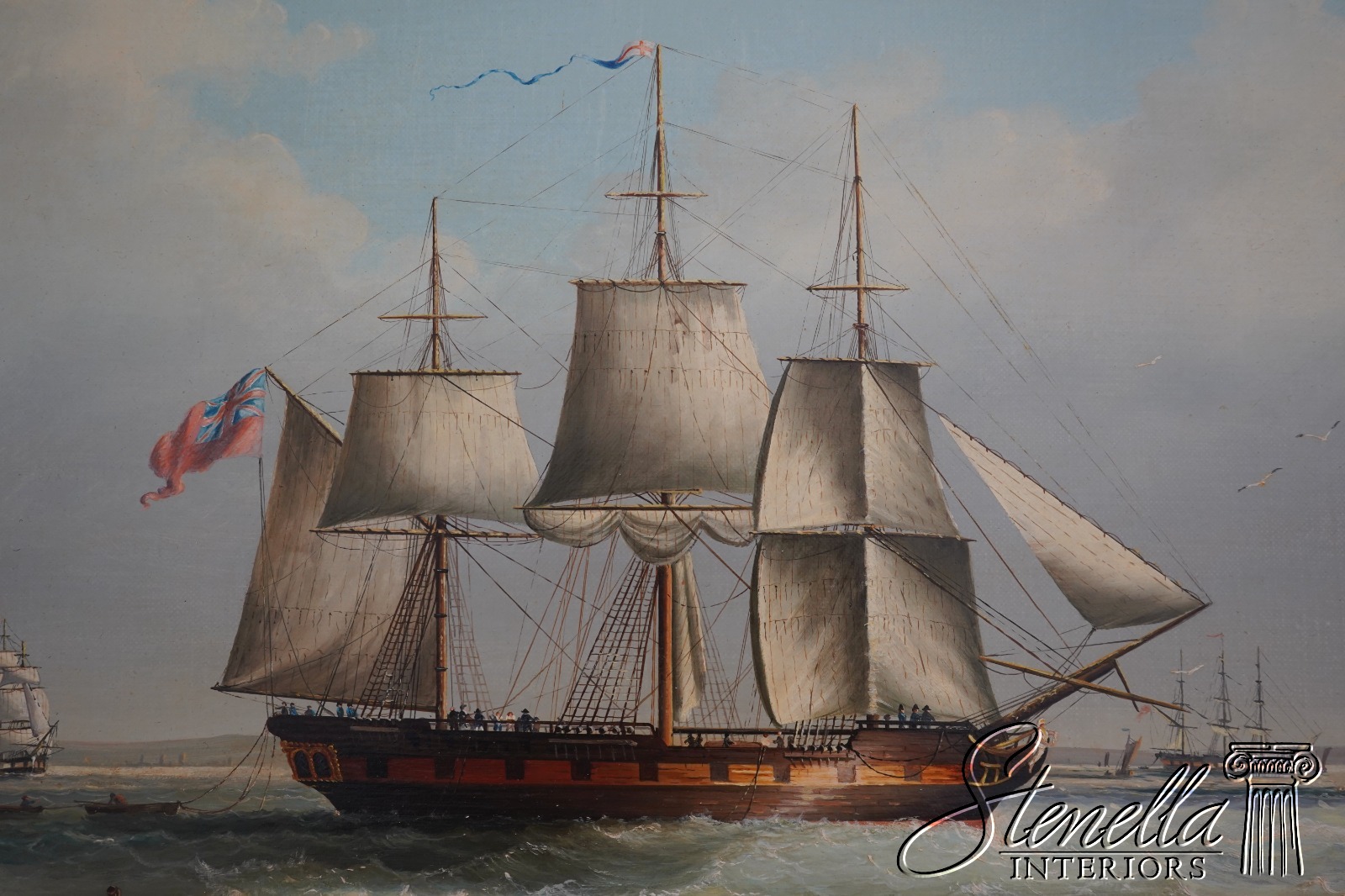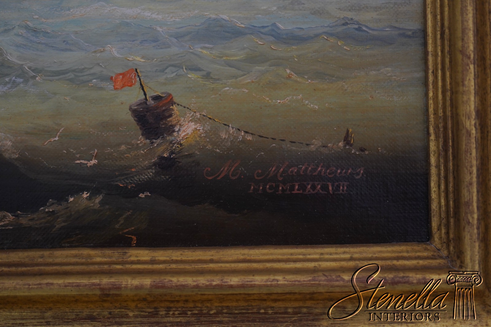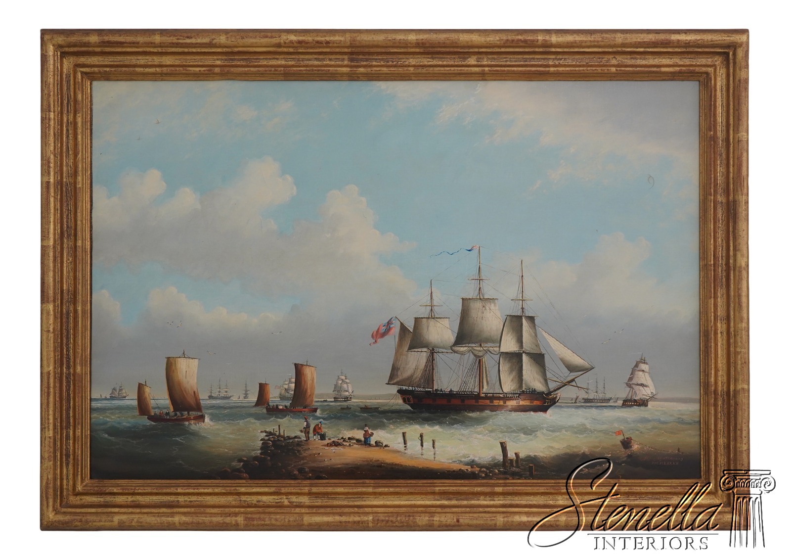 Details: Signed ‘M.Matthews’ High Quality Construction Traditional Style Nice Gold Finish Wood Frame Vibrant Colors & Details Artist Signed British Sailing Ship - Cracking To Paint In Spots Offered @ Fraction Original Retail Cost