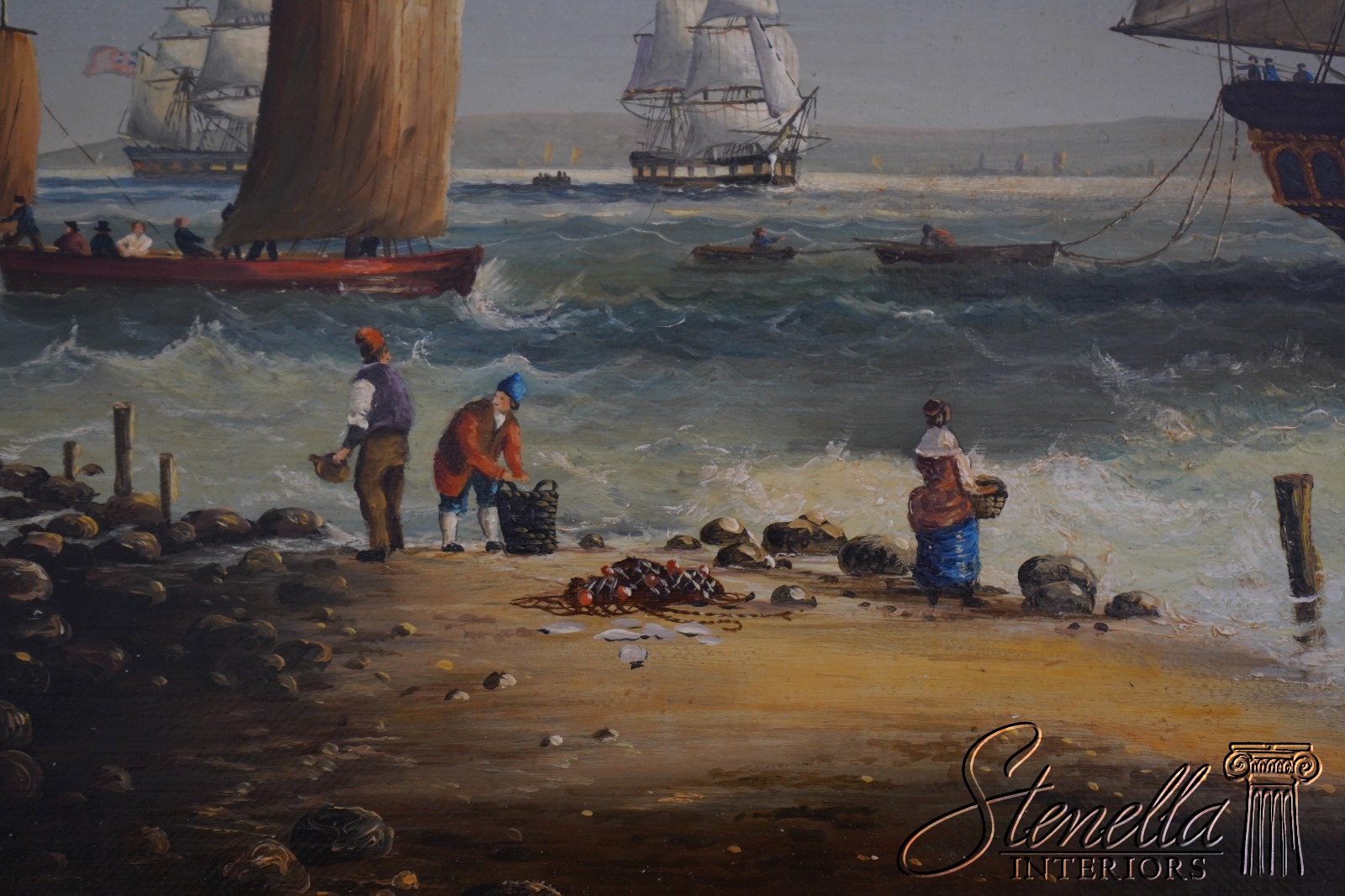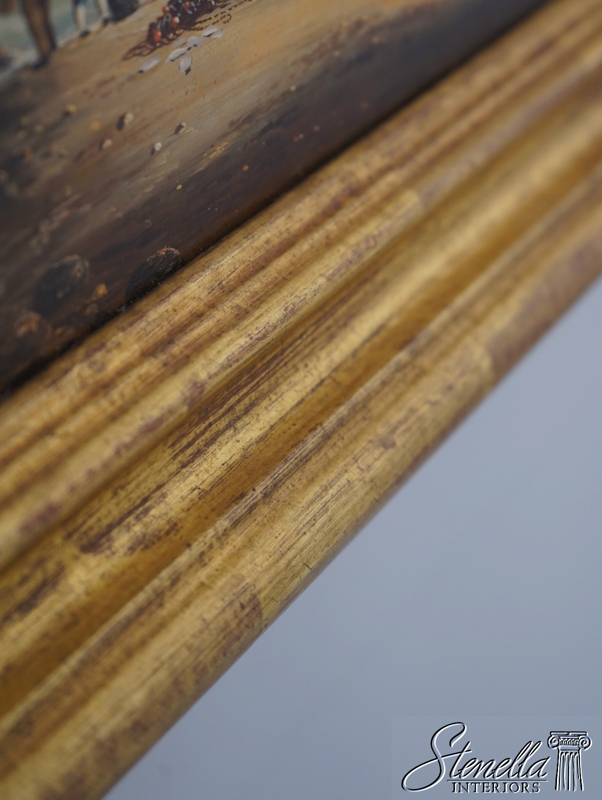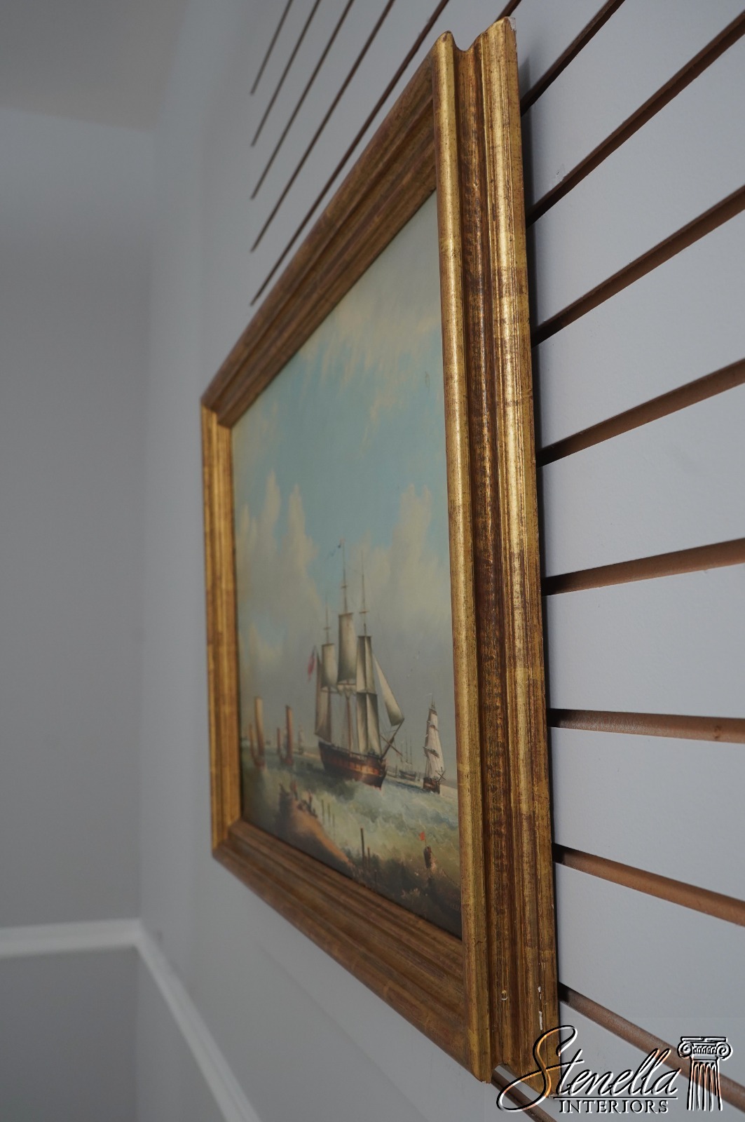 Details: Signed ‘M.Matthews’ High Quality Construction Traditional Style Nice Gold Finish Wood Frame Vibrant Colors & Details Artist Signed British Sailing Ship - Cracking To Paint In Spots Offered @ Fraction Original Retail Cost