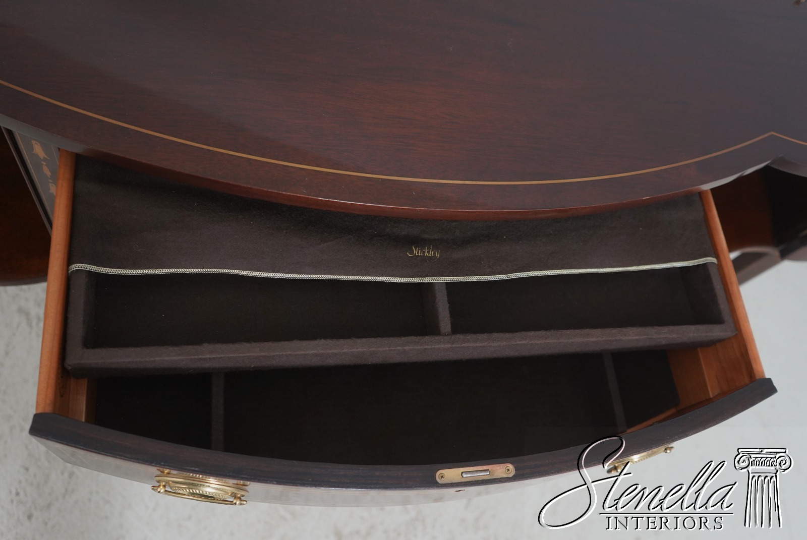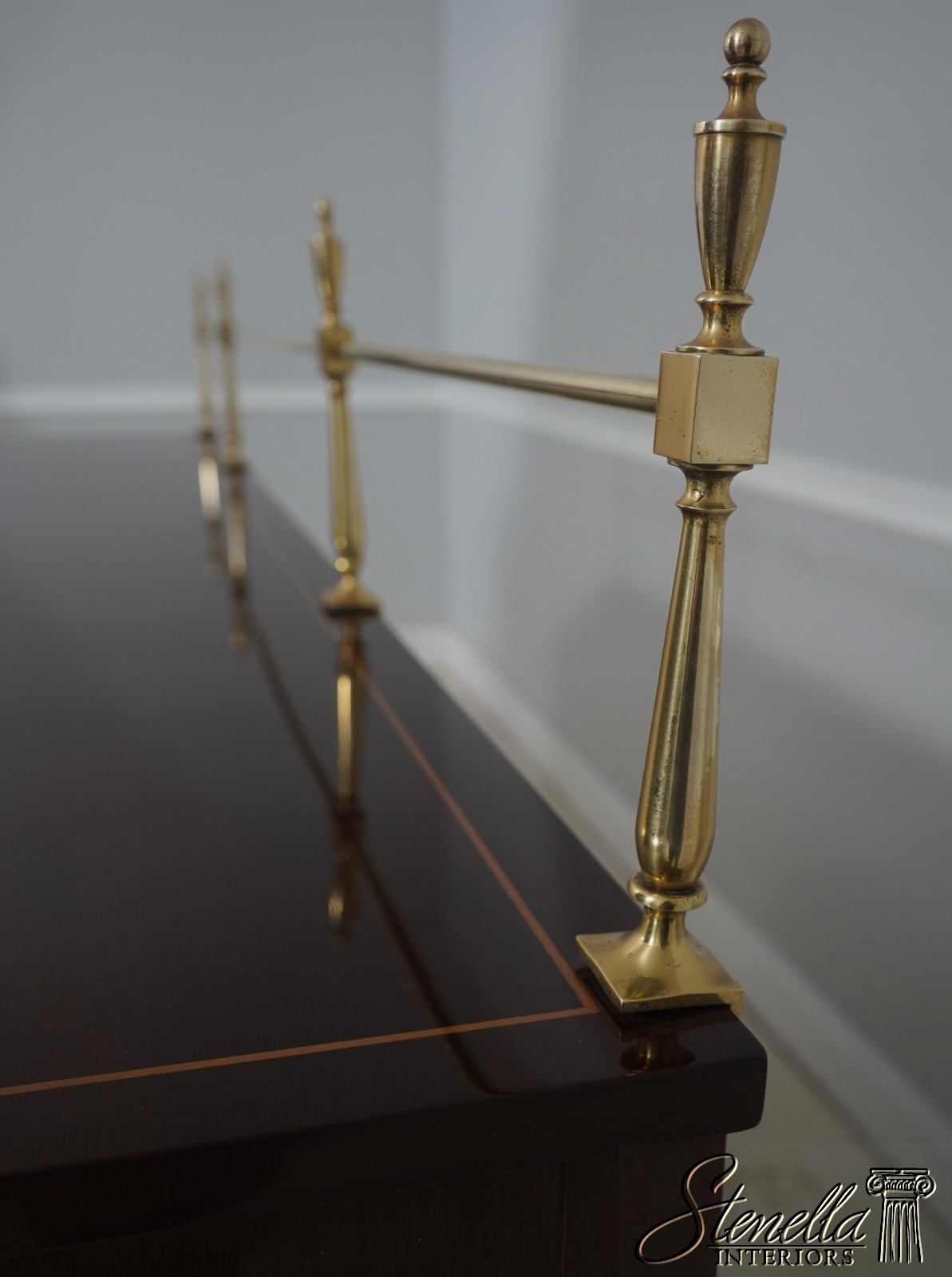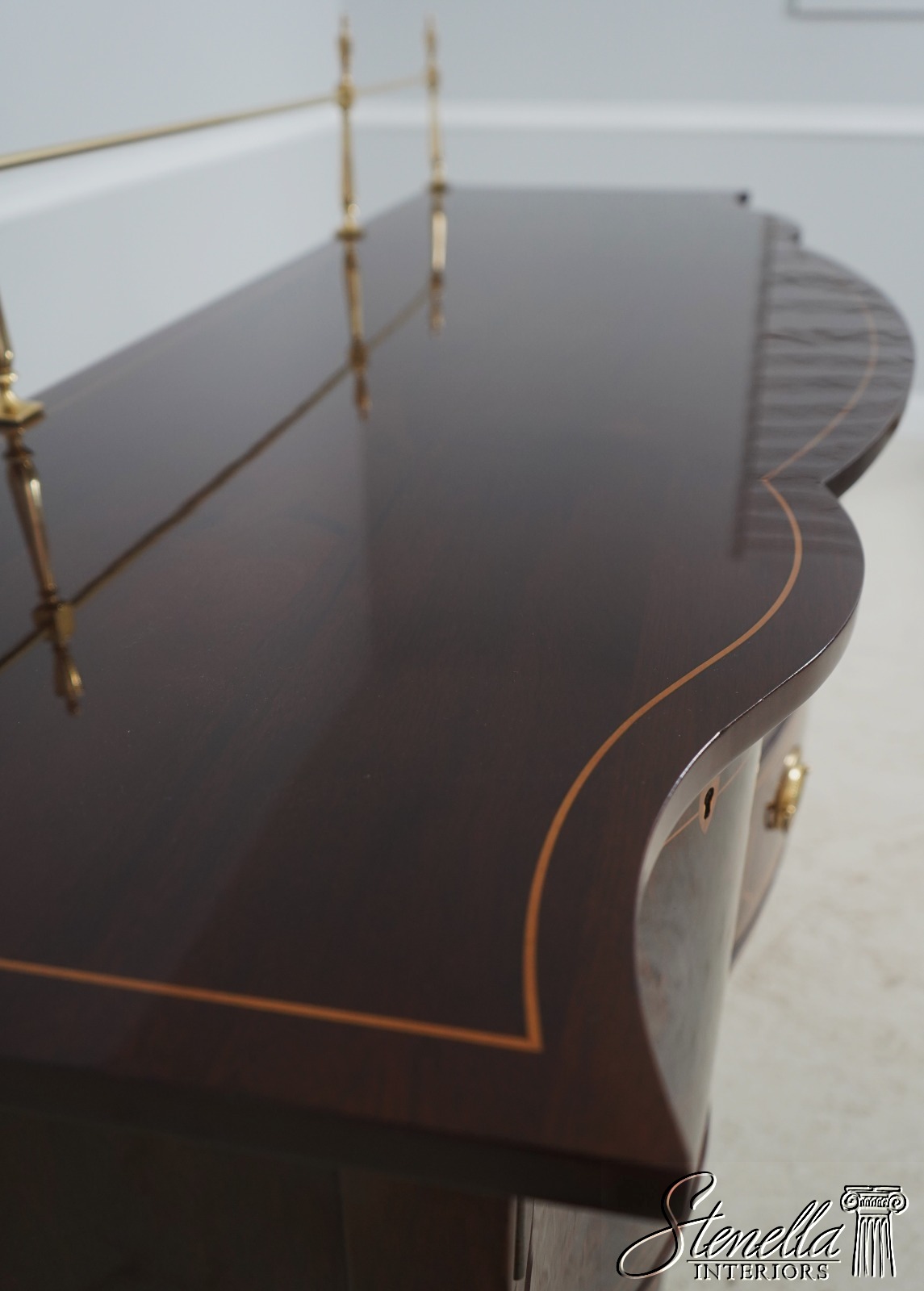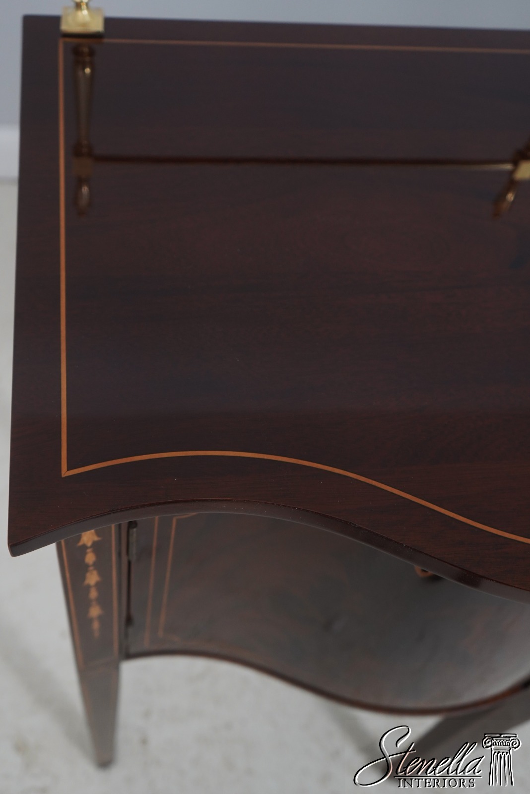 Details: Mahogany Brass Gallery Top High Quality Construction Nice Inlay Work Throughout Rich High Sheen Custom Finish Traditional Style Solid Brass Hardware Bell Flower Inlay Key Locking w. Key Felt Lined Drawer Offered @ Fraction Original Retail Cost