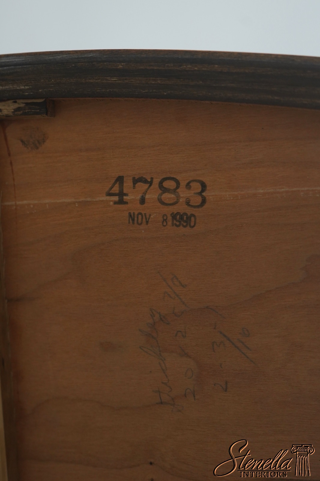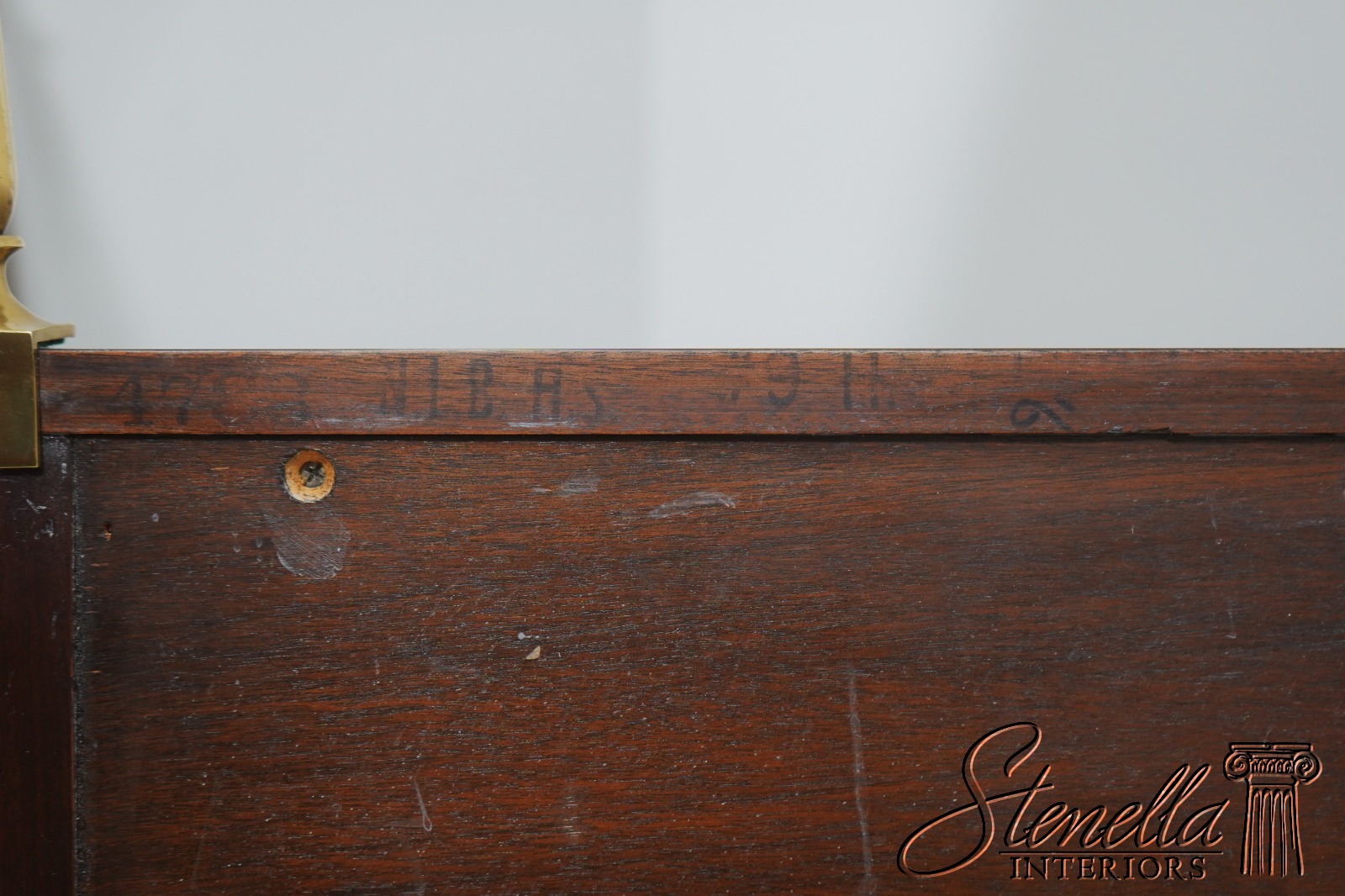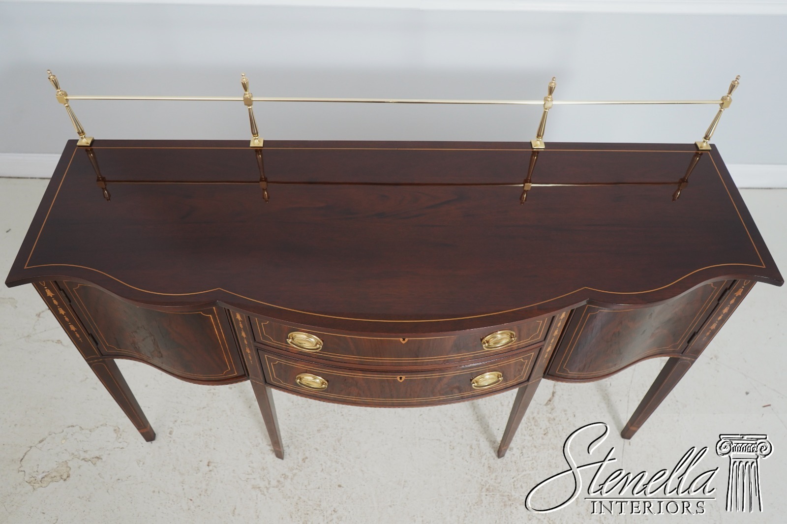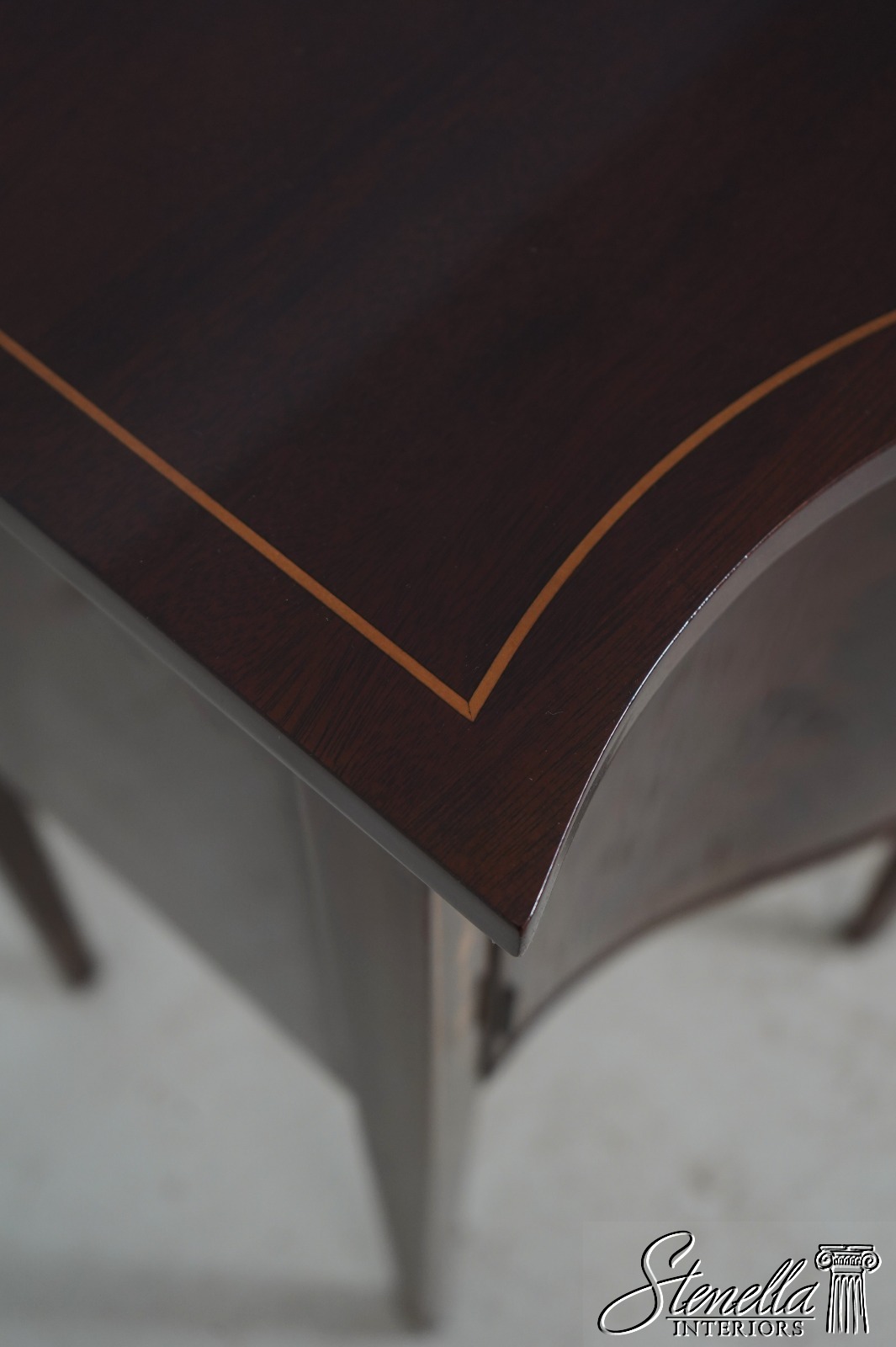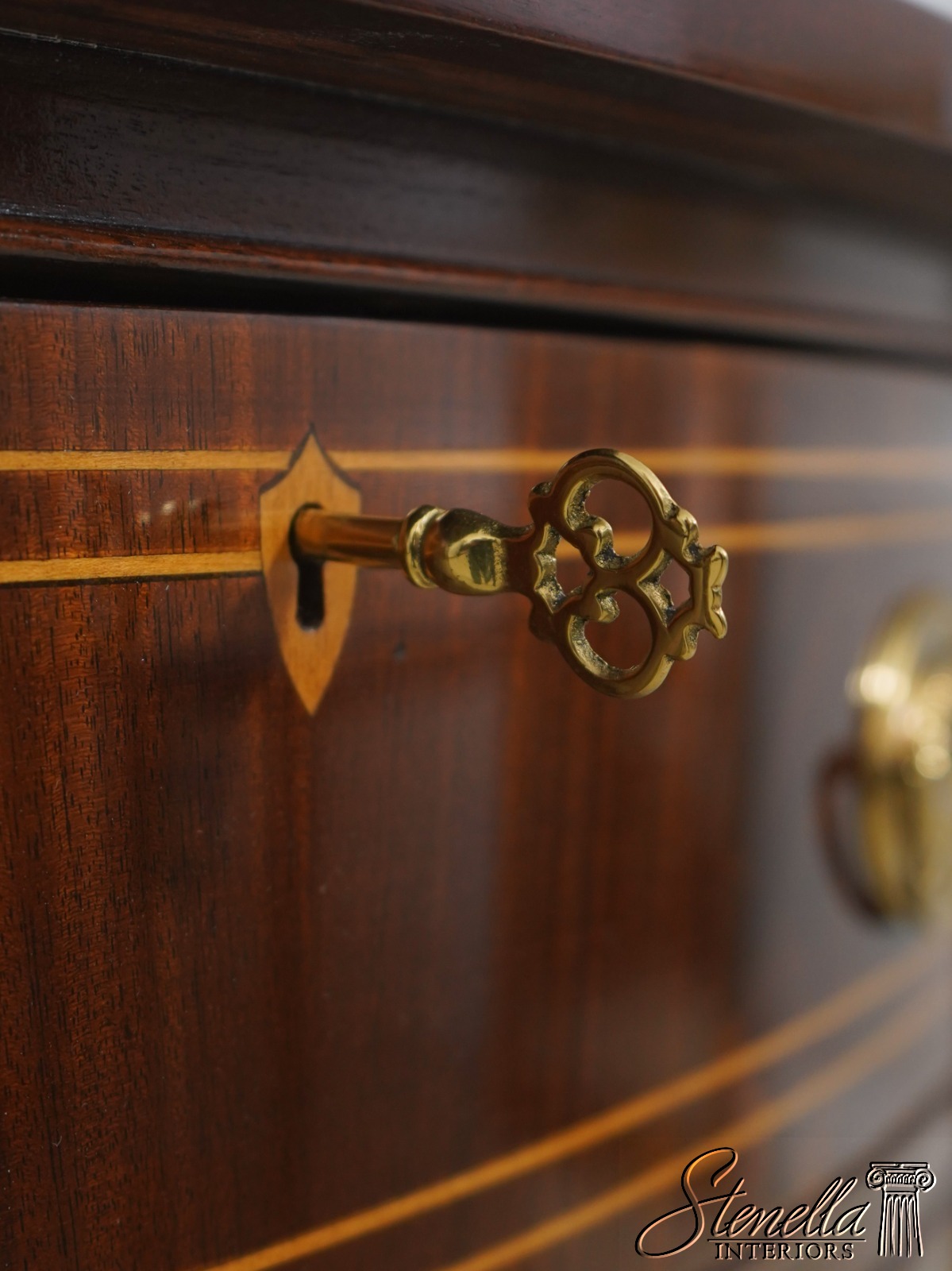 Details: Mahogany Brass Gallery Top High Quality Construction Nice Inlay Work Throughout Rich High Sheen Custom Finish Traditional Style Solid Brass Hardware Bell Flower Inlay Key Locking w. Key Felt Lined Drawer Offered @ Fraction Original Retail Cost