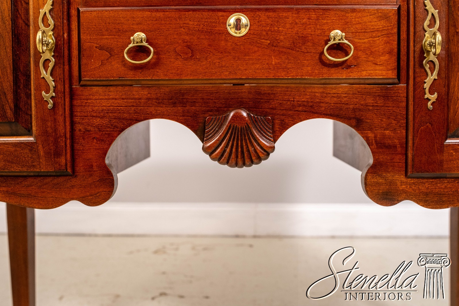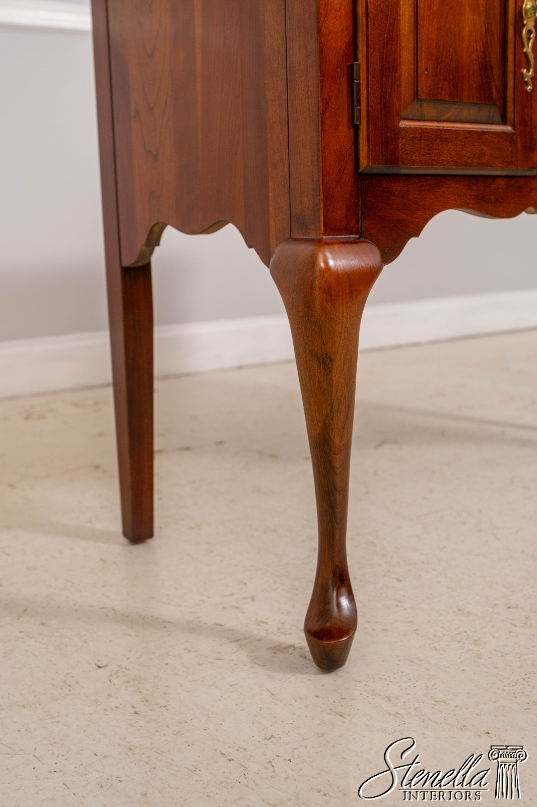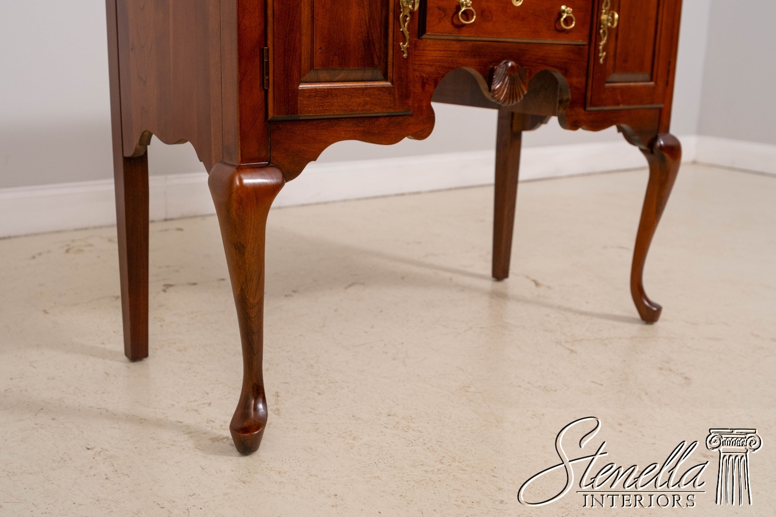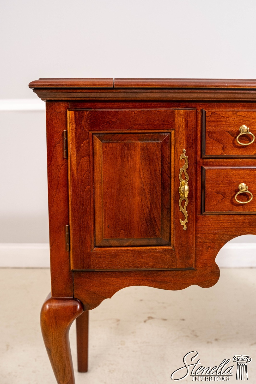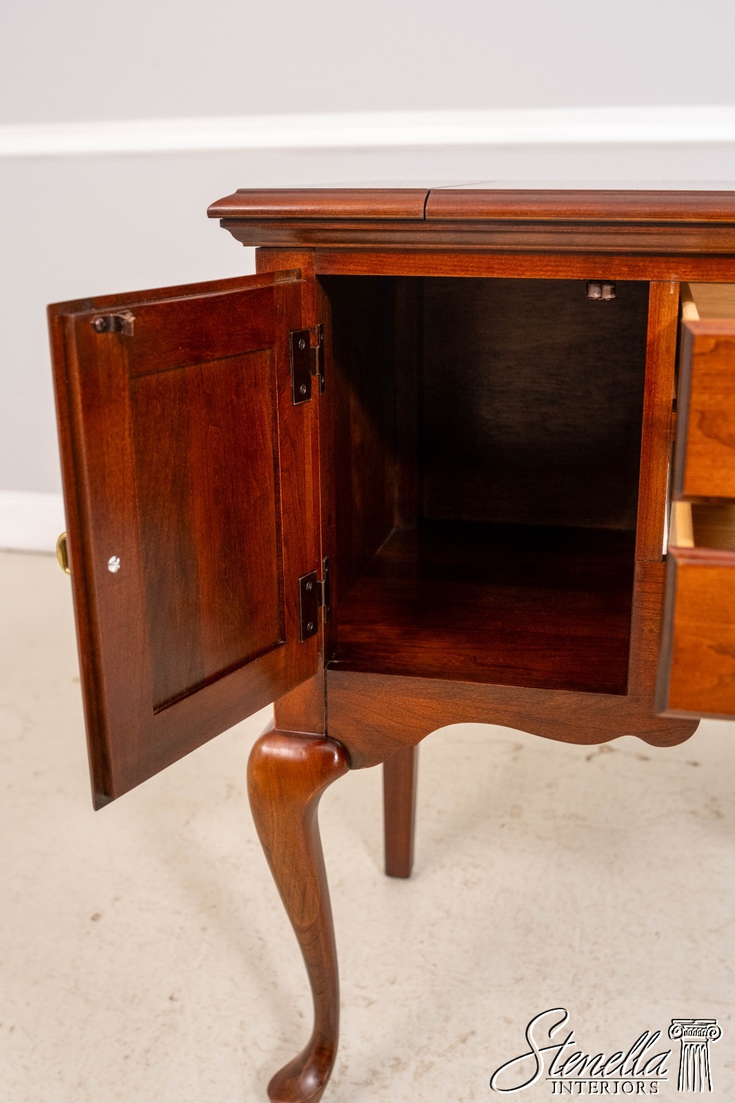 Details: Cherry Dovetailed Drawer Construction Fine Carved Details Quality Construction Queen Anne Legs & Pad Feet Raised Panel Doors Traditional Style Solid Brass Hardware Formica Top Surface Faux Key Plates Offered @ Fraction Original Retail Cost