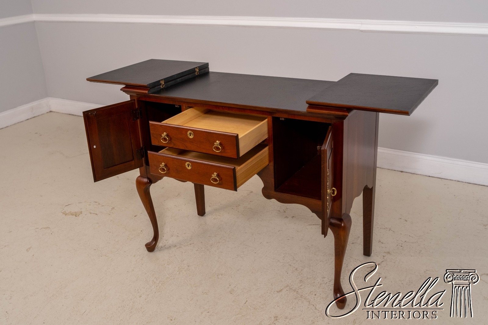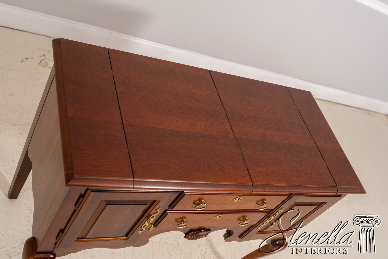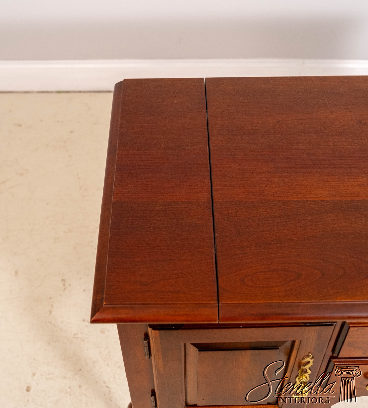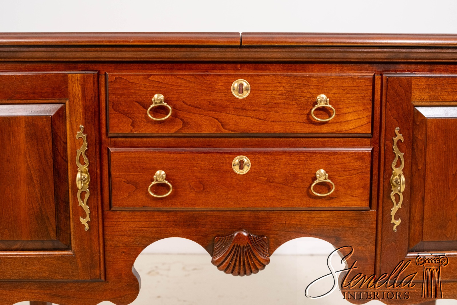 Details: Cherry Dovetailed Drawer Construction Fine Carved Details Quality Construction Queen Anne Legs & Pad Feet Raised Panel Doors Traditional Style Solid Brass Hardware Formica Top Surface Faux Key Plates Offered @ Fraction Original Retail Cost