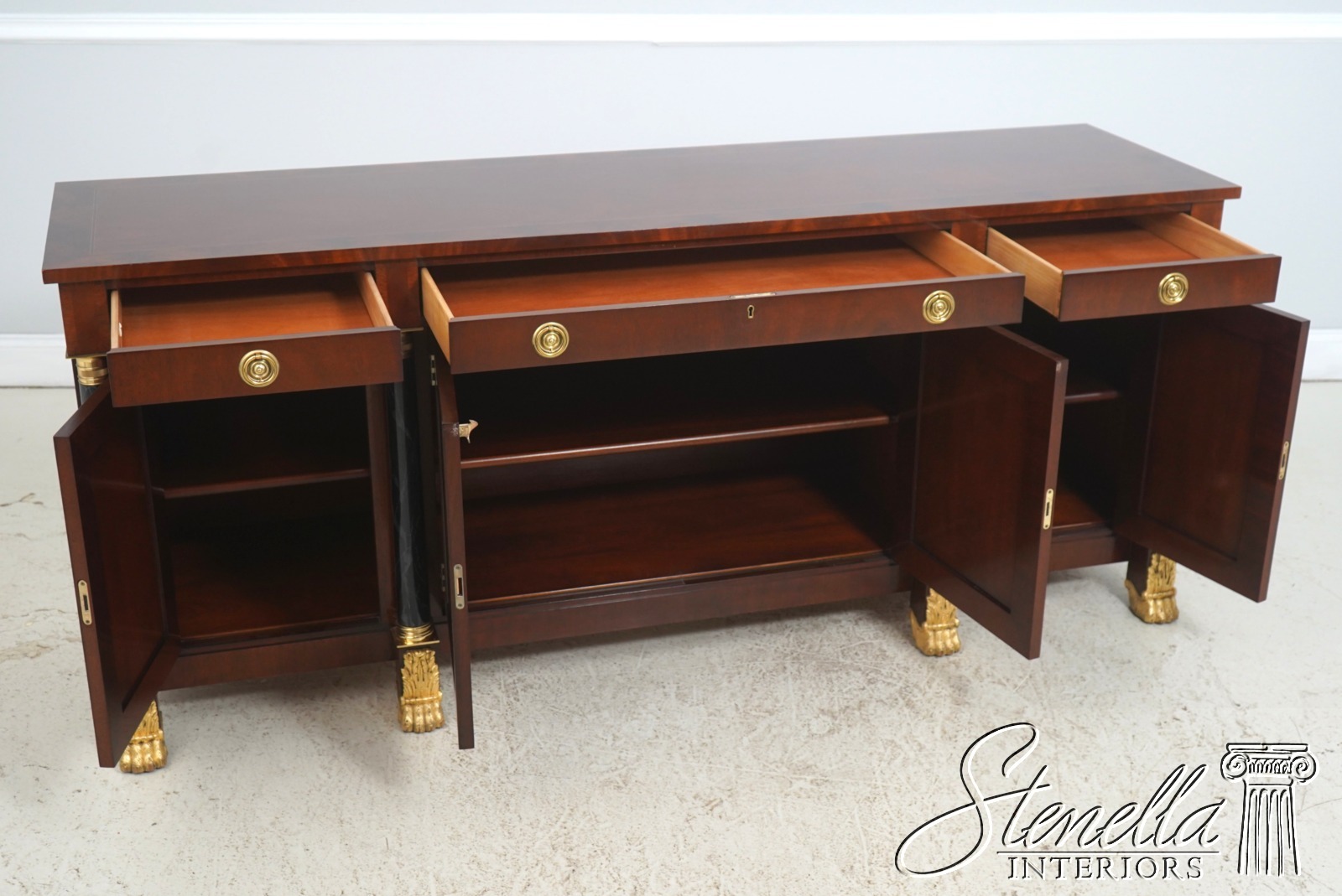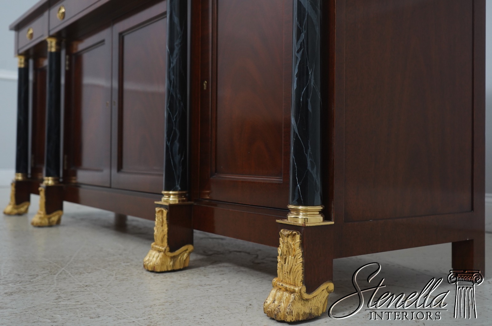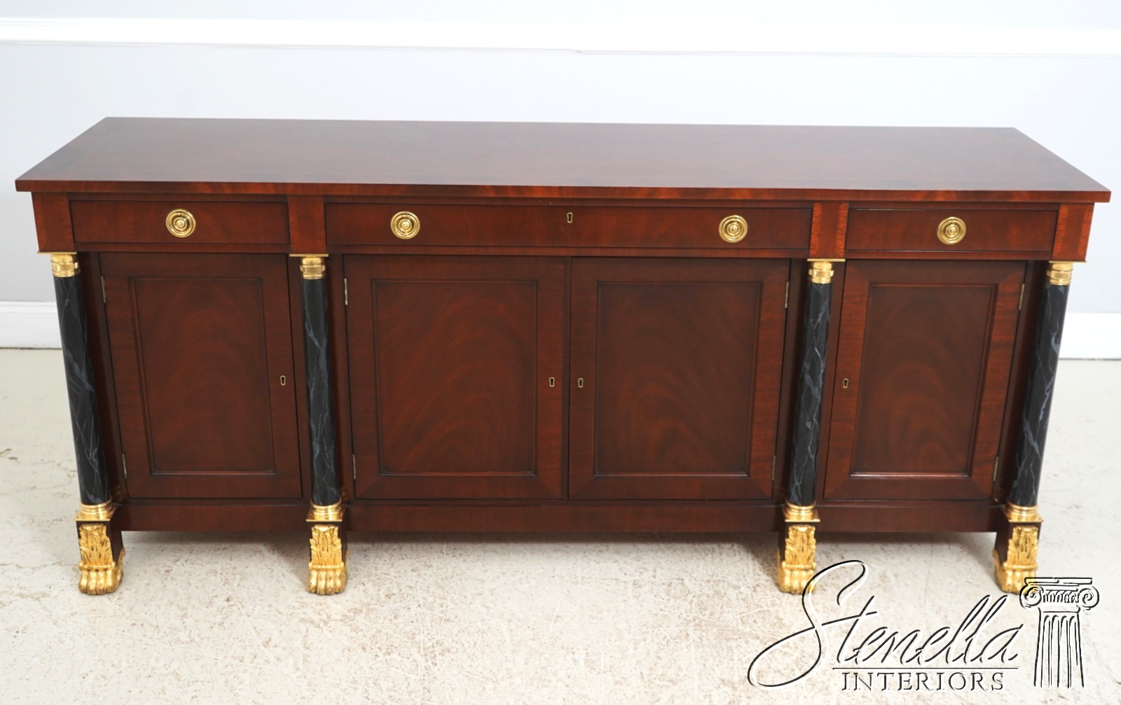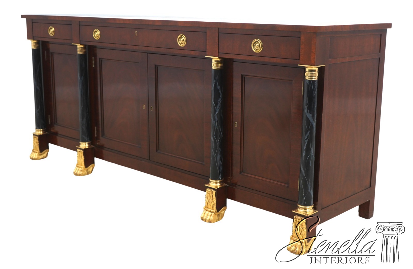 Details: Adjustable Shelves Ball & Claw Feet Dovetailed Drawer Construction High Quality Construction Large Impressive Sideboard Rich High Sheen Finish Traditional Style Solid Brass Hardware High Sheen Polished Finish 4 Faux Marble Columns Gold Gilt Feet Key Locking w. Key Offered @ Fraction Original Retail Cost