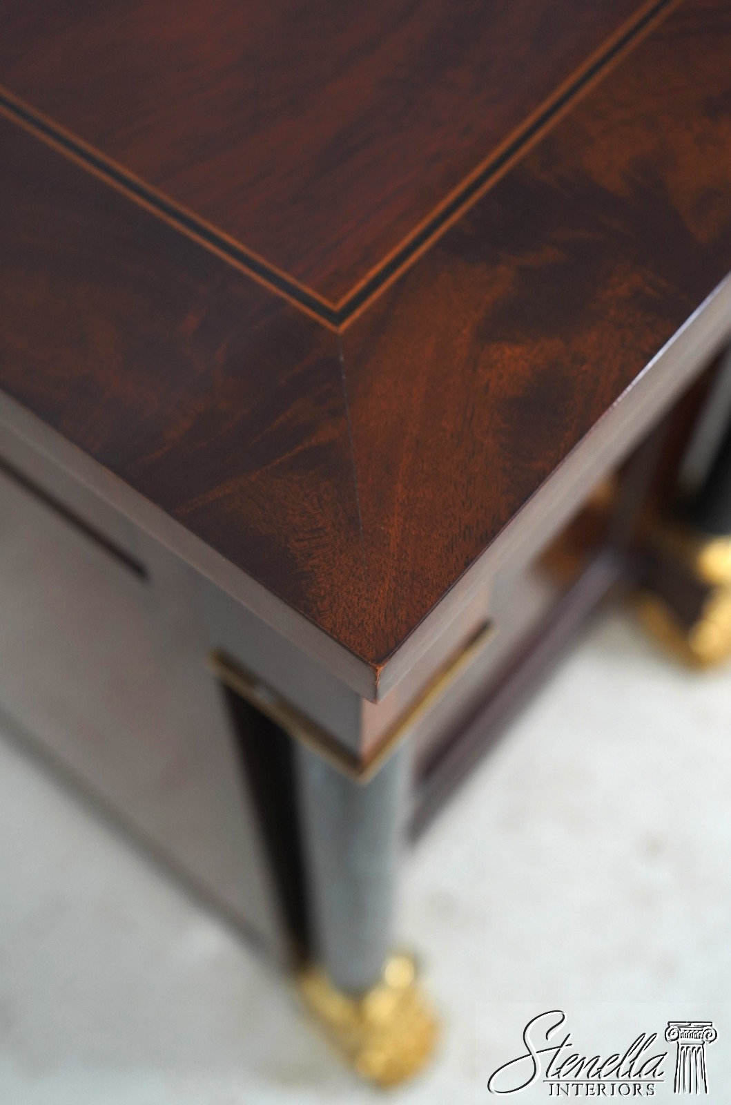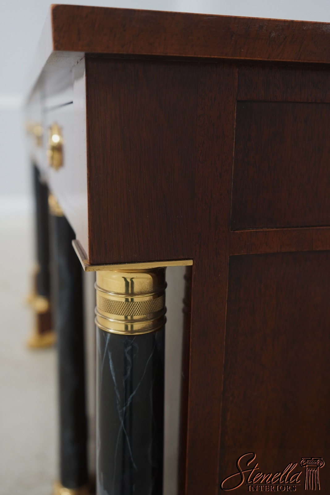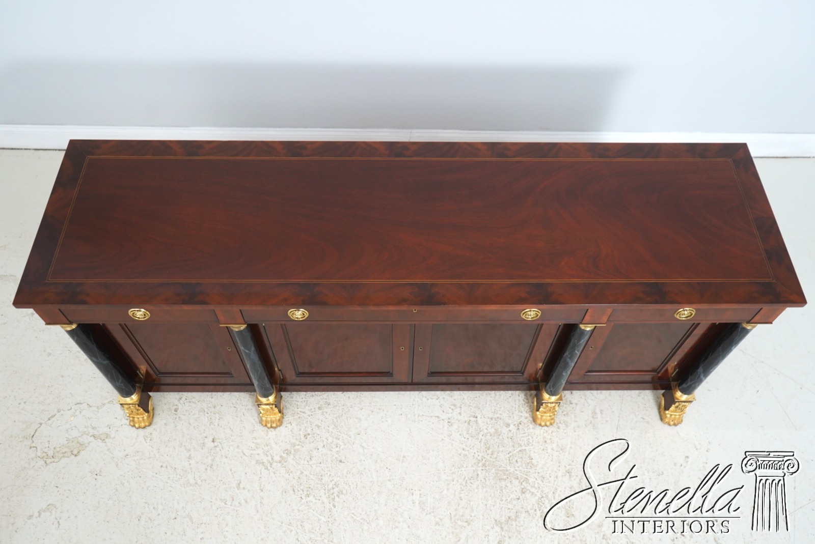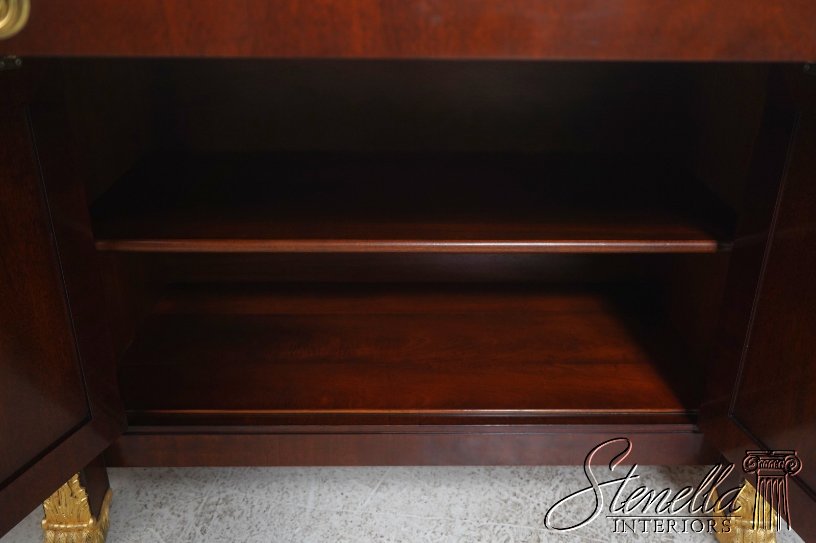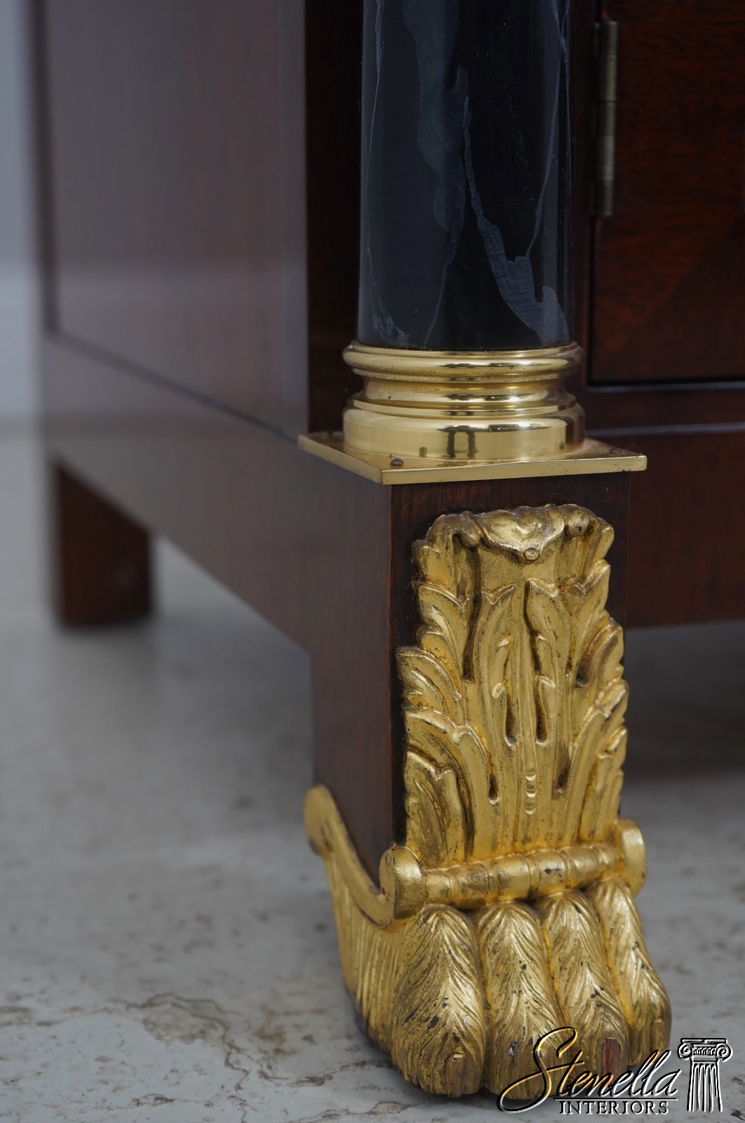 Details: Adjustable Shelves Ball & Claw Feet Dovetailed Drawer Construction High Quality Construction Large Impressive Sideboard Rich High Sheen Finish Traditional Style Solid Brass Hardware High Sheen Polished Finish 4 Faux Marble Columns Gold Gilt Feet Key Locking w. Key Offered @ Fraction Original Retail Cost