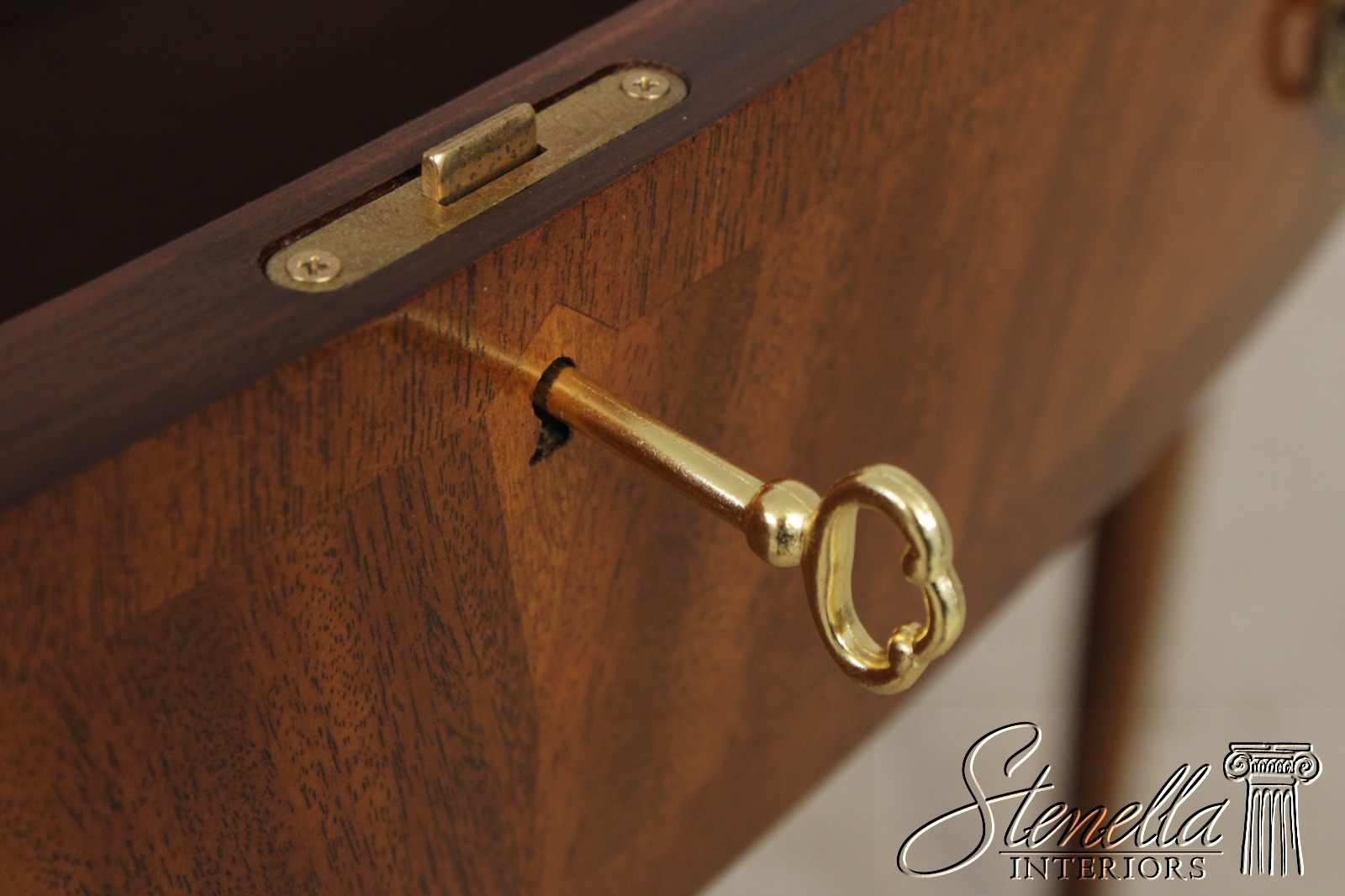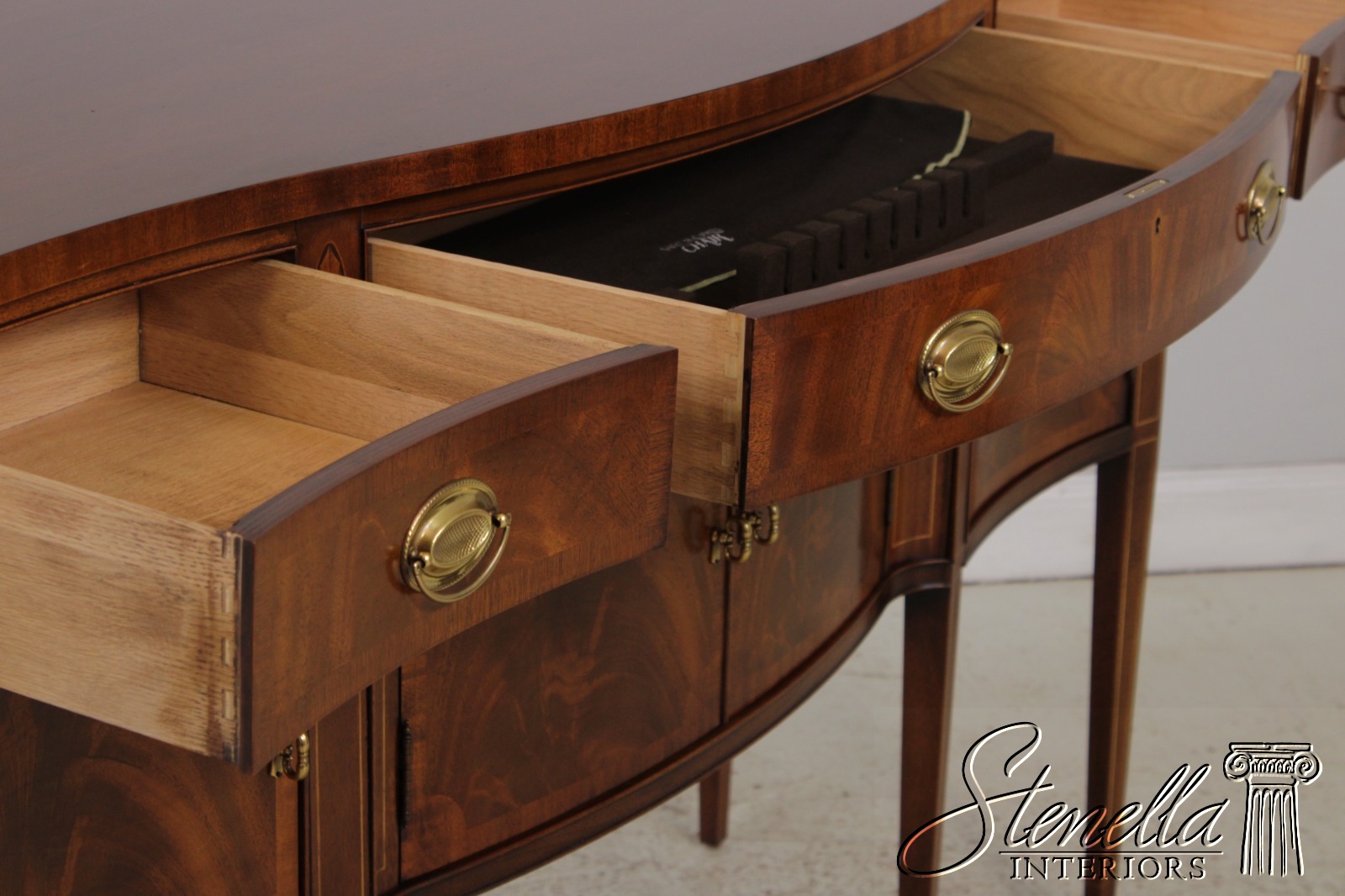 Details: Historic James River Plantation Tall Tapering Legs Mahogany High Quality Construction Figural Mahogany Front Chippendale Style Traditional Style Solid Brass Hardware 3 Drawers, 4 Doors Nice Inlay Work Key Locking w. Key Felt Lined Drawer Offered @ Fraction Original Retail Cost
