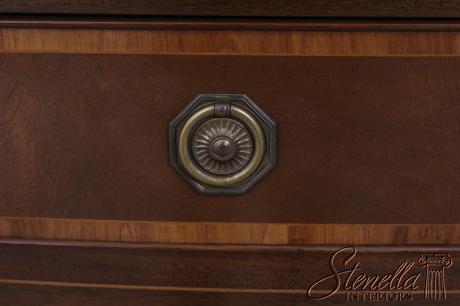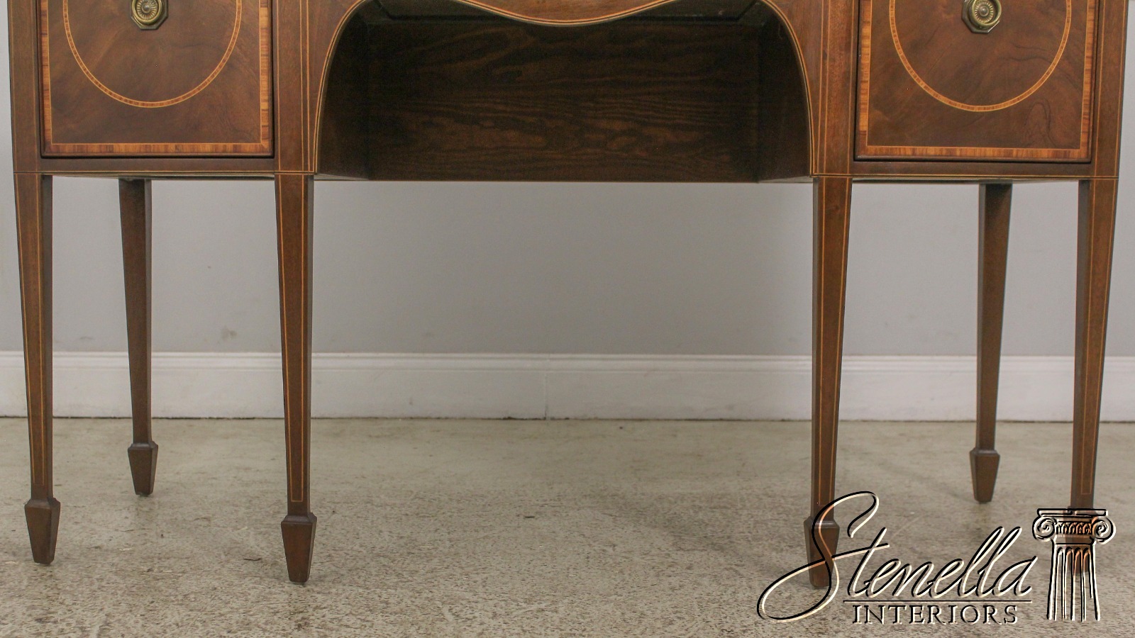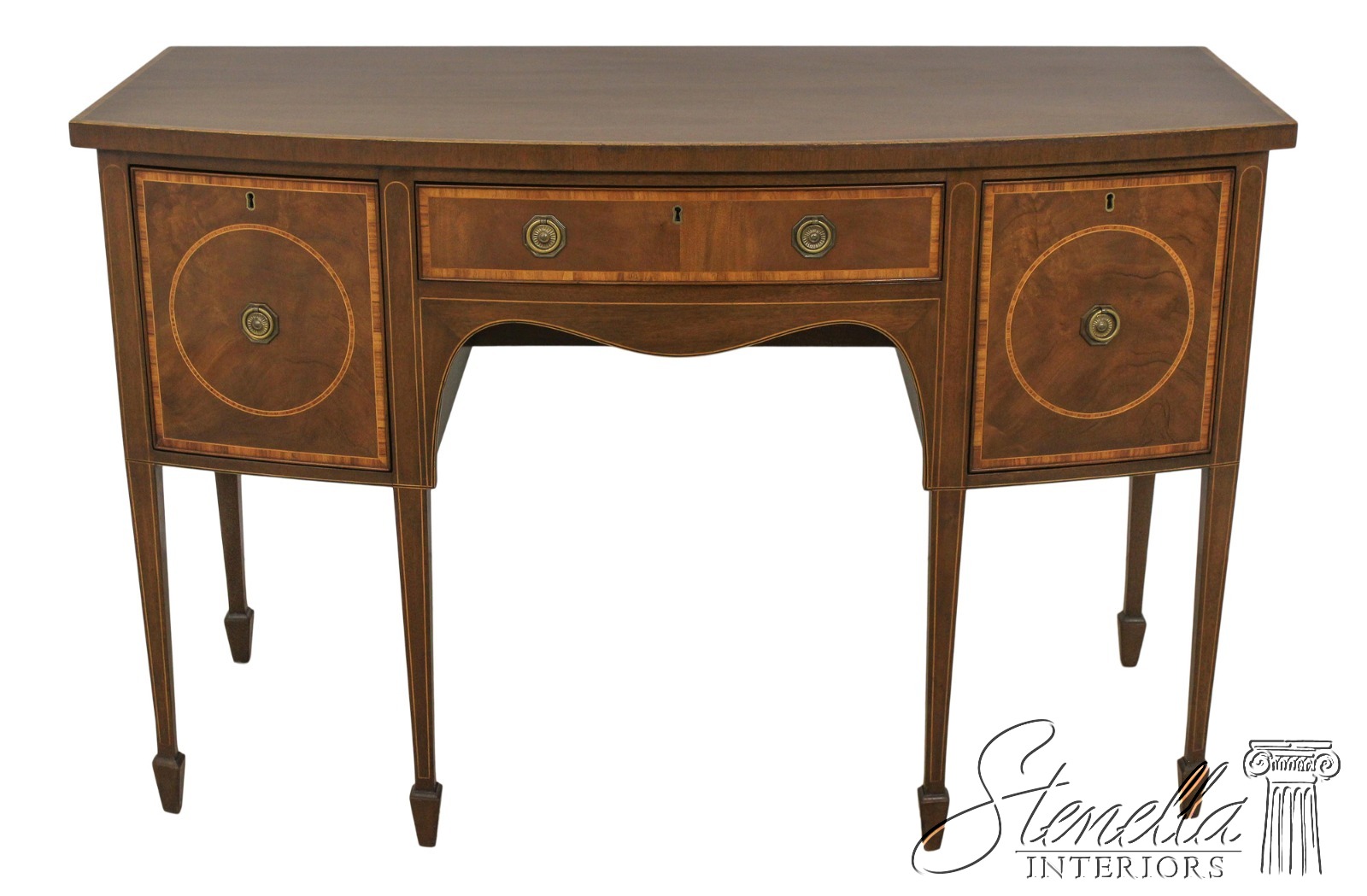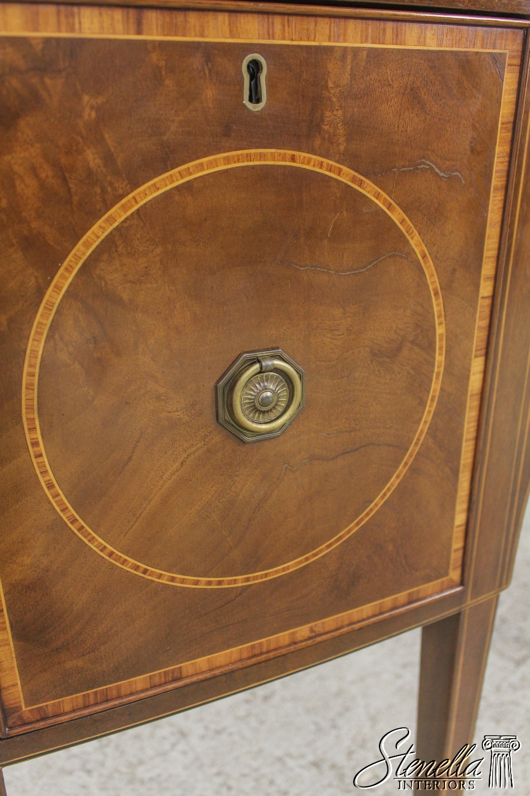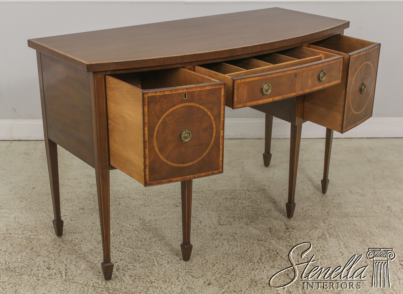 Mahogany with tulipwood and boxwood inlay Center drawer with two doors on each end