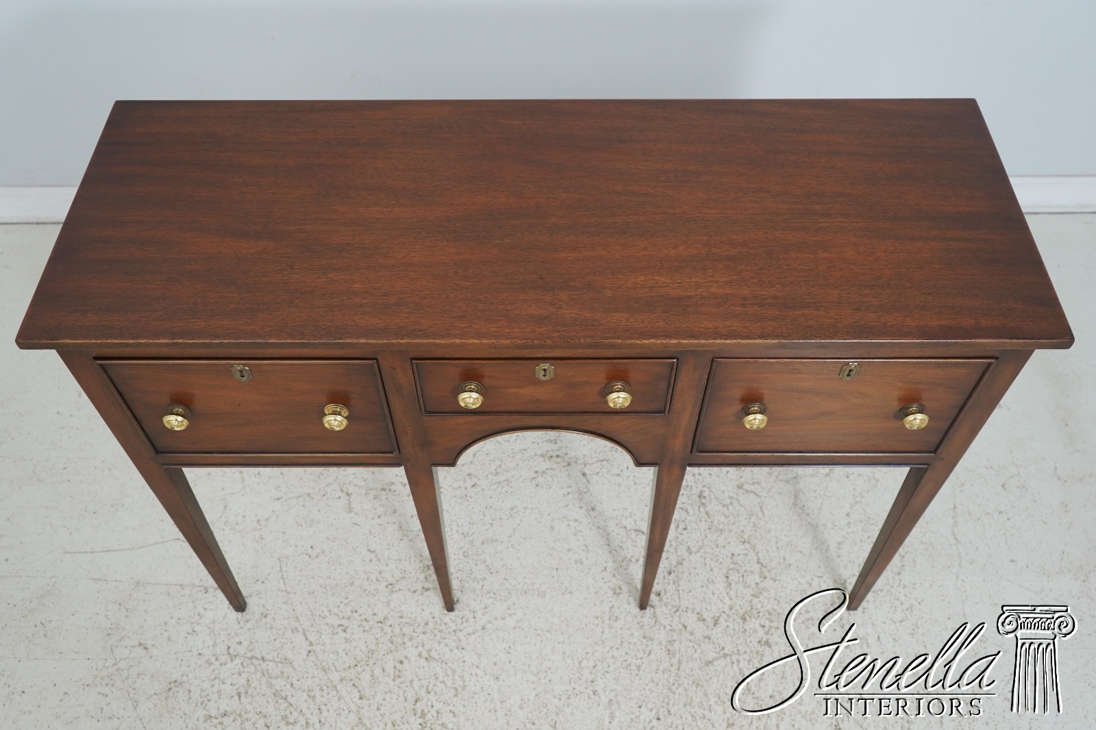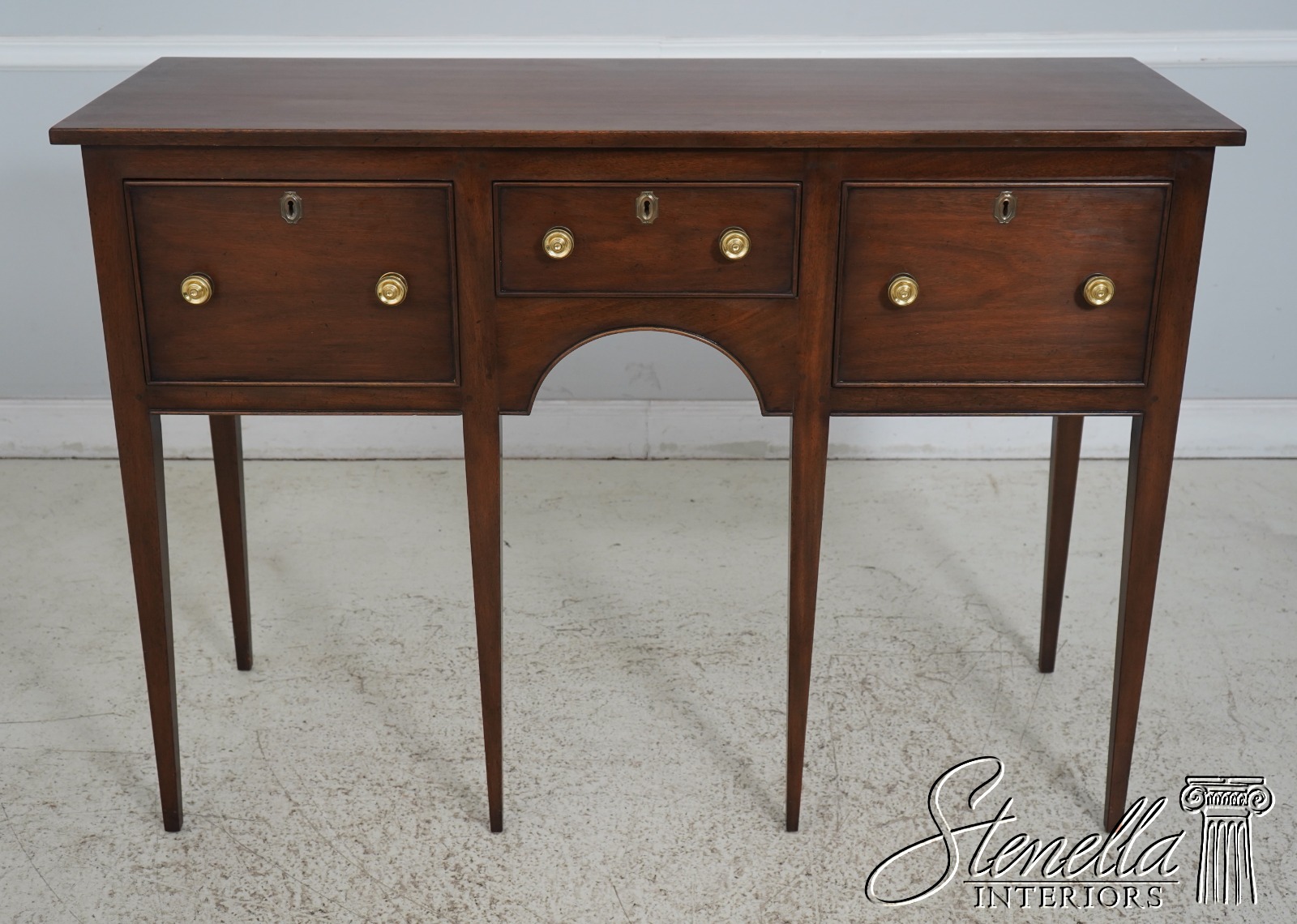 Reproduced from an antique, this compact sideboard has four finely tapered square legs in front and two in the rear. Octagonal key escutcheons and heavy round brass knobs add distinctiveness to a simple and classic design.