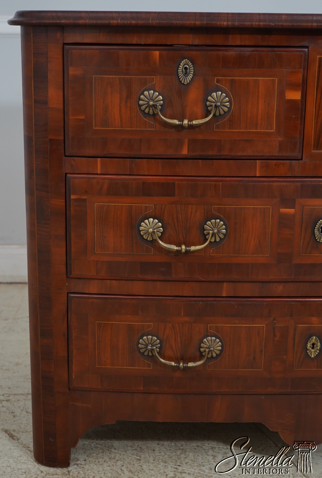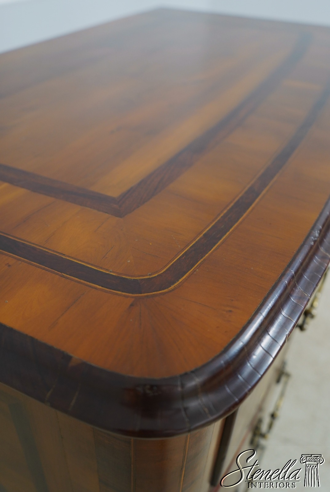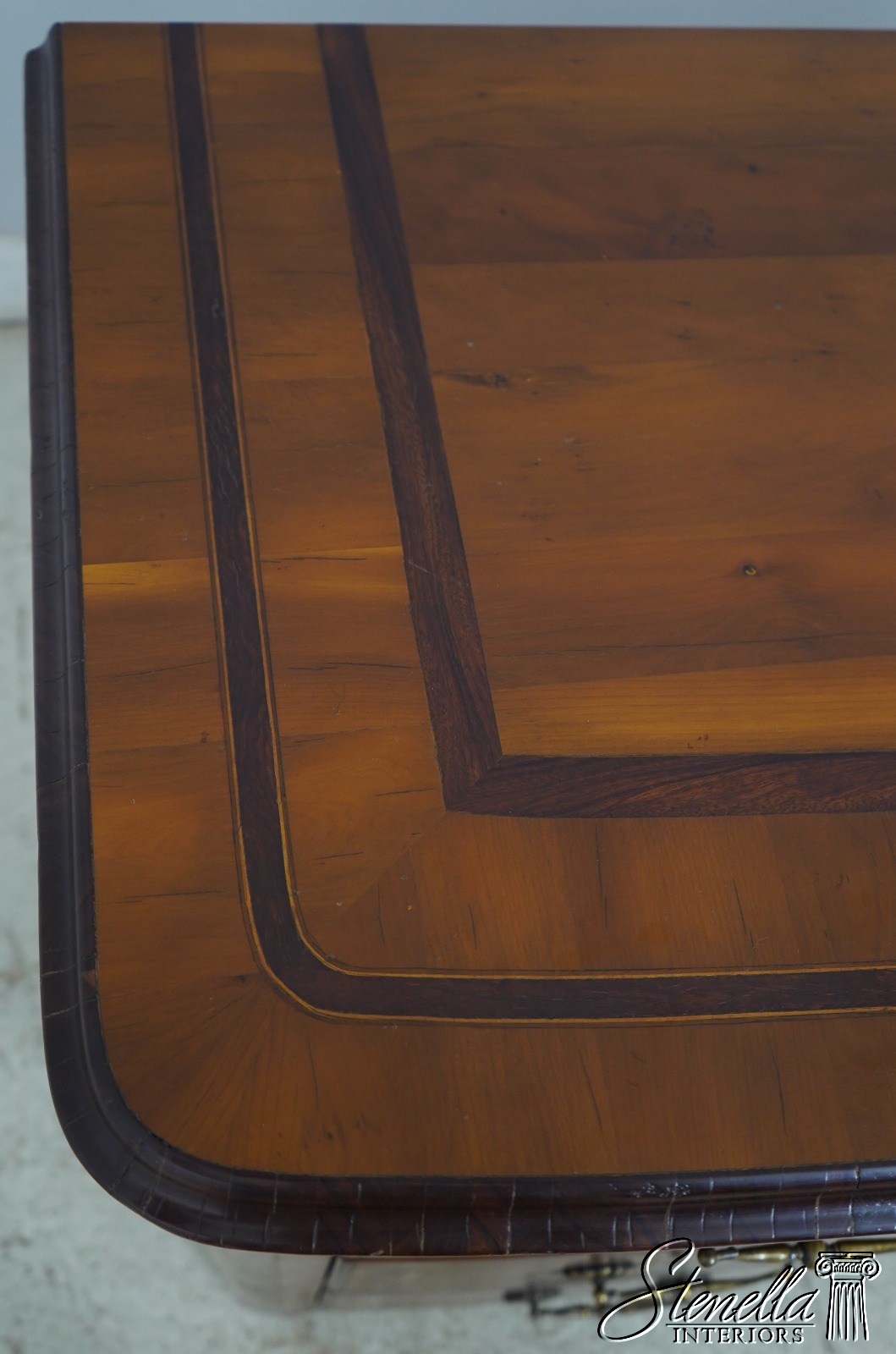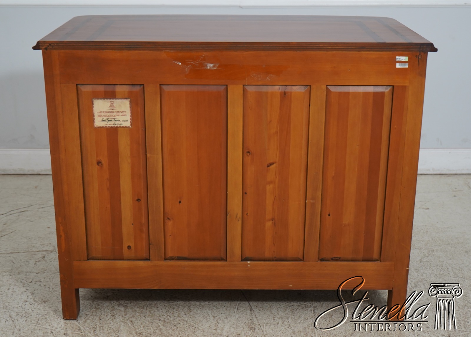 Details: Factory Distressed High Quality Construction Large Impressive Chest Raised Panel Back Stunning Continental Style Commode Chest Italian Style Yew Wood Case w. Inlay Work Throughout Offered @ Fraction Original Retail Cost