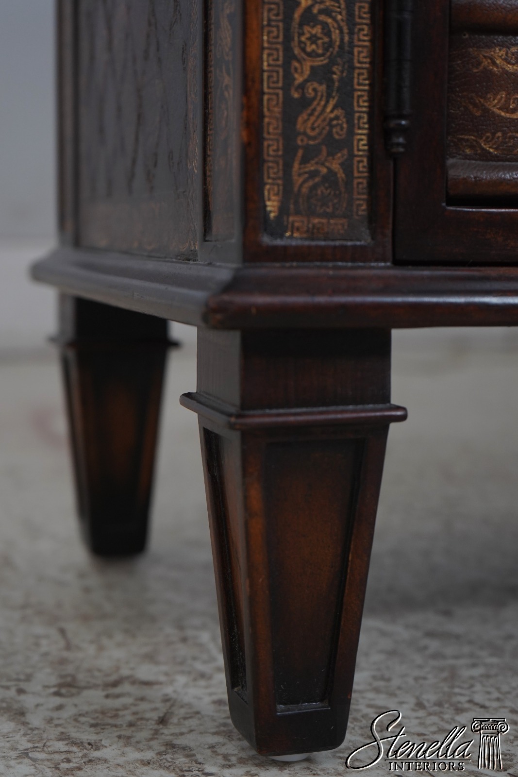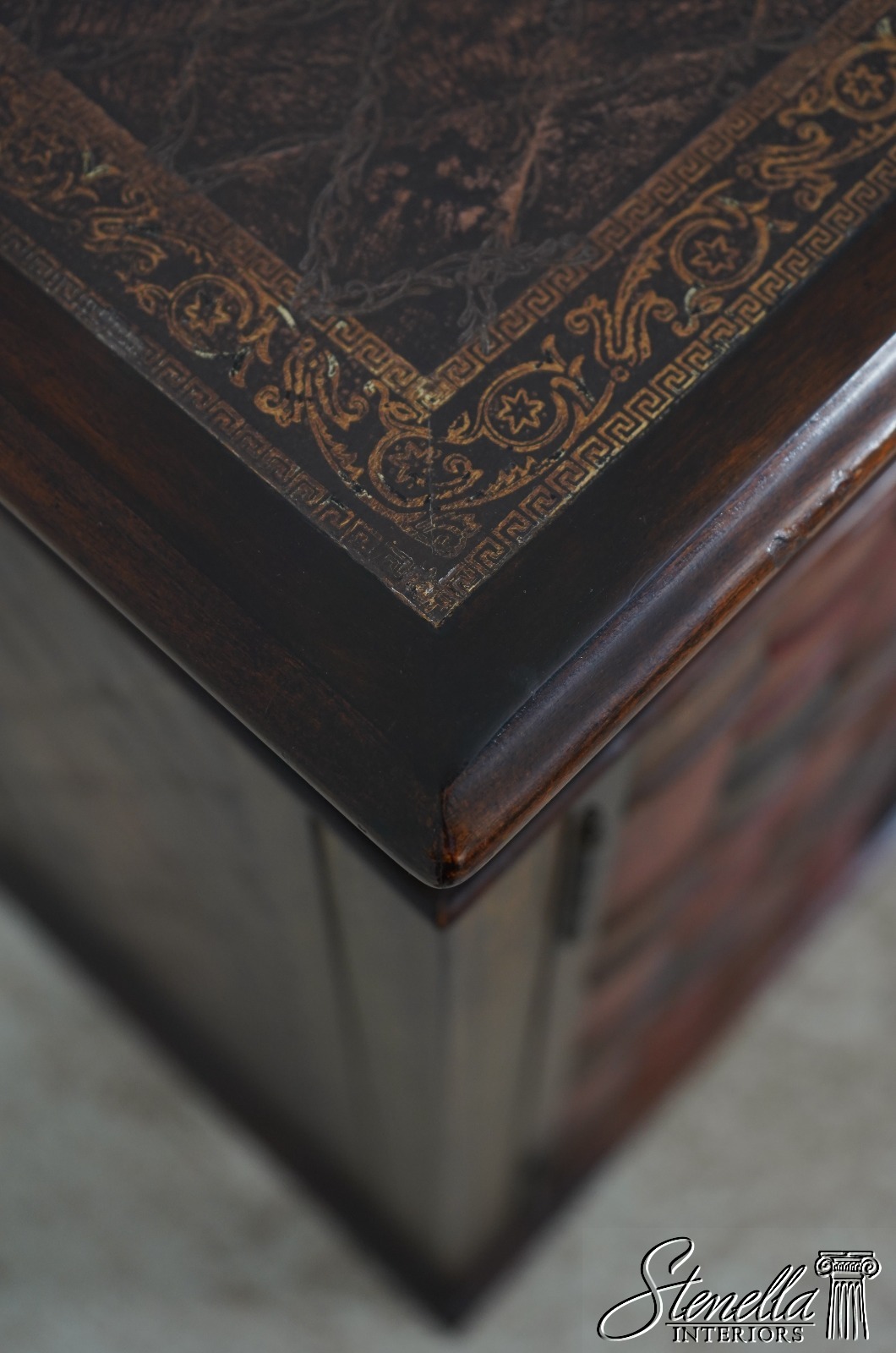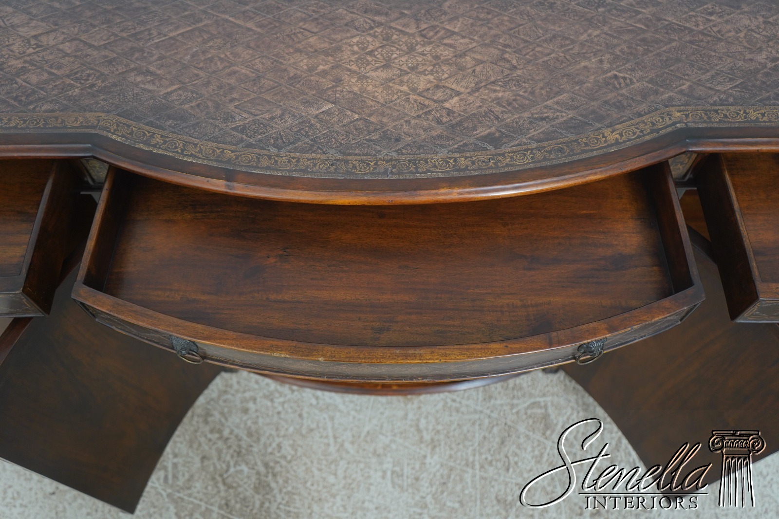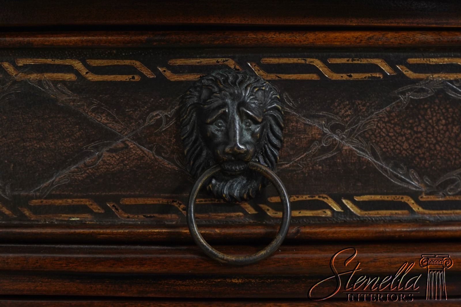 Details: Factory Distressed Model 6133-038 Mahogany Adjustable Shelves Dovetailed Drawer Construction Quality Construction Nice Tooled Leather Top Quality Tooled Leather Lion Head Pulls Solid Brass Hardware Un-Marked As To Manufacture Offered @ Fraction Original Retail Cost