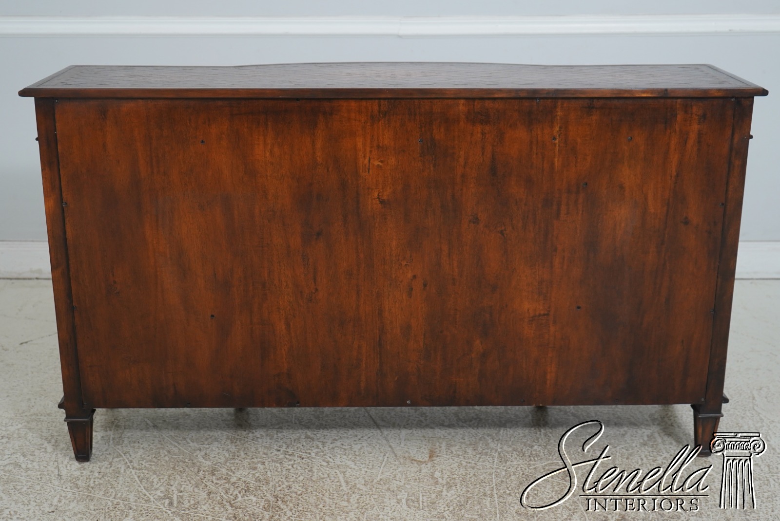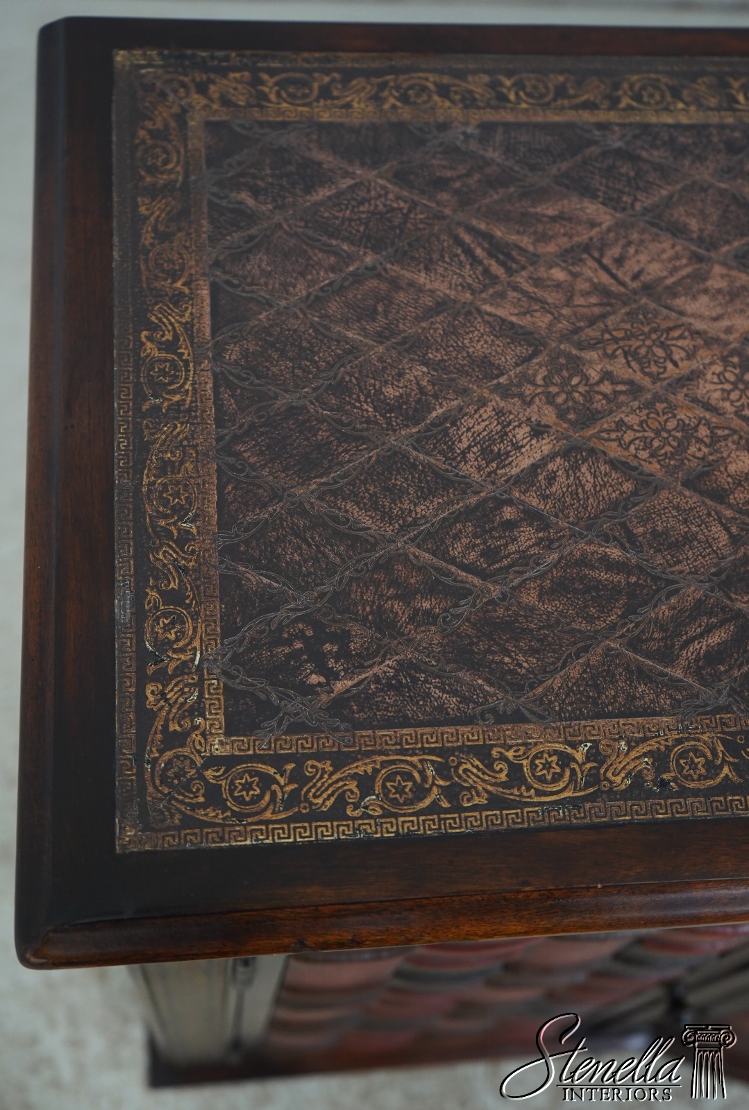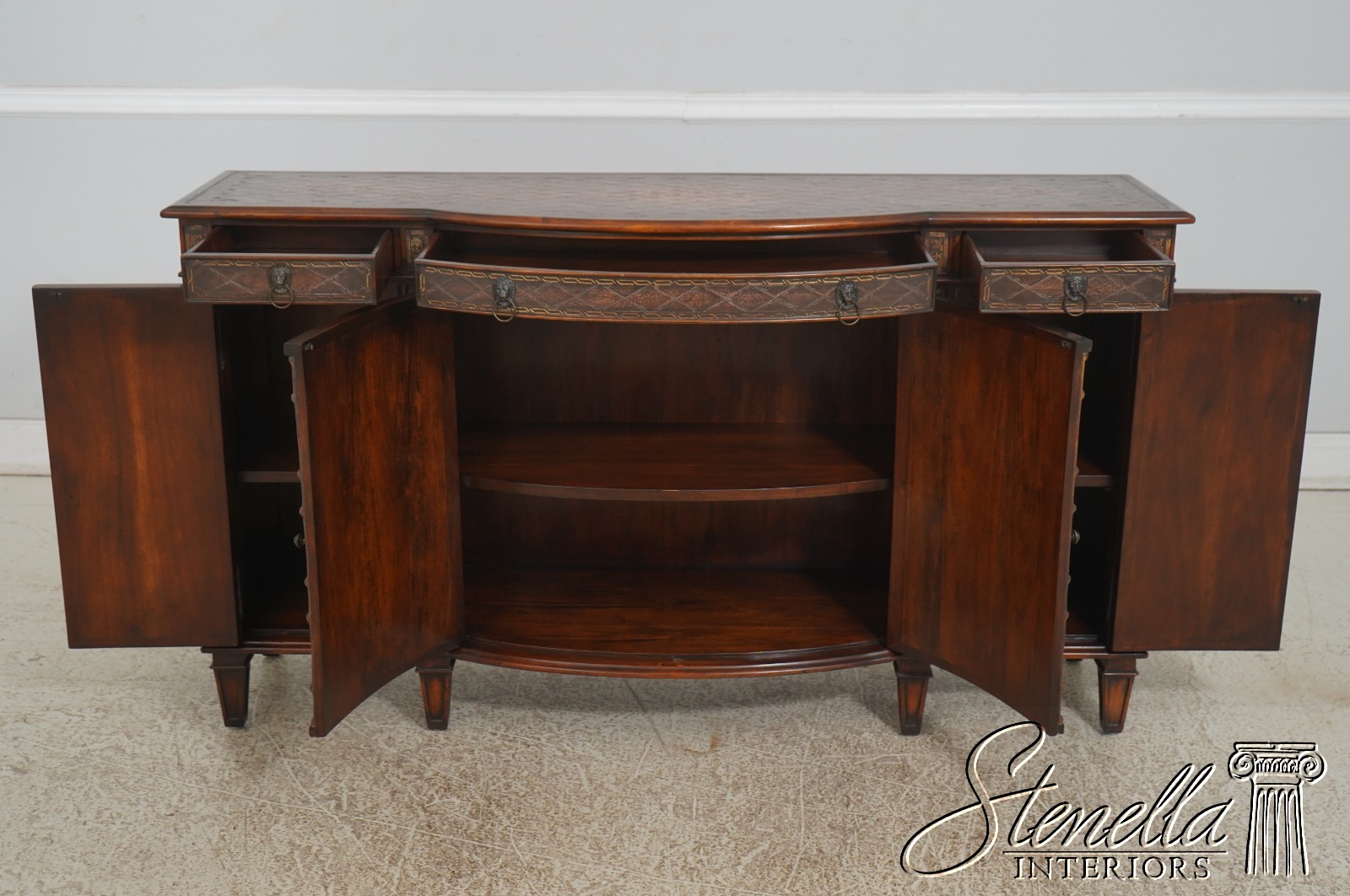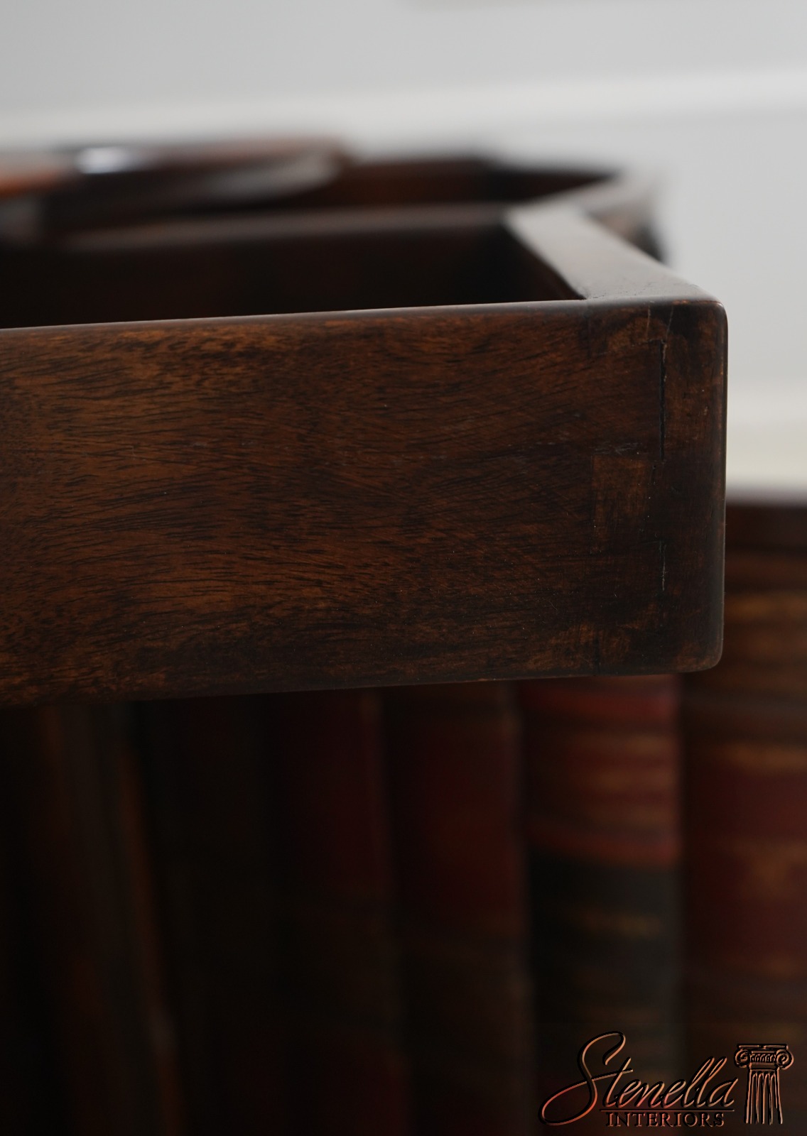 Details: Factory Distressed Model 6133-038 Mahogany Adjustable Shelves Dovetailed Drawer Construction Quality Construction Nice Tooled Leather Top Quality Tooled Leather Lion Head Pulls Solid Brass Hardware Un-Marked As To Manufacture Offered @ Fraction Original Retail Cost