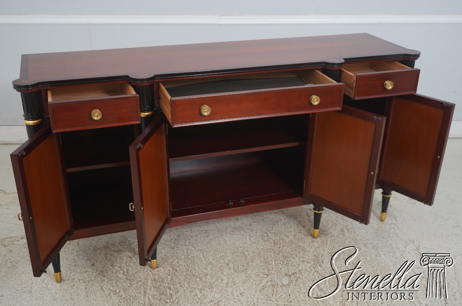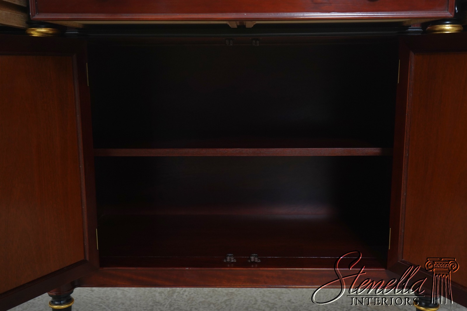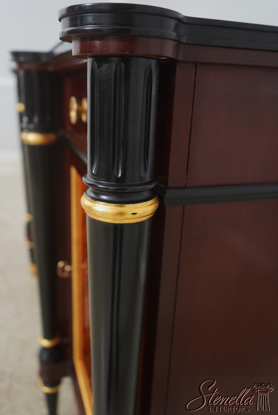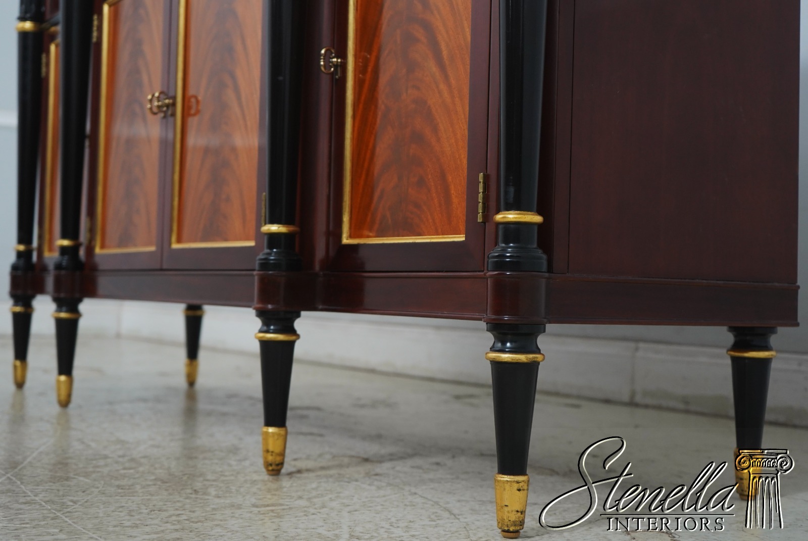 Details: John Widdicomb By Stickley Dovetailed Drawer Construction High Quality Construction Brass Hardware Felt Lined Silverware Drawer Ebonized & Gold Details Regency Style Gorgeous Figural Mahogany Door Fronts Offered @ Fraction Original Retail Cost