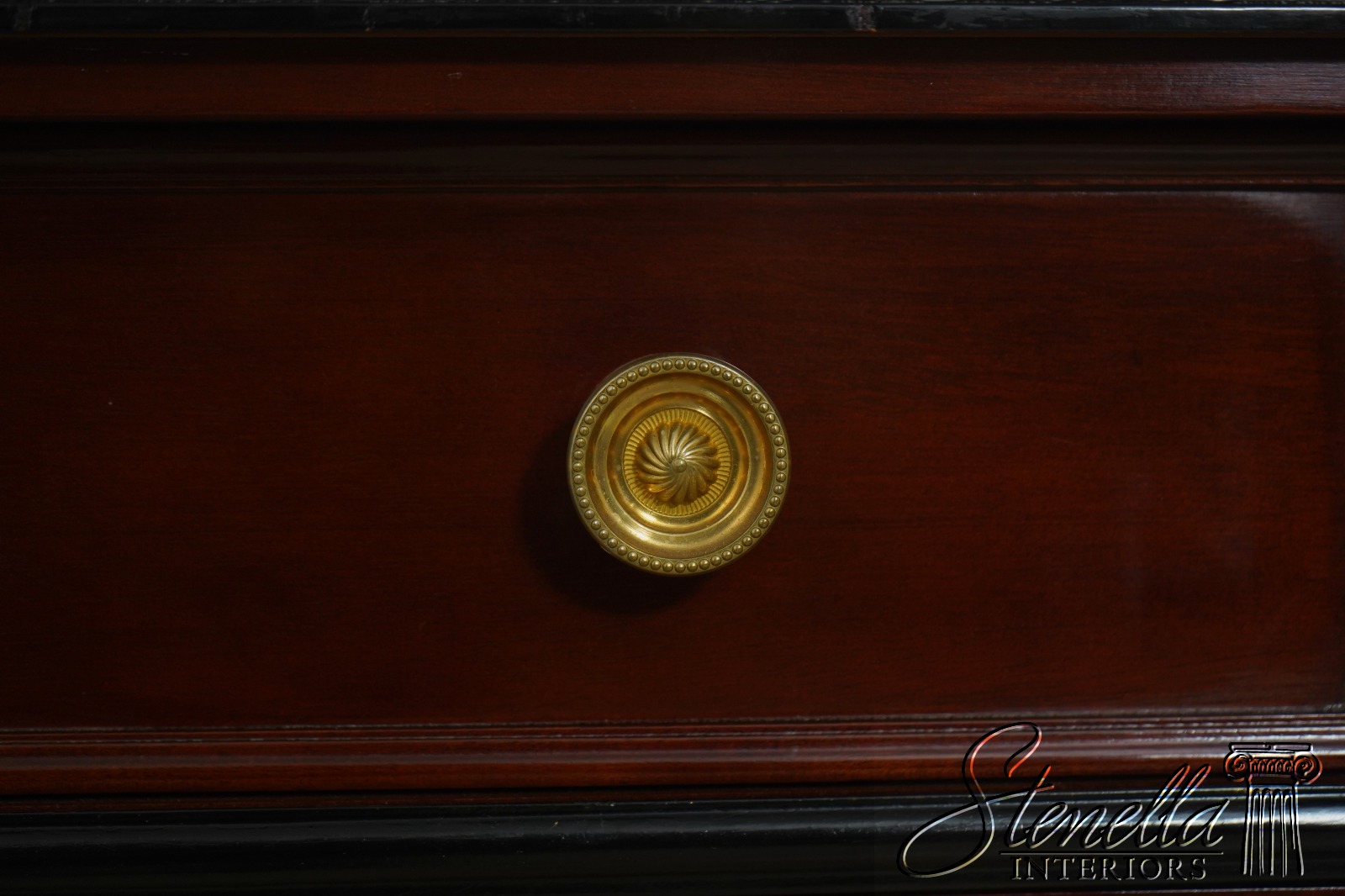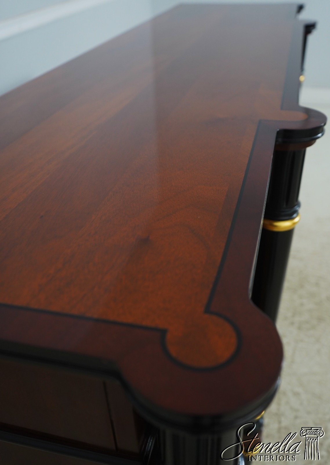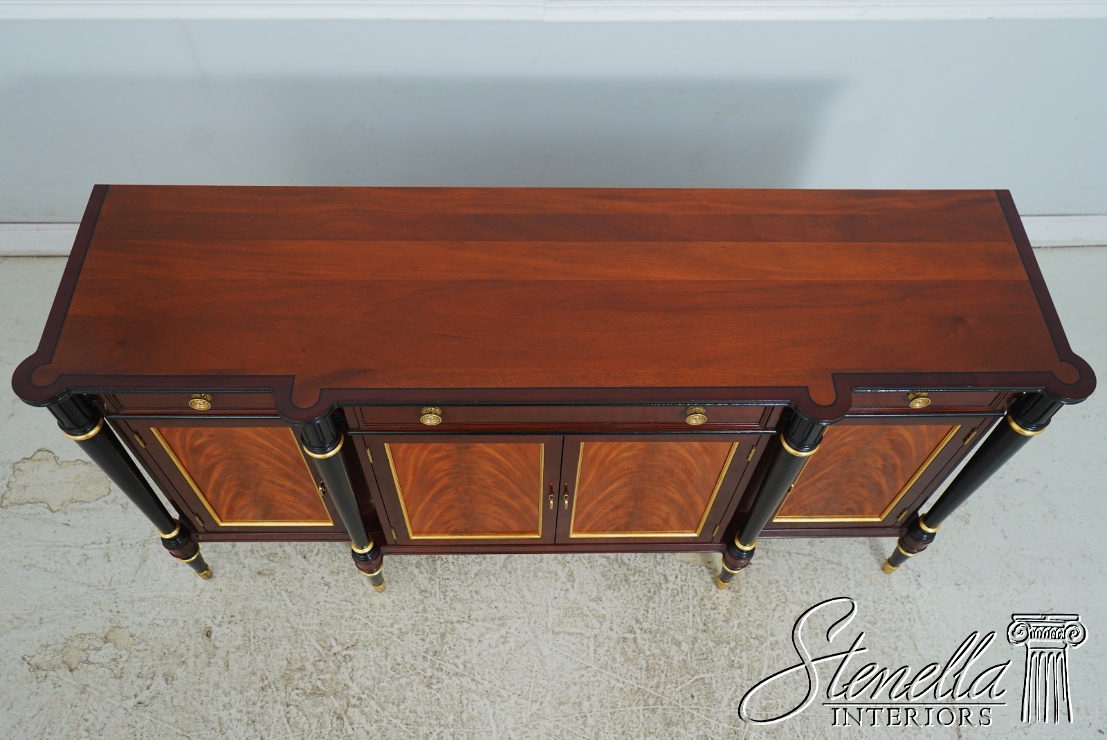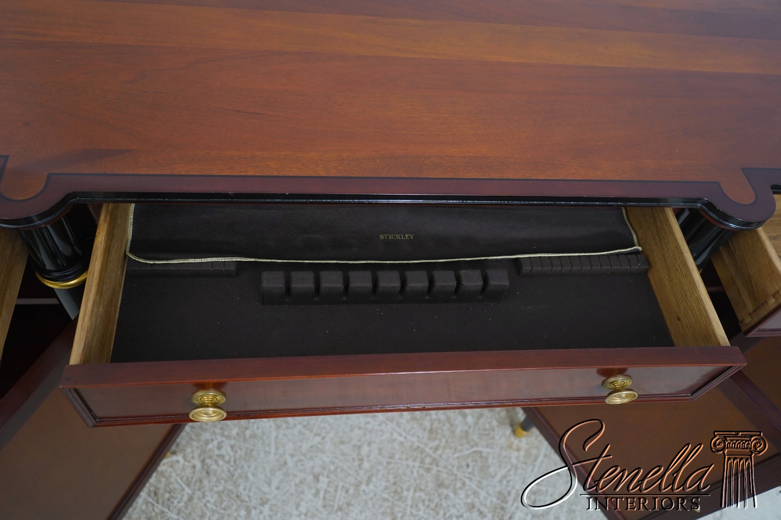 Details: John Widdicomb By Stickley Dovetailed Drawer Construction High Quality Construction Brass Hardware Felt Lined Silverware Drawer Ebonized & Gold Details Regency Style Gorgeous Figural Mahogany Door Fronts Offered @ Fraction Original Retail Cost