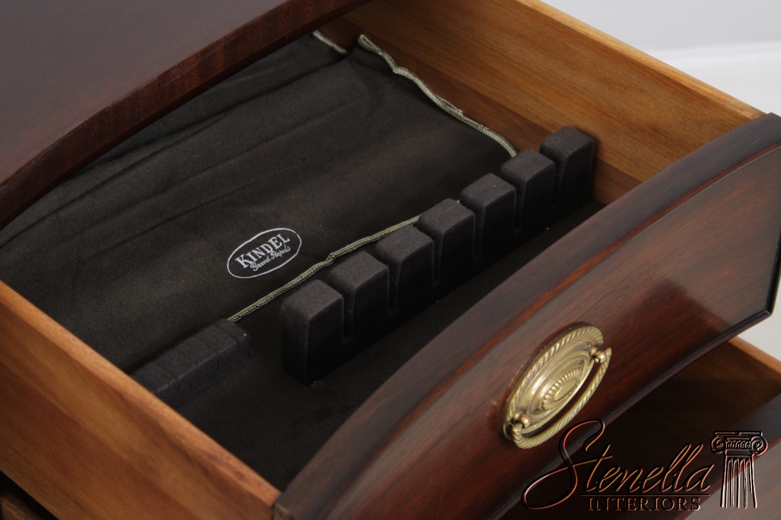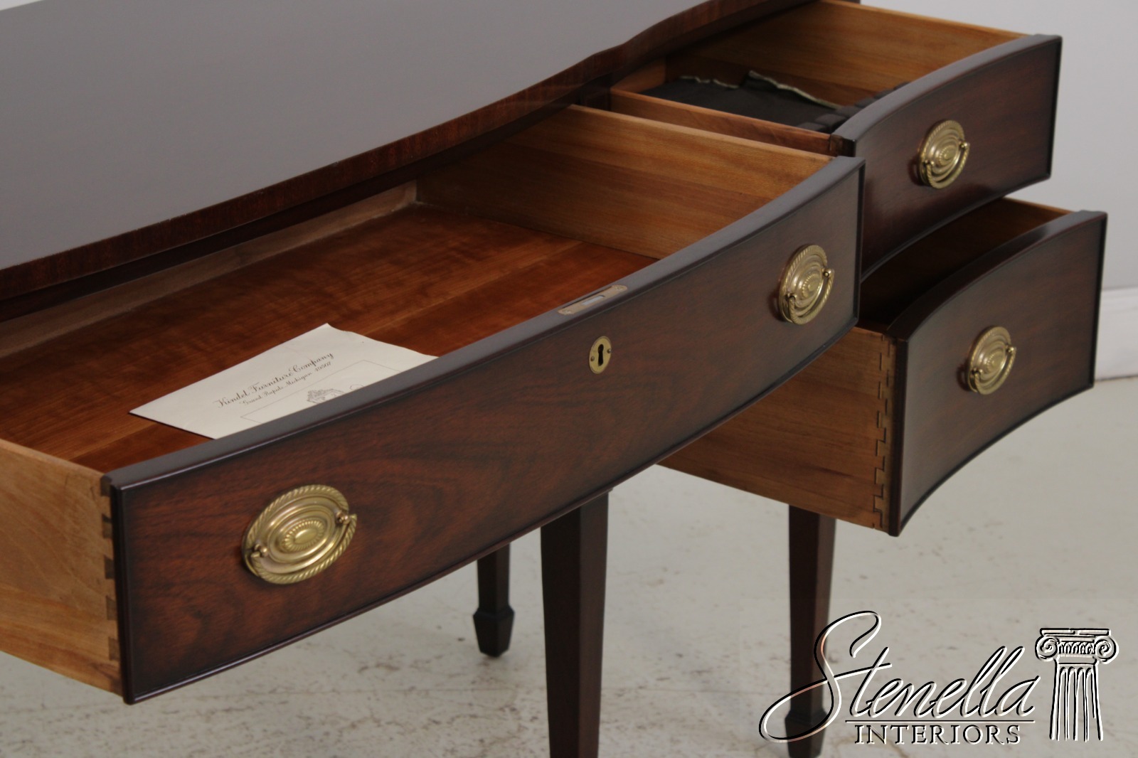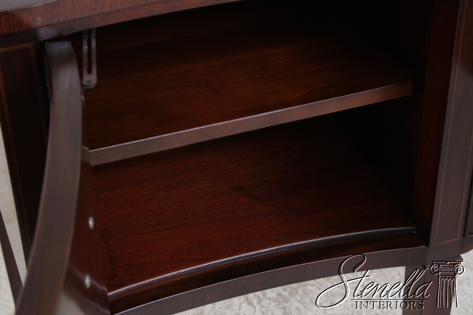Details: Oxford Finish Ornate Carved Legs Mahogany Adjustable Shelves Dovetailed Drawer Construction High Quality Construction Rich High Sheen Finish Federal Style Traditional Style Solid Brass Hardware Curved Front Quality Tooled Leather Top Felt Lined Draw Key Locking With Key Three Drawers And One Door Offered At A Fraction Of The Original Retail Cost
