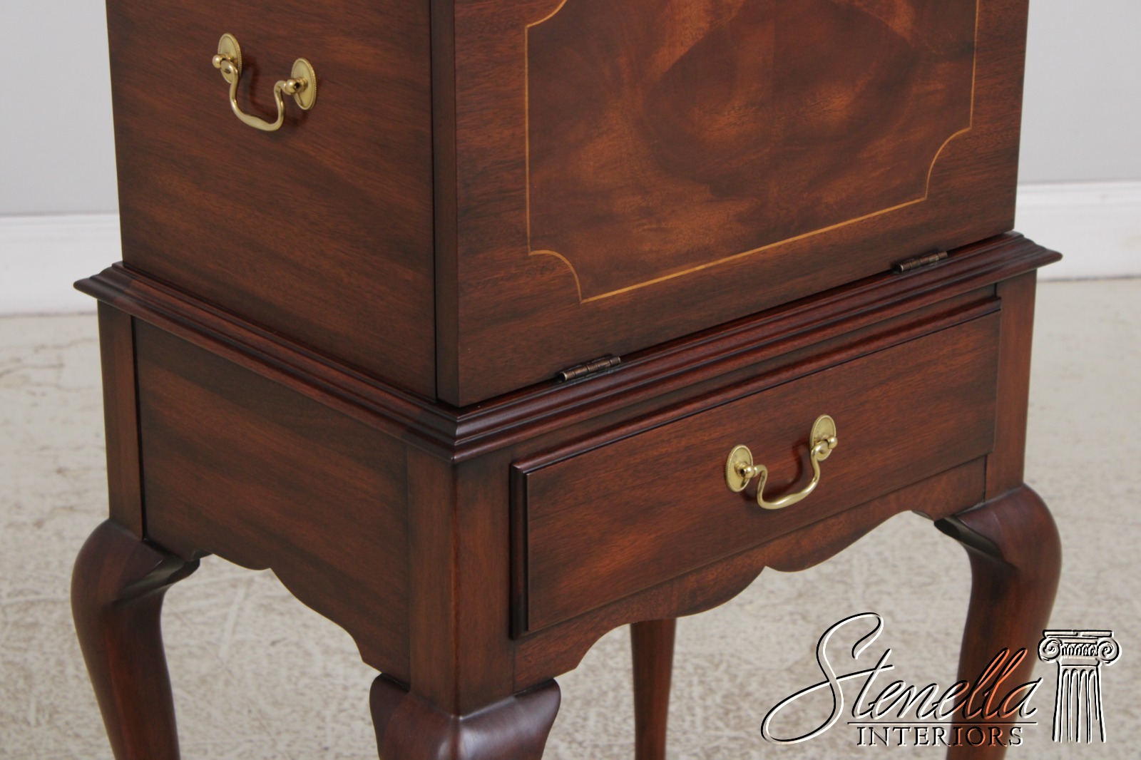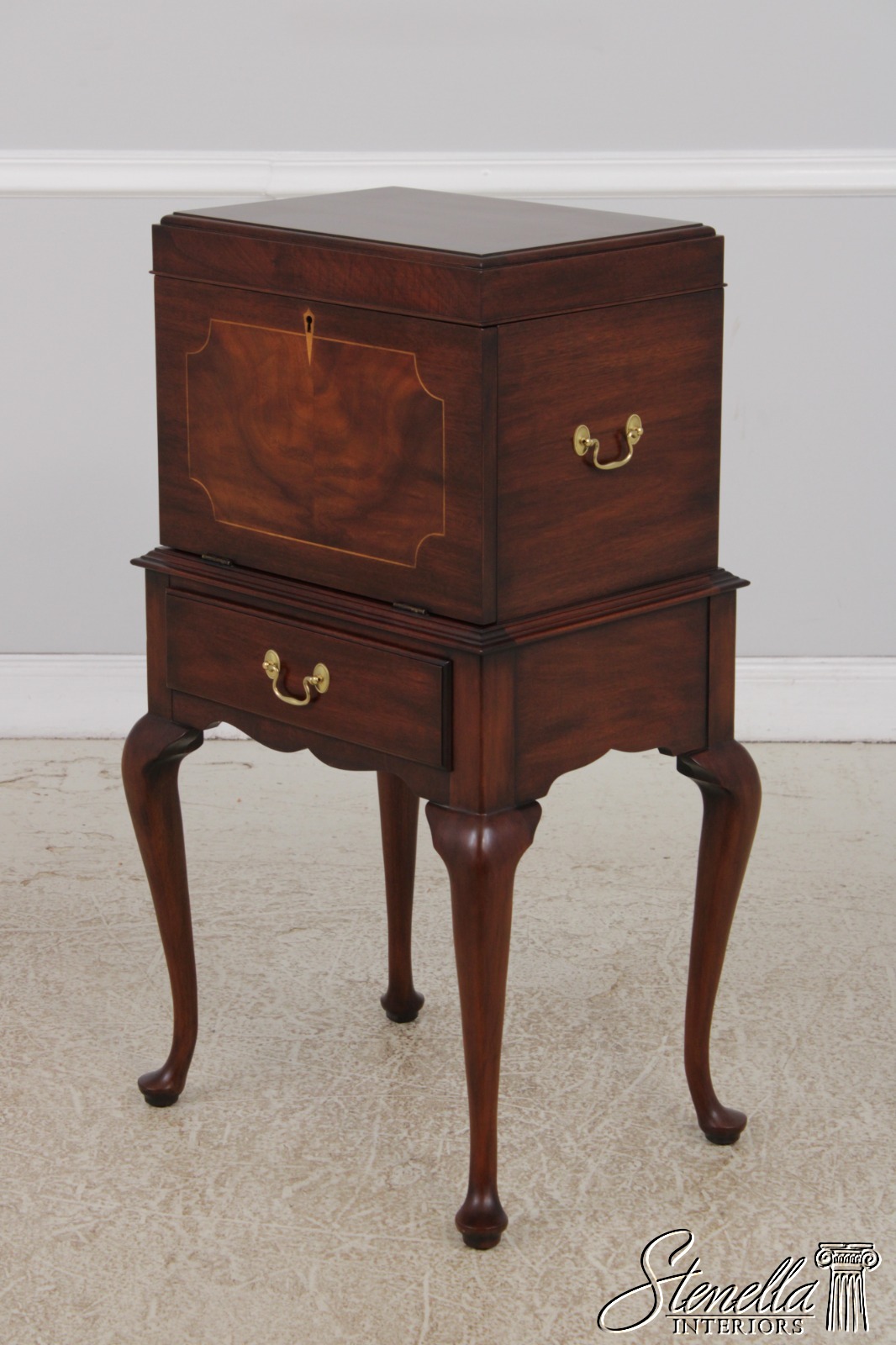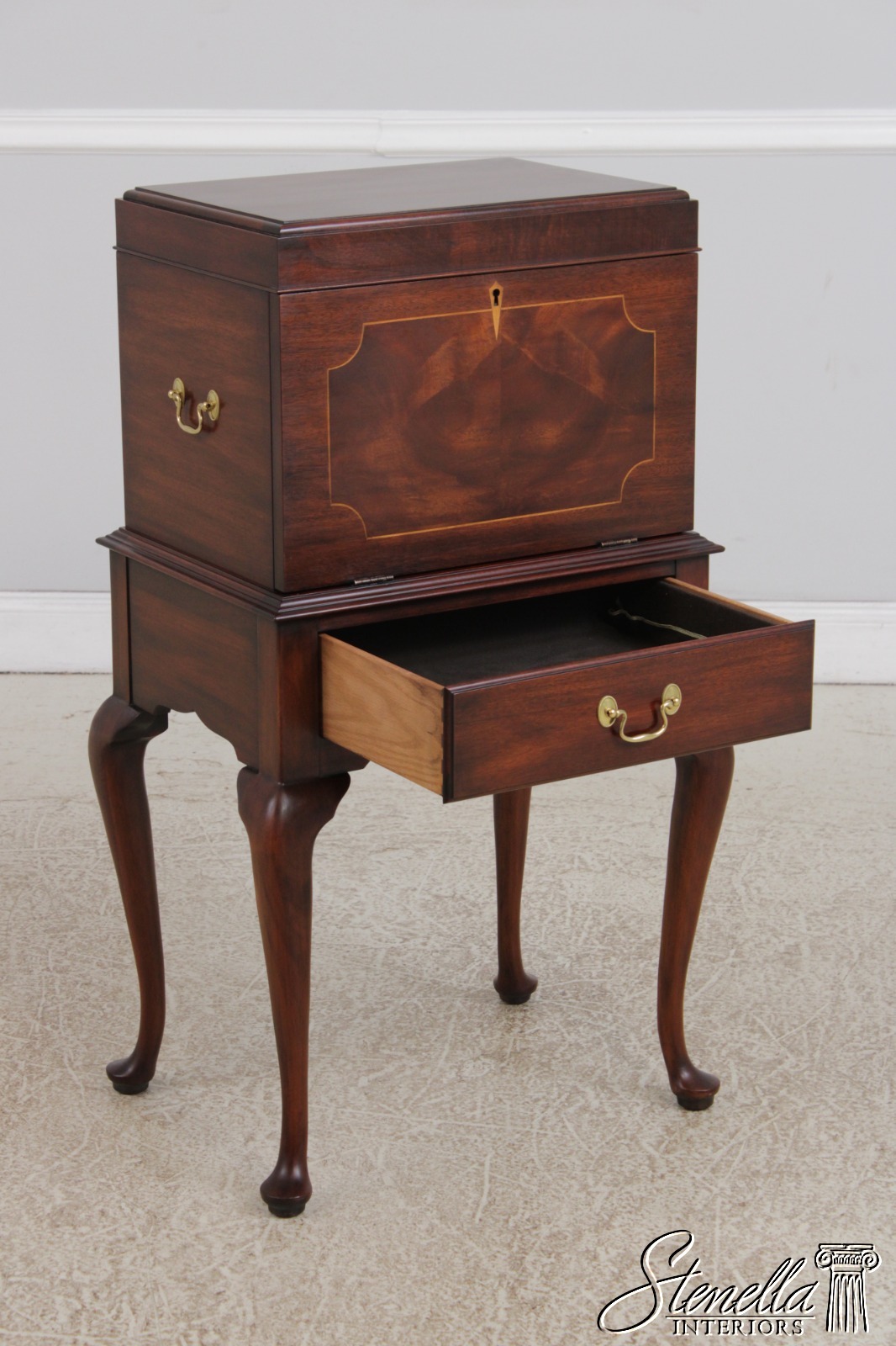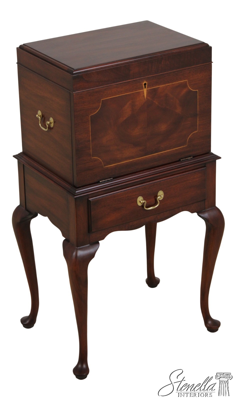 Details: Finish No.29 Felt Lined Interior High Quality Construction Queen Anne Legs & Pad Feet Figural Mahogany Fall Front Traditional Style Solid Brass Hardware Removable Serving Tray
