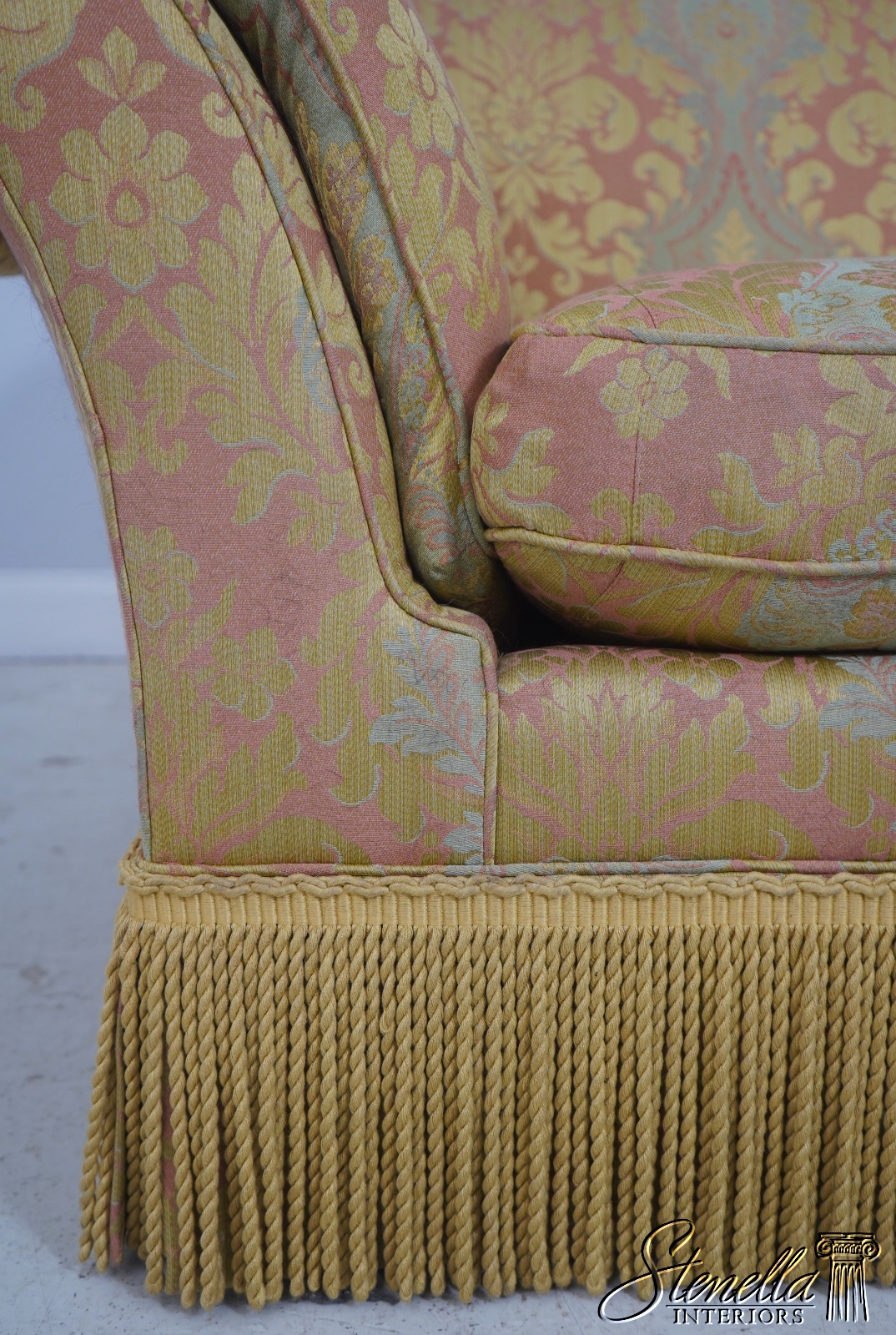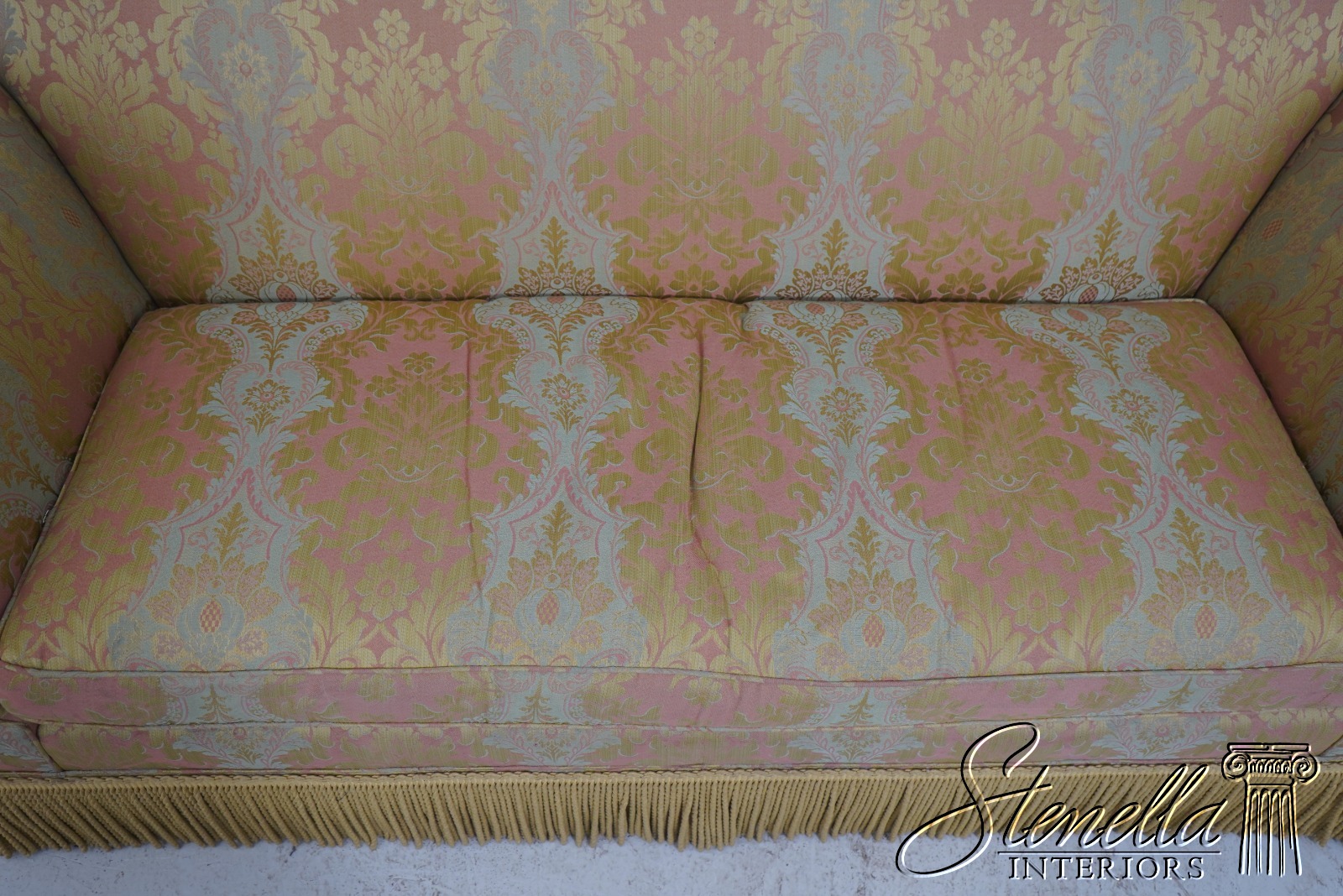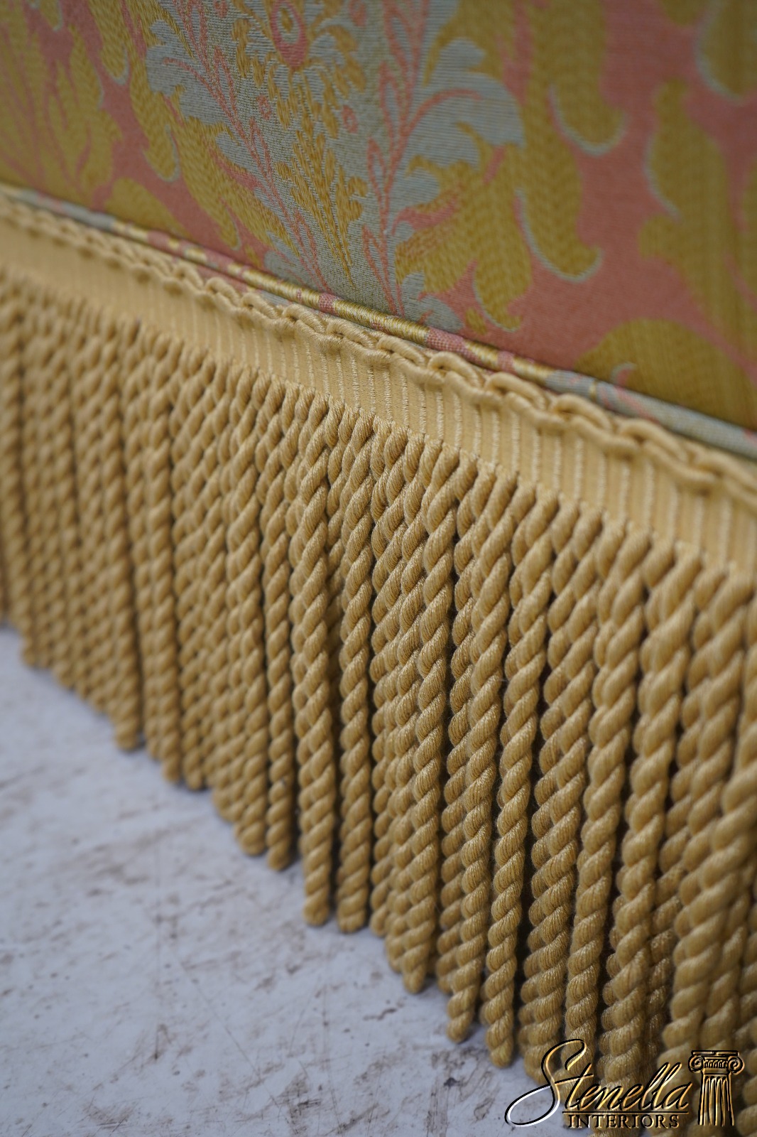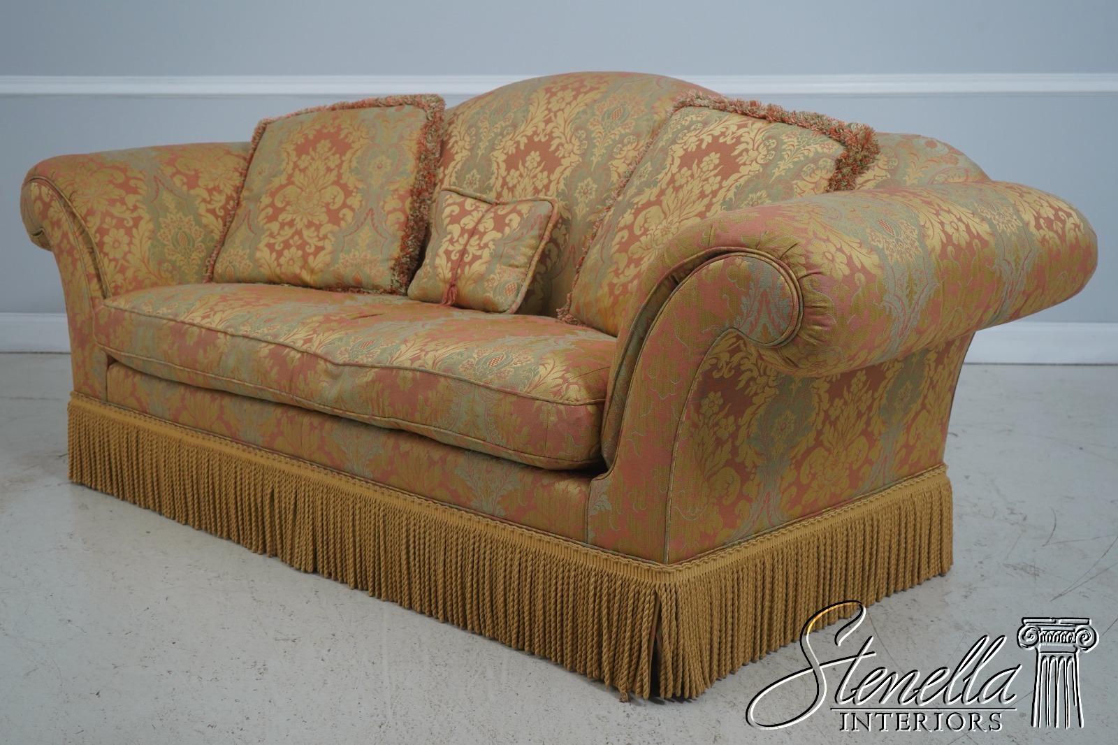 71654: BAKER Damask Upholstered Sofa w. Bullion Fringe