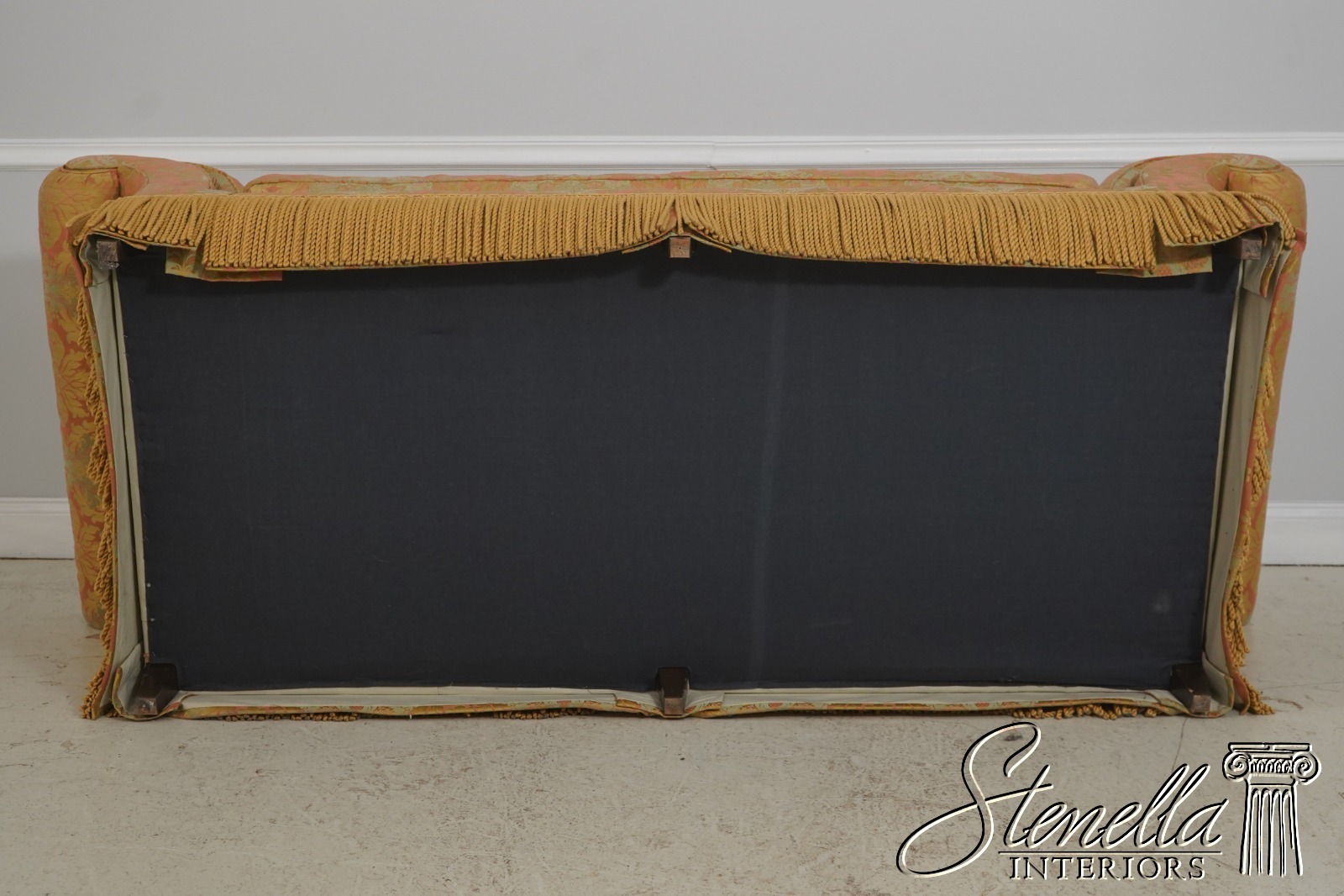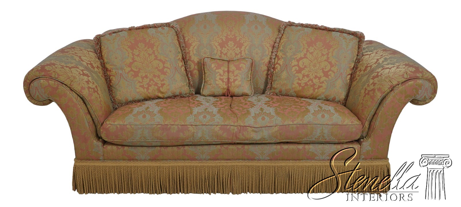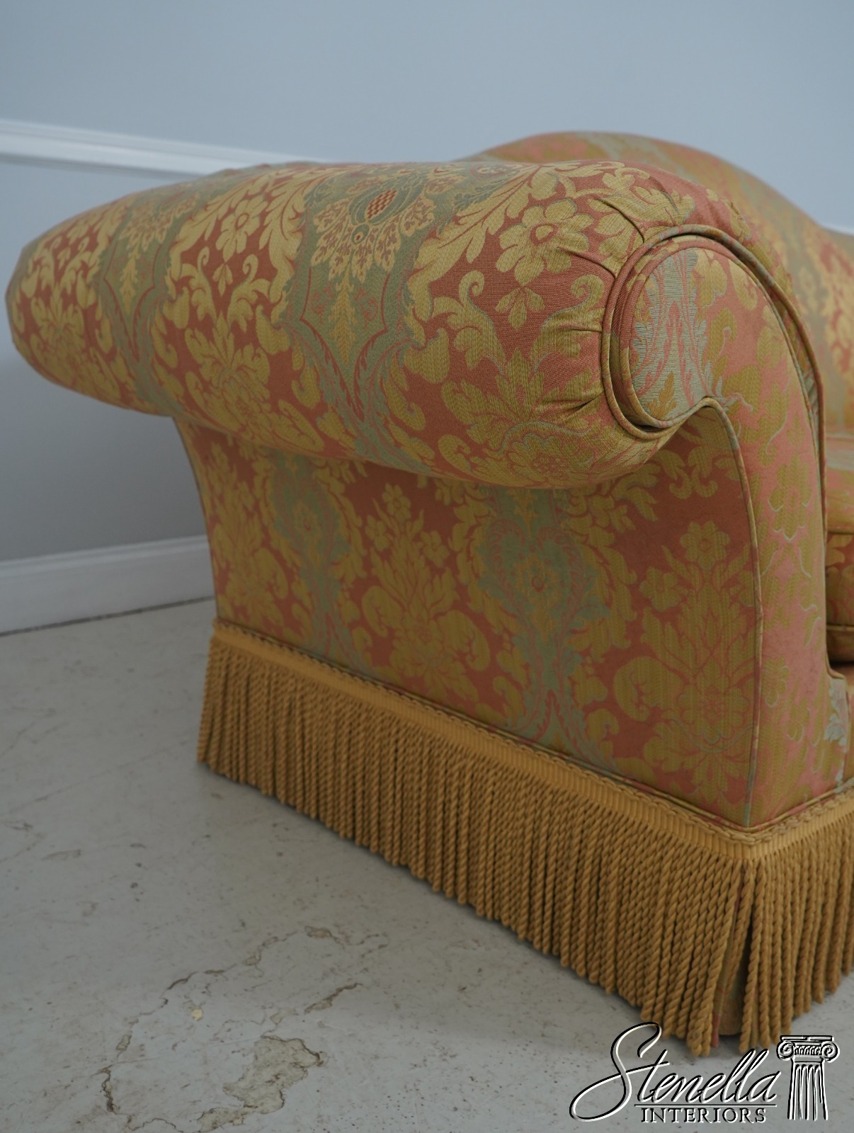 71654: BAKER Damask Upholstered Sofa w. Bullion Fringe