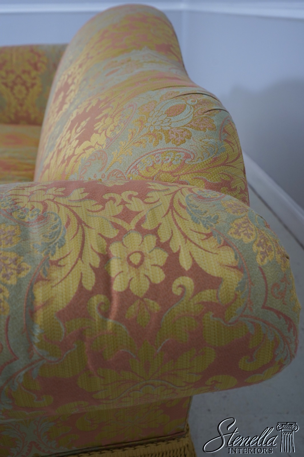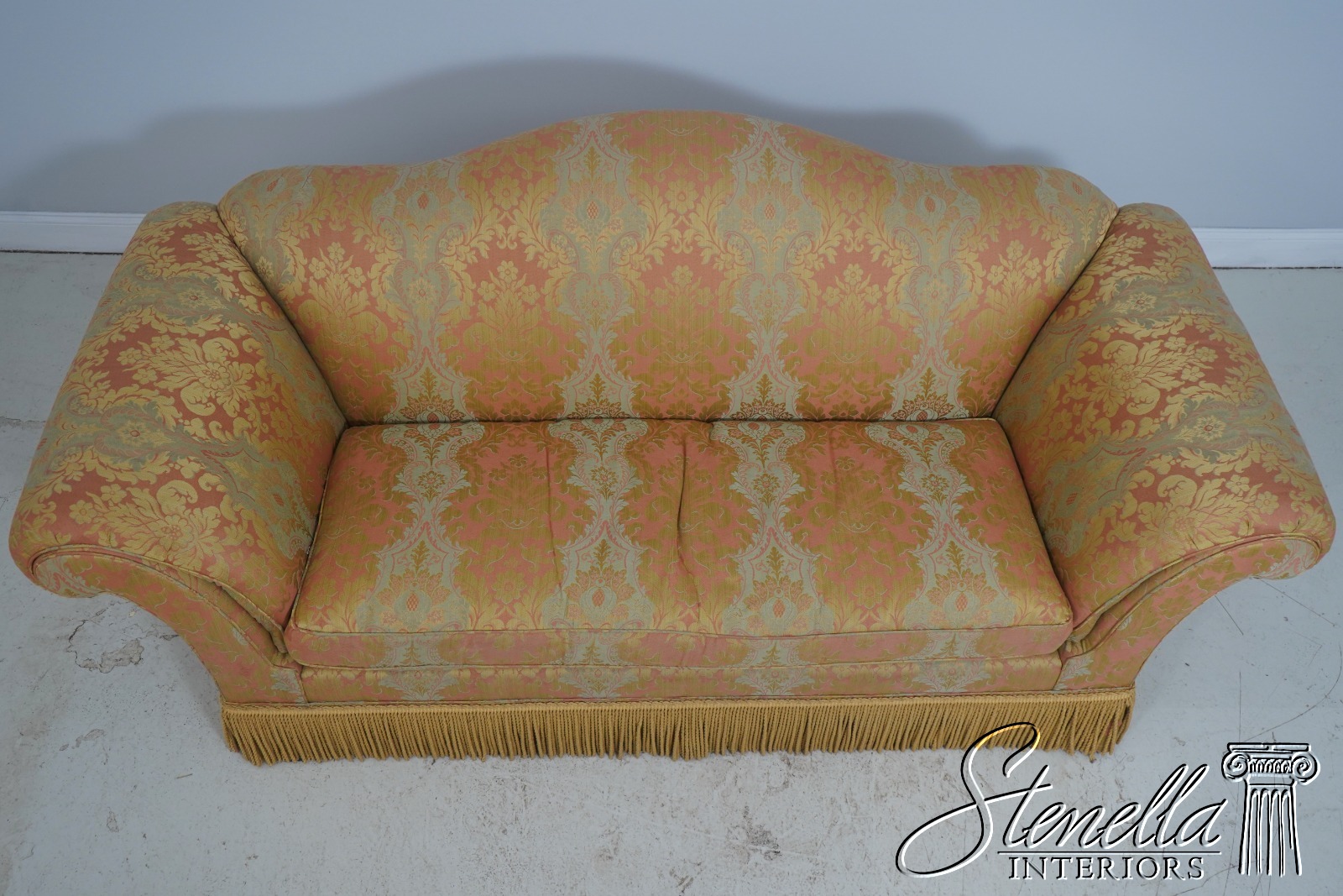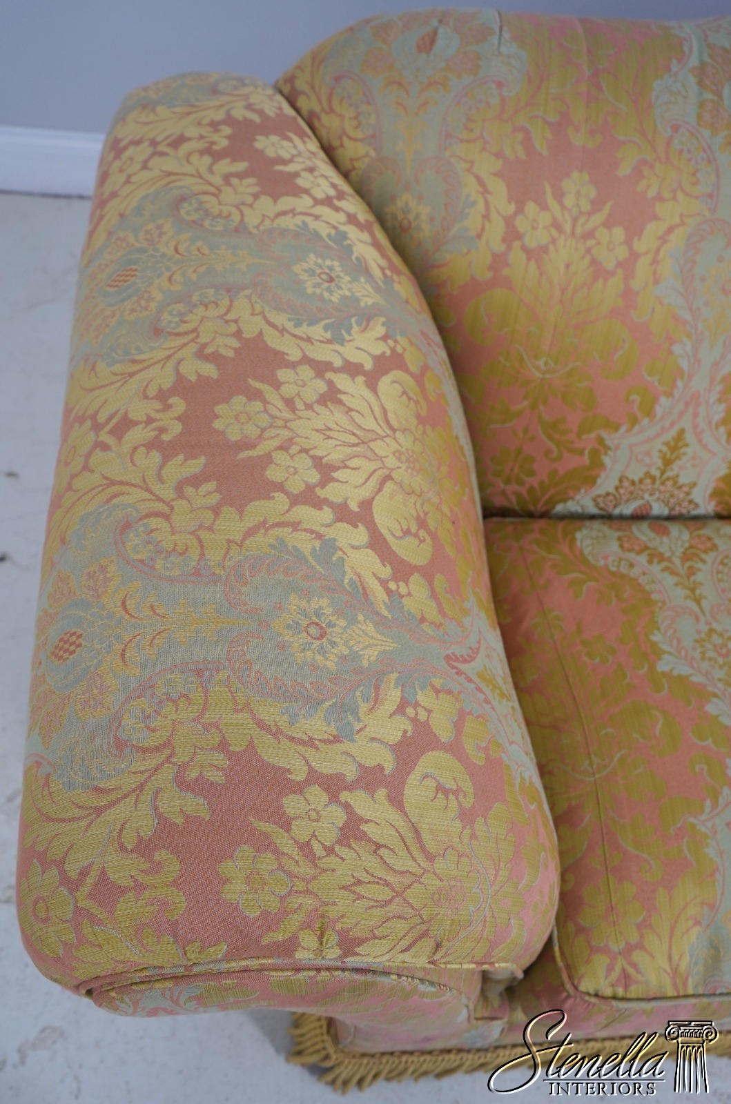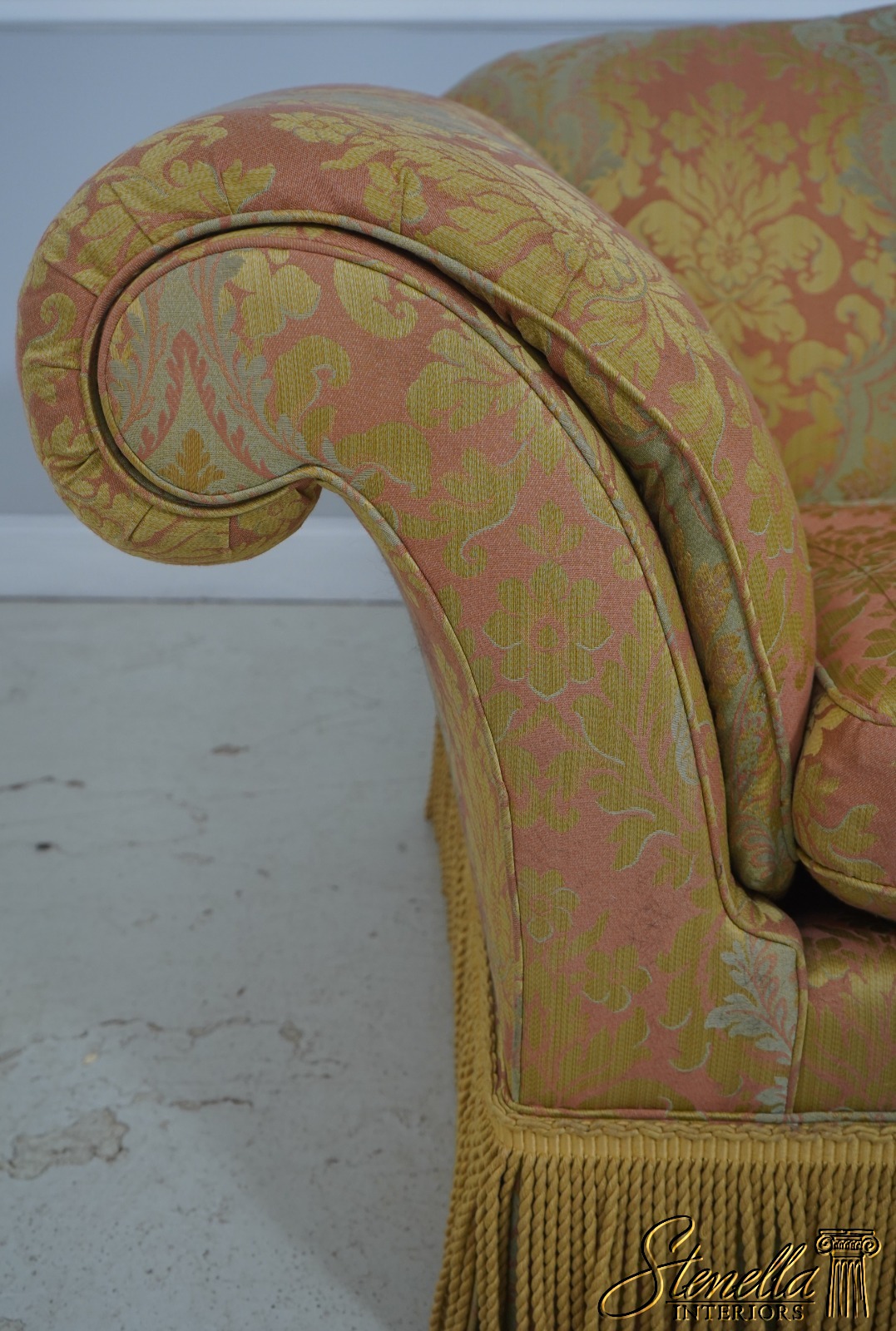 71654: BAKER Damask Upholstered Sofa w. Bullion Fringe