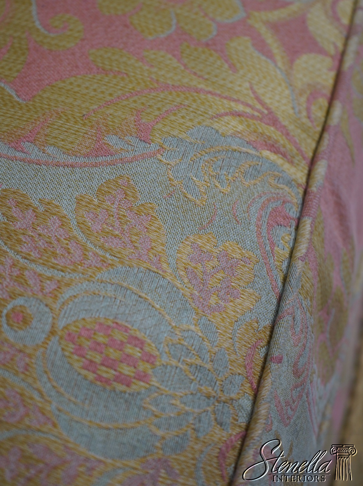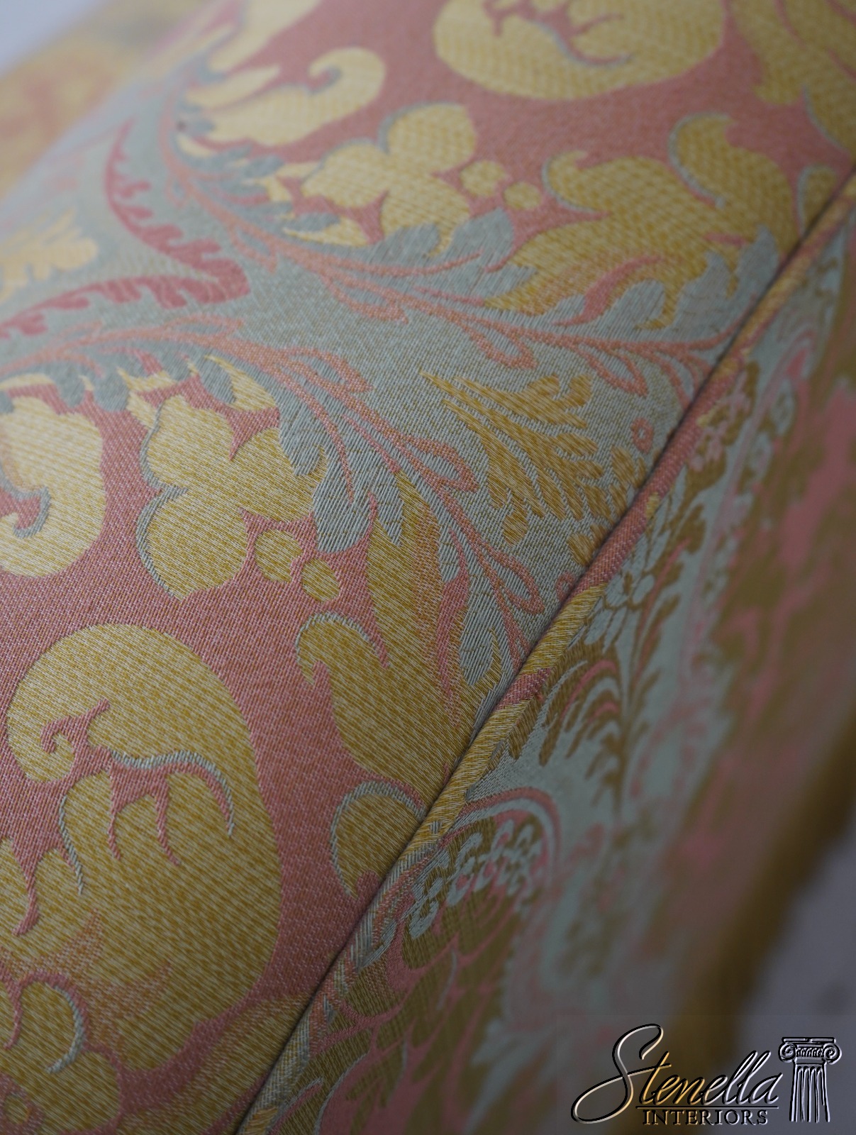 Details: Elegant Sophisticated Sofa Down Seat Cushion High Quality Construction Nice Fringe Skirted Base Stunning Damask Upholstery Used In A Designer Model Home And Rarely Ever Used Offered @ Fraction Original Retail Cost Over $12,000 New!