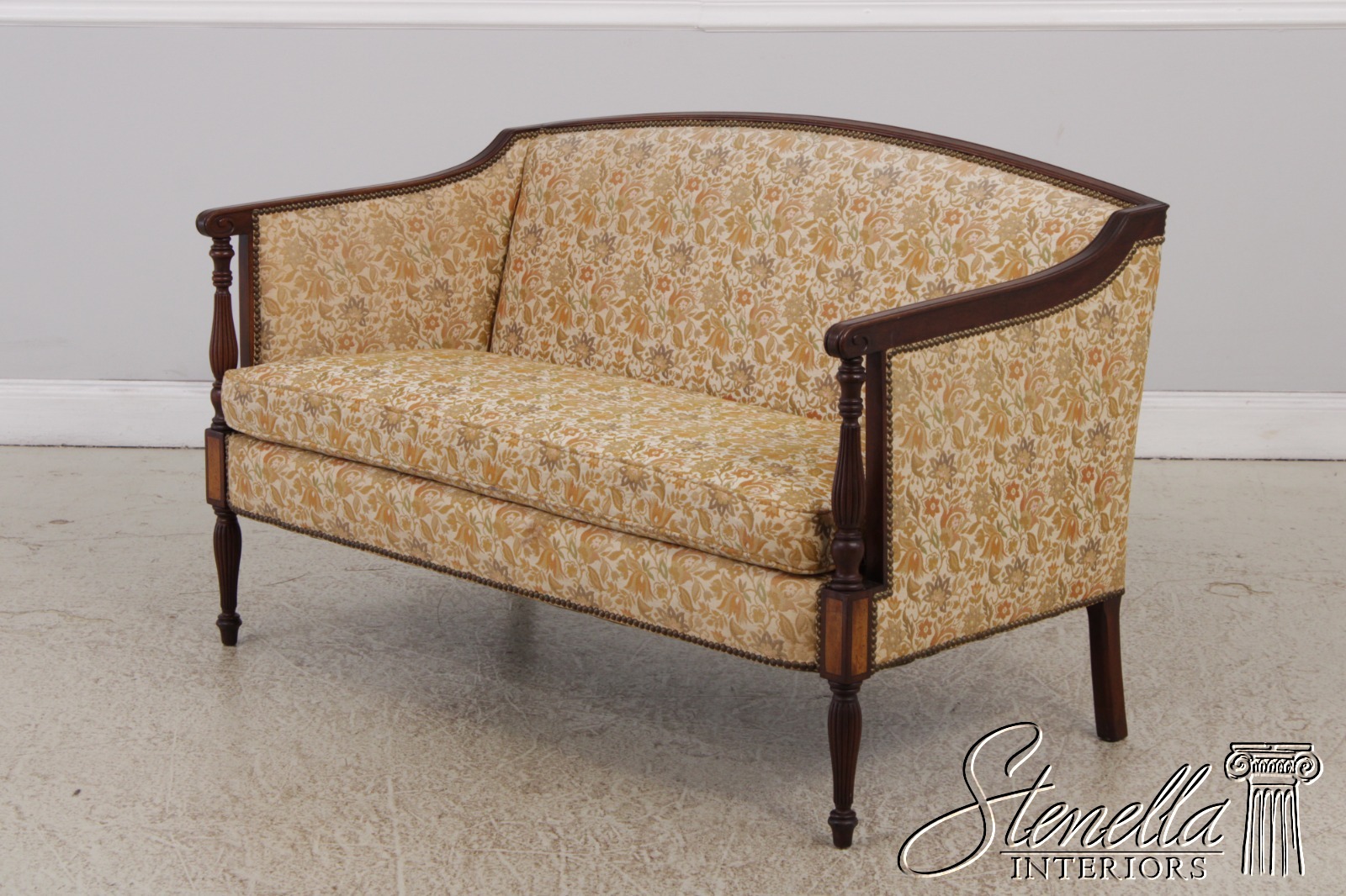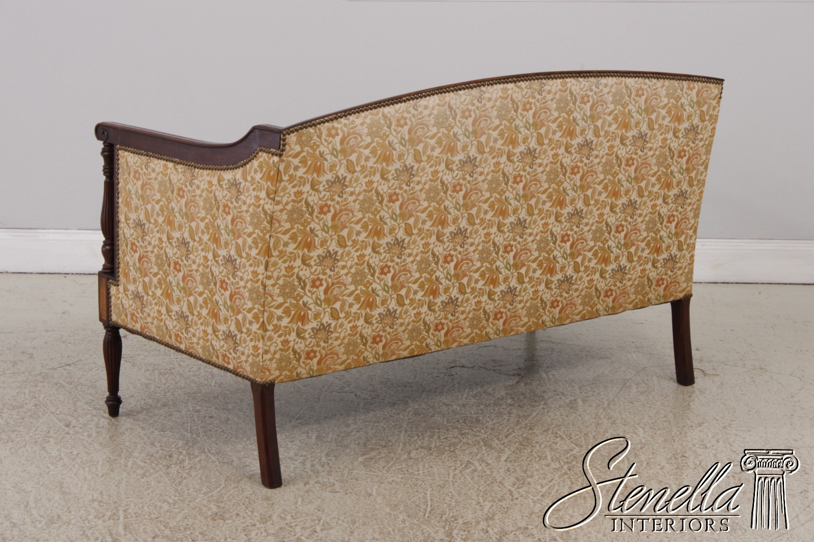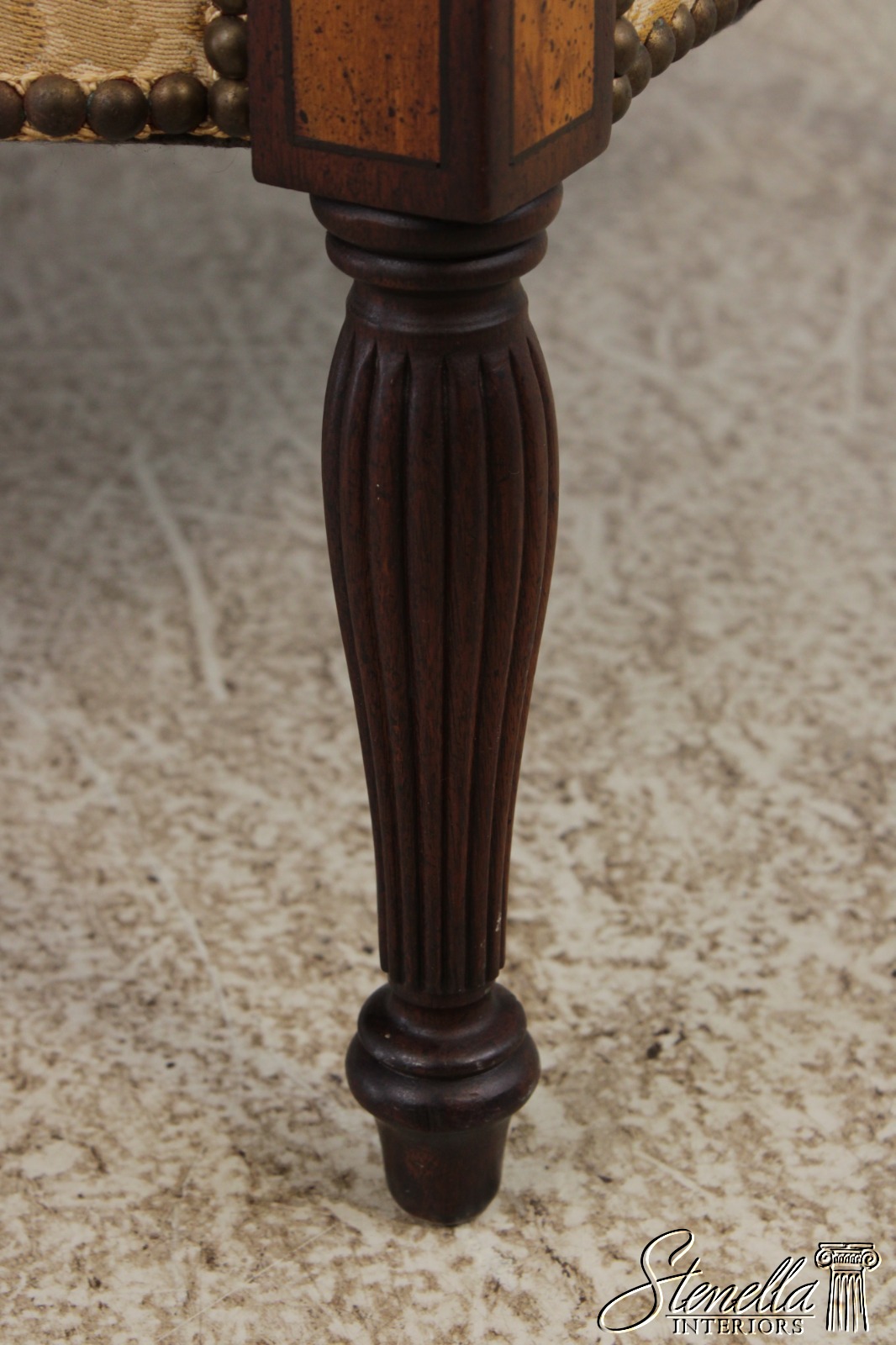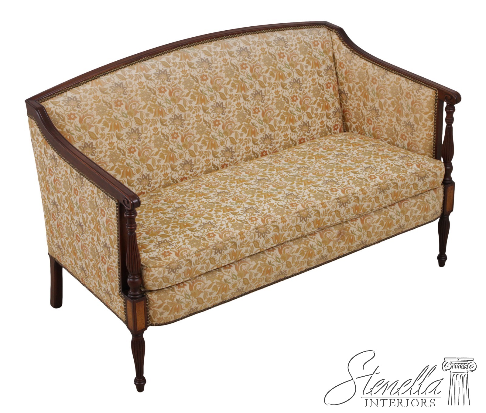Details: Mahogany Fine Carved Details High Quality Construction Curved Back Sheraton Style Nice Inlay Work Throughout Floral Pattern Tack Head Trim Reeded & Tapered Legs Scroll Arm Un-Marked As To Manufacture