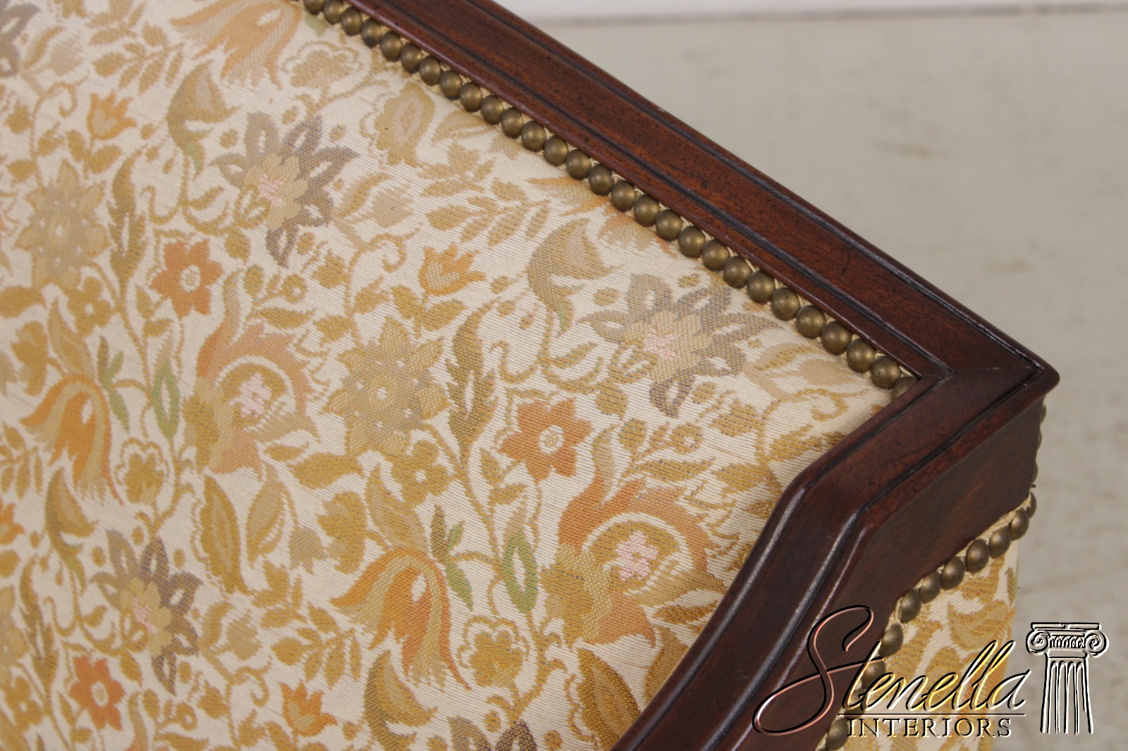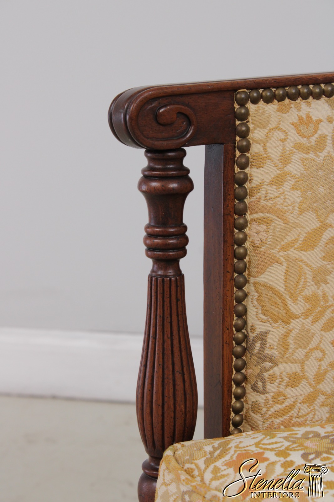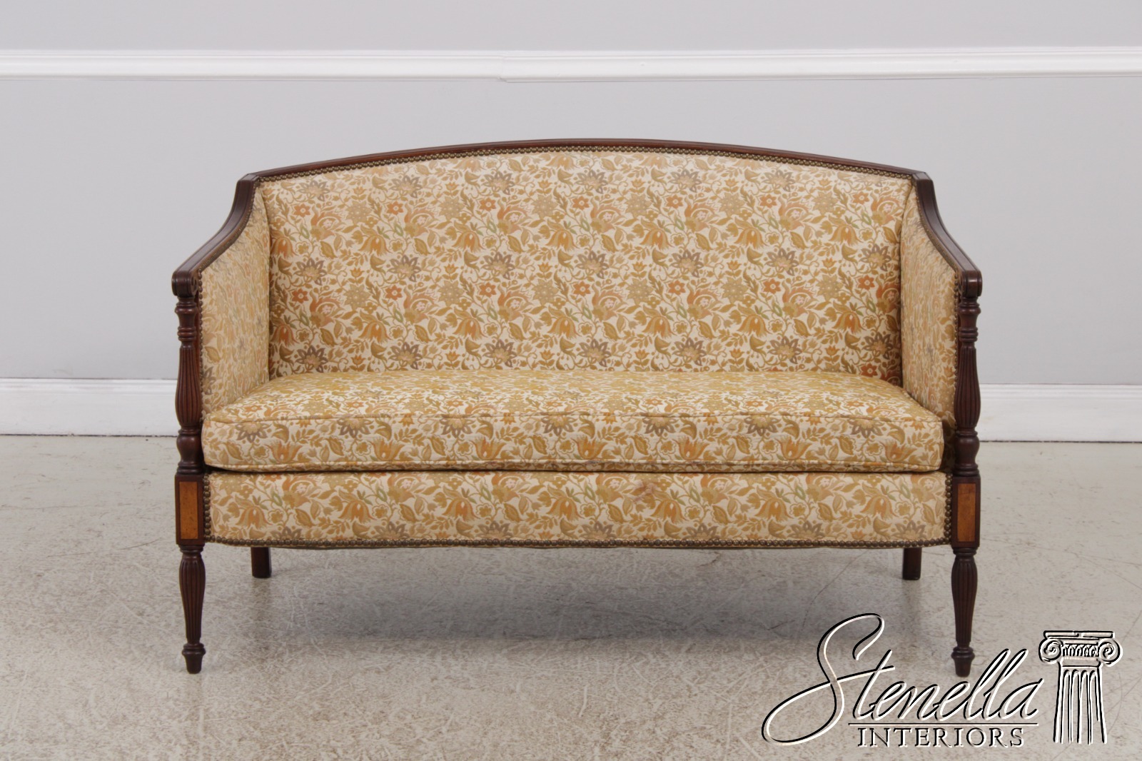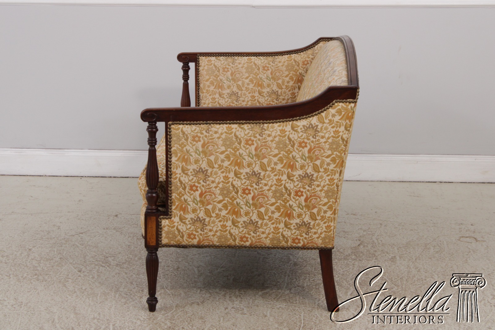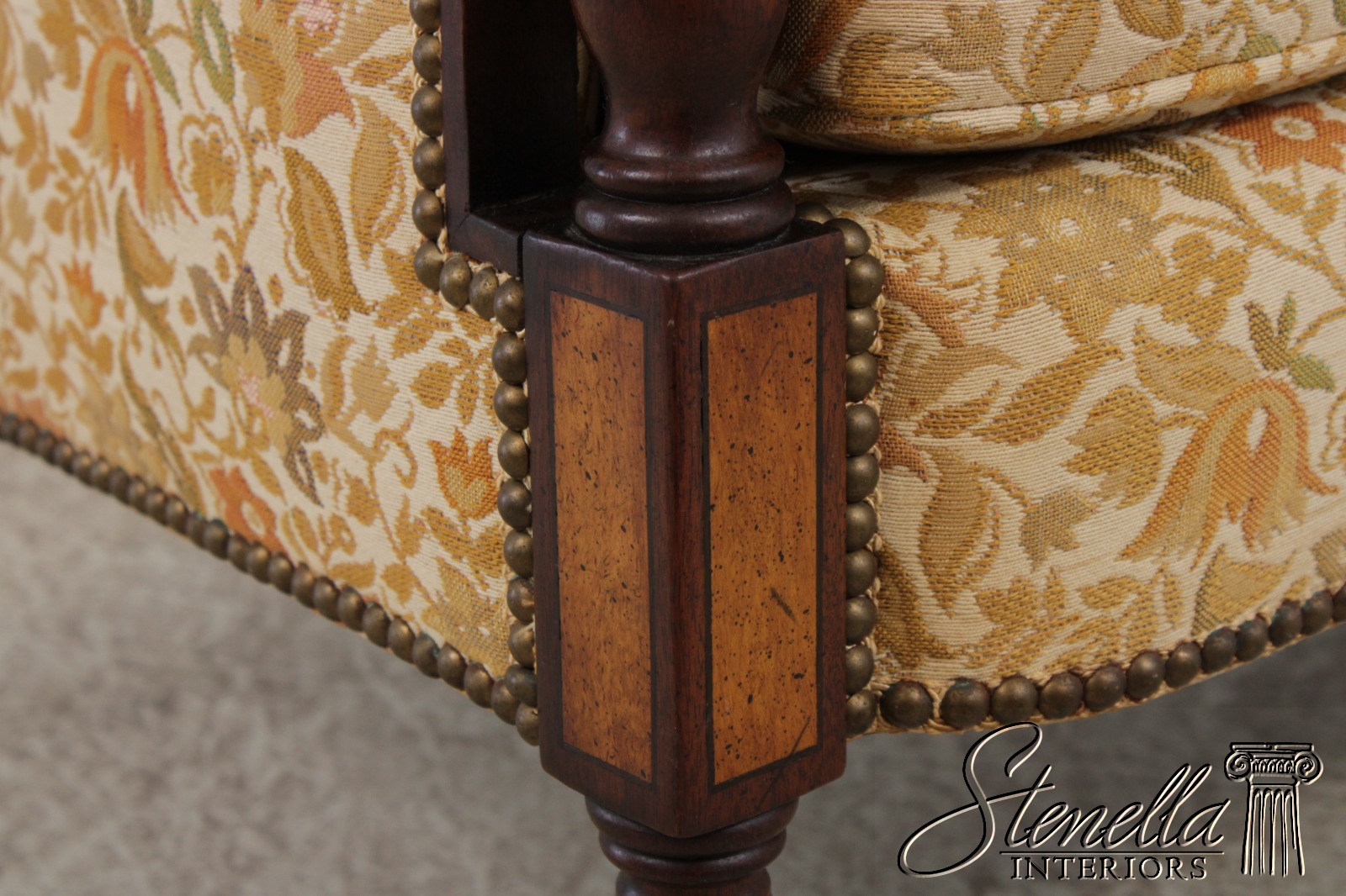 Details: Mahogany Fine Carved Details High Quality Construction Curved Back Sheraton Style Nice Inlay Work Throughout Floral Pattern Tack Head Trim Reeded & Tapered Legs Scroll Arm Un-Marked As To Manufacture