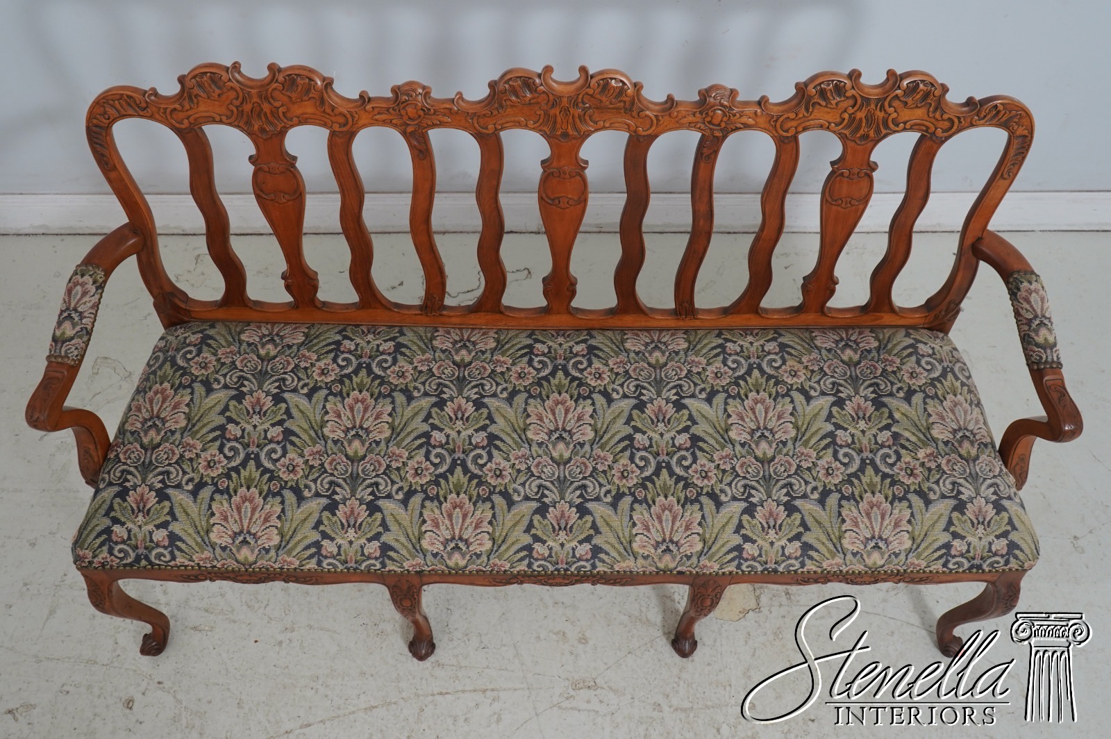 F69407: Vintage French Provincial Walnut Settee w. Needlepoint