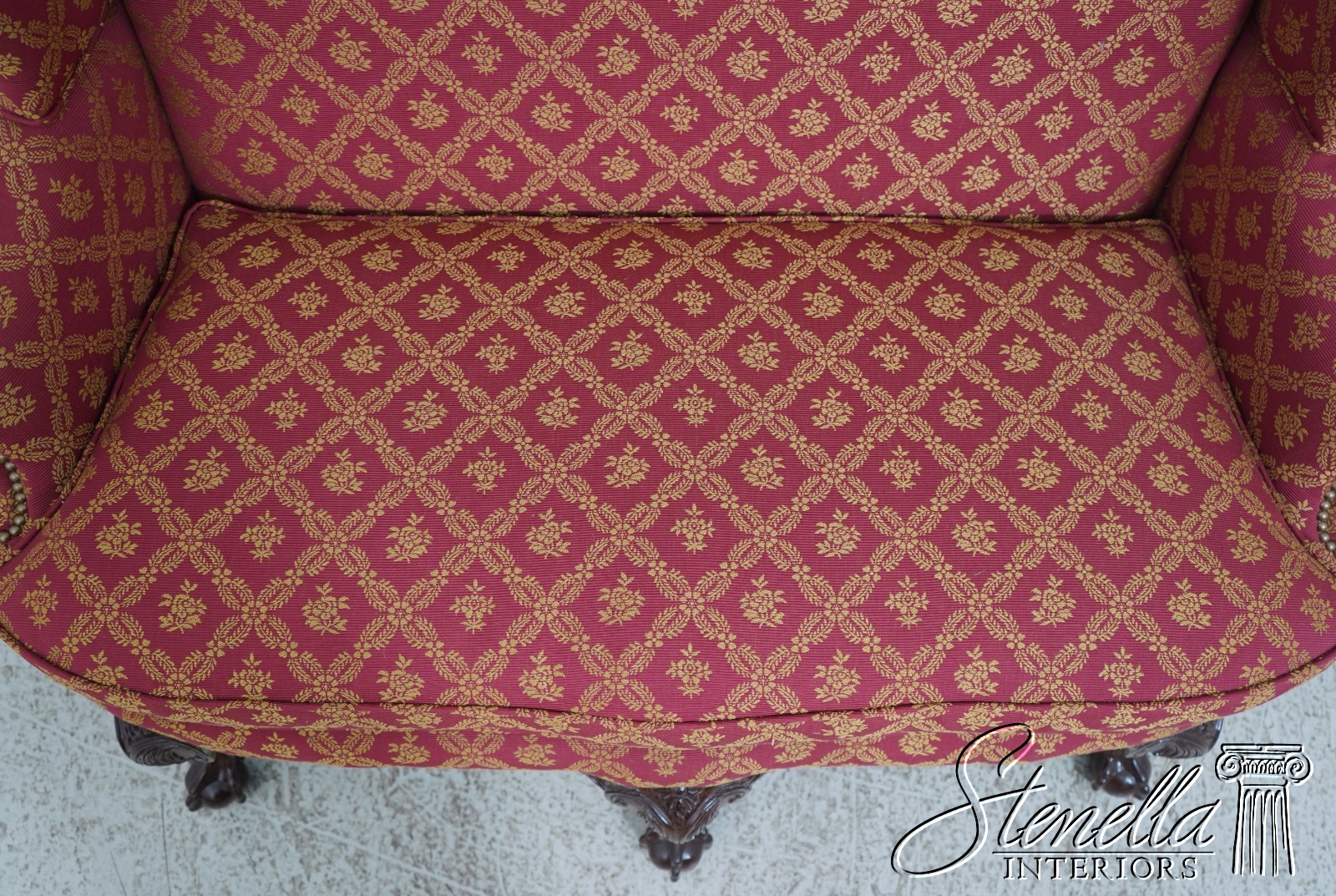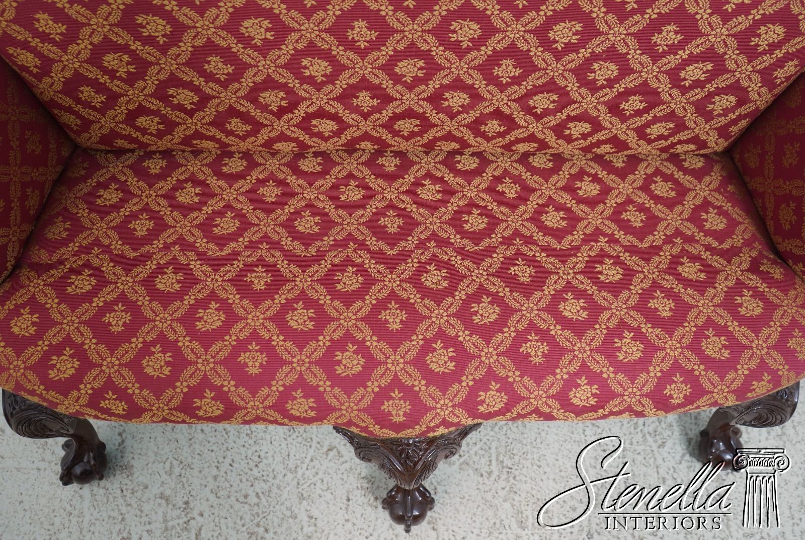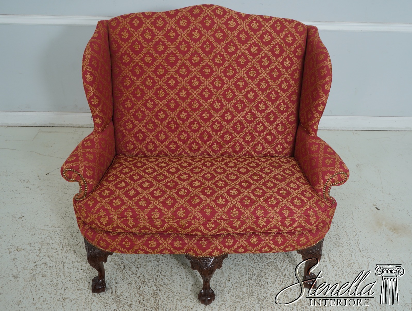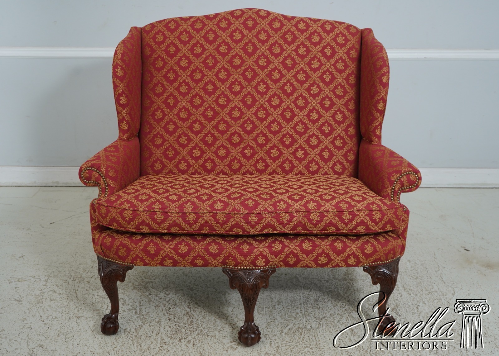 Details: 1 of 4 Made Mahogany Ball & Claw Feet Fine Carved Details High Quality Construction Shapely Curved Frame Frame Was Unfinished & Never Upholstered Previously Chippendale Style Traditional Style Tack Head Trim Brand New Professionally Reupholstered In Kravet Fabric Un-Marked As To Manufacture - Frame Is Hand Signed Under Upholstery Double Wing Back Settee Offered @ Fraction Original Retail Cost