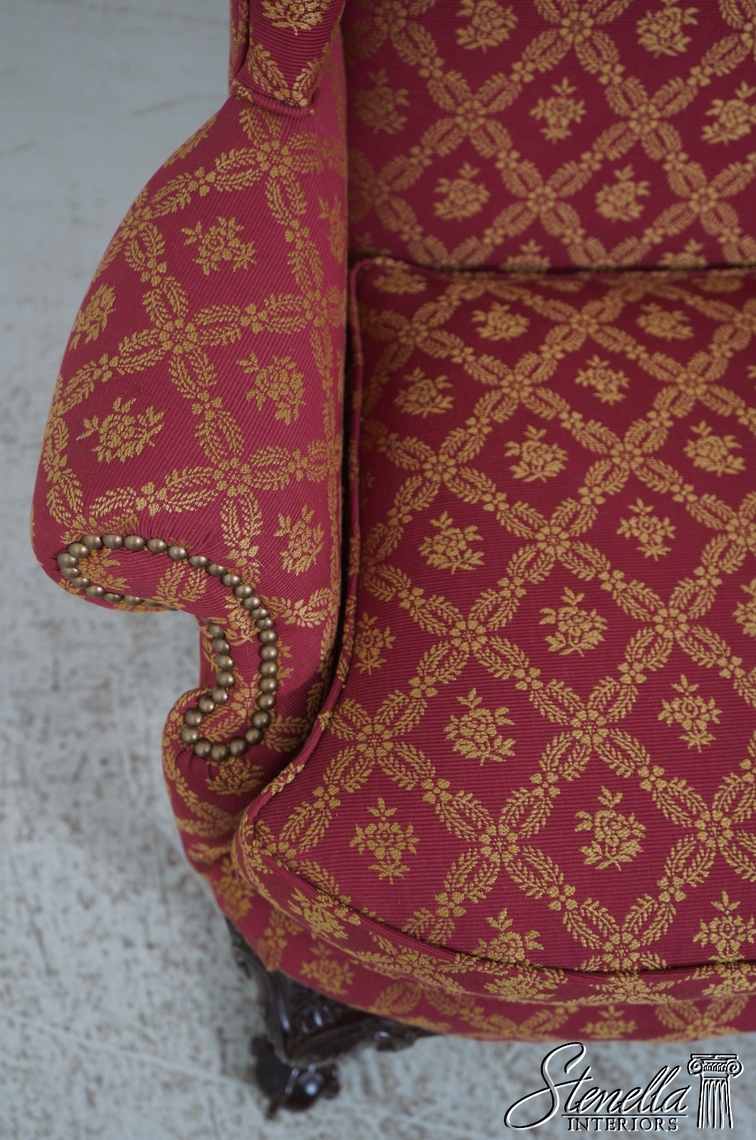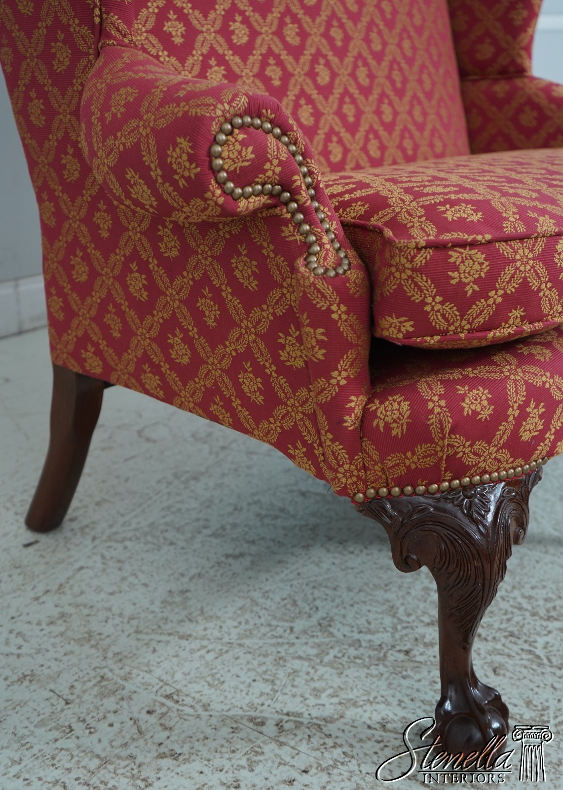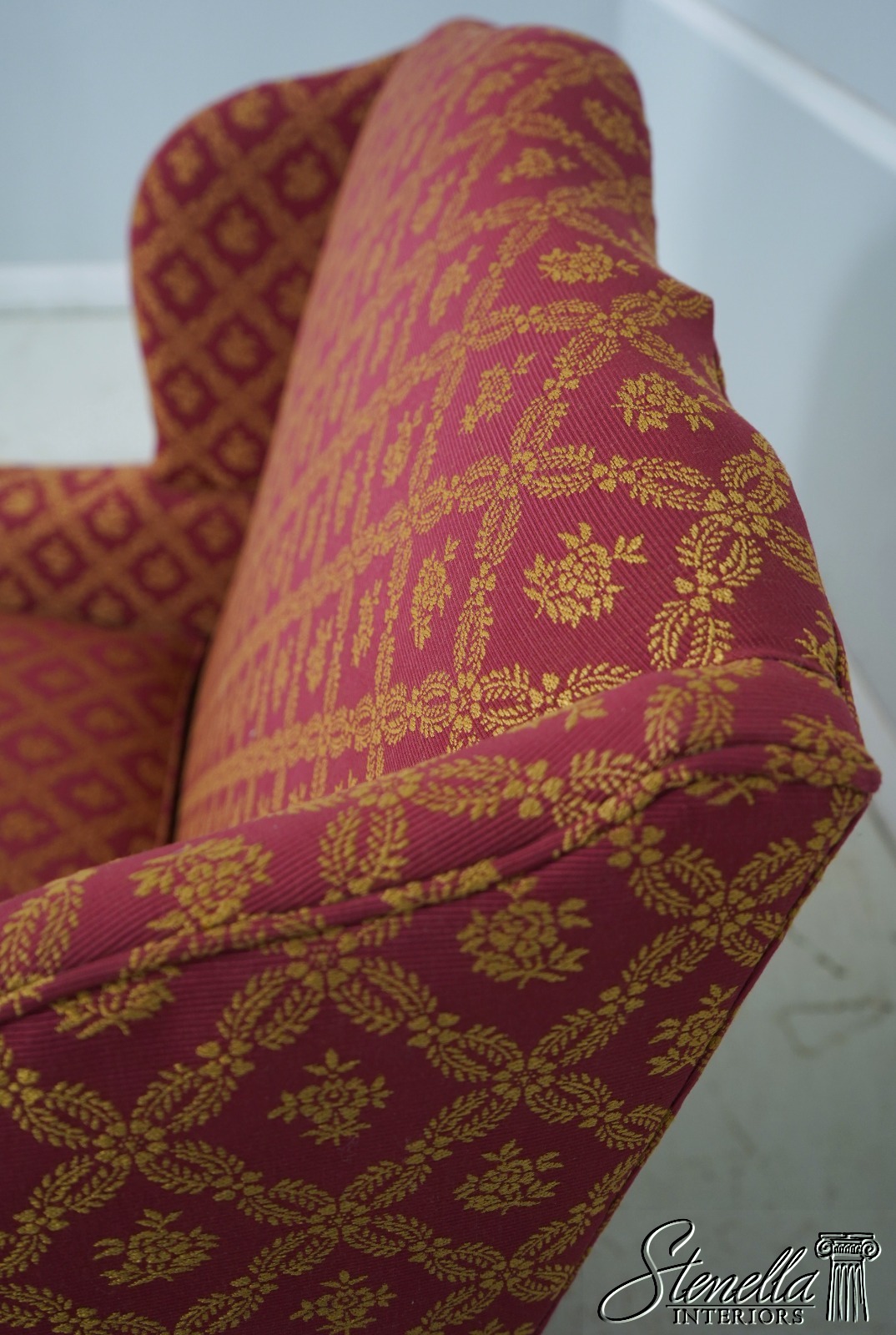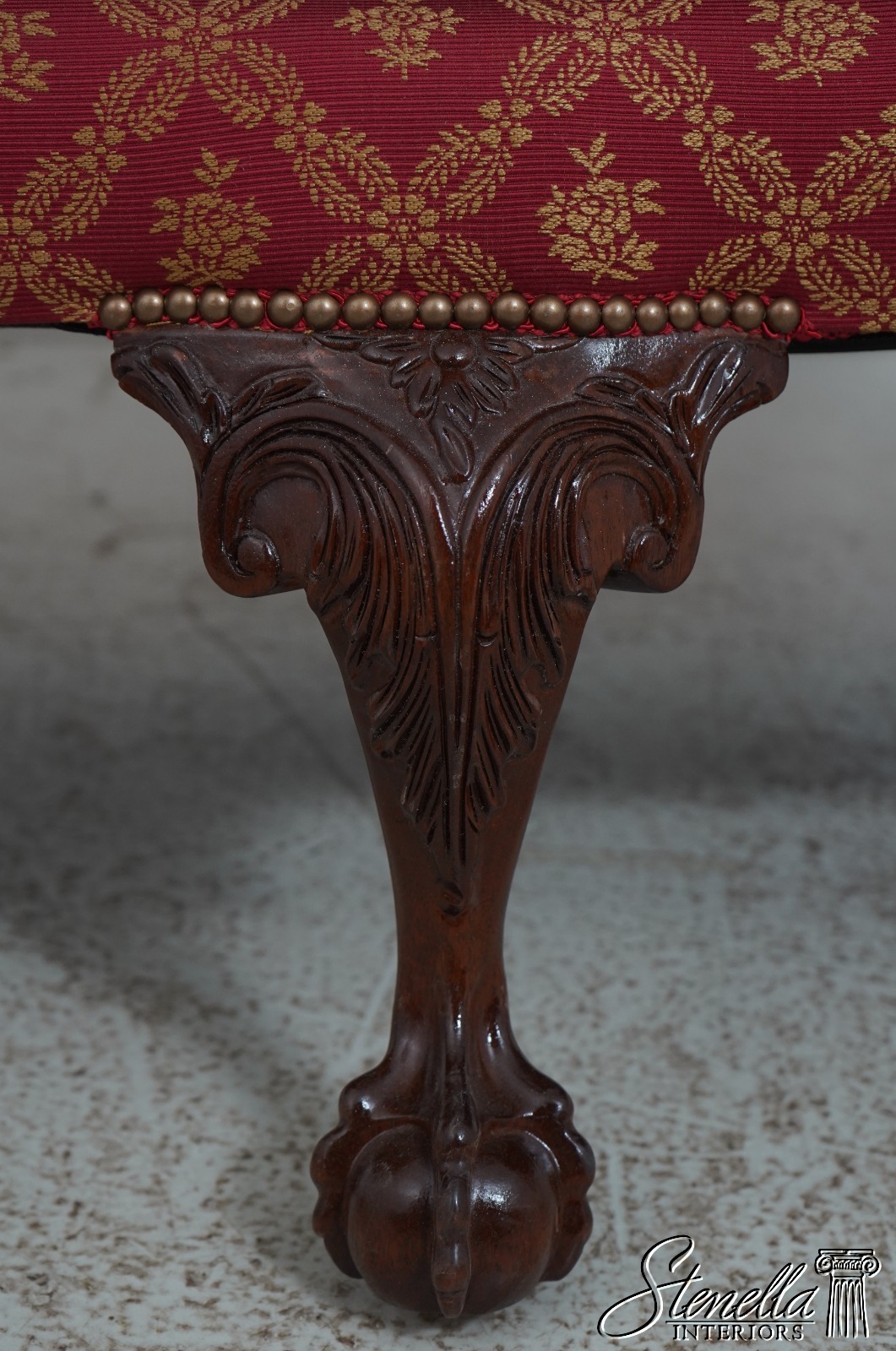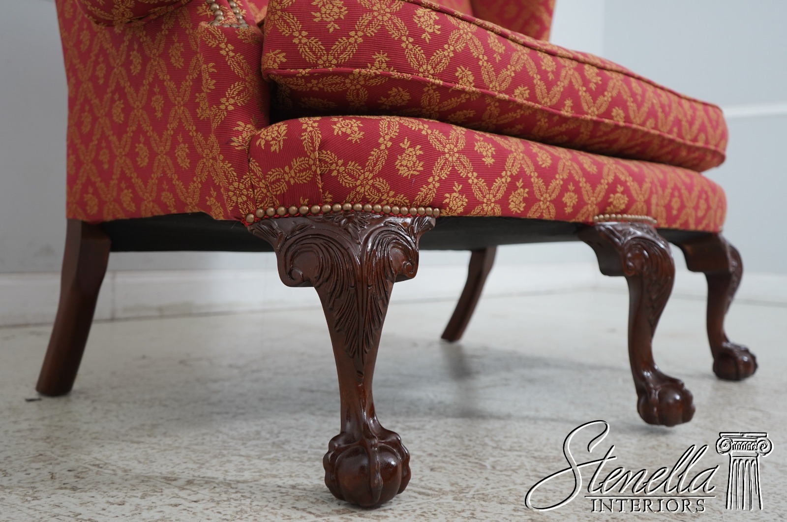 Details: 1 of 4 Made Mahogany Ball & Claw Feet Fine Carved Details High Quality Construction Shapely Curved Frame Frame Was Unfinished & Never Upholstered Previously Chippendale Style Traditional Style Tack Head Trim Brand New Professionally Reupholstered In Kravet Fabric Un-Marked As To Manufacture - Frame Is Hand Signed Under Upholstery Double Wing Back Settee Offered @ Fraction Original Retail Cost