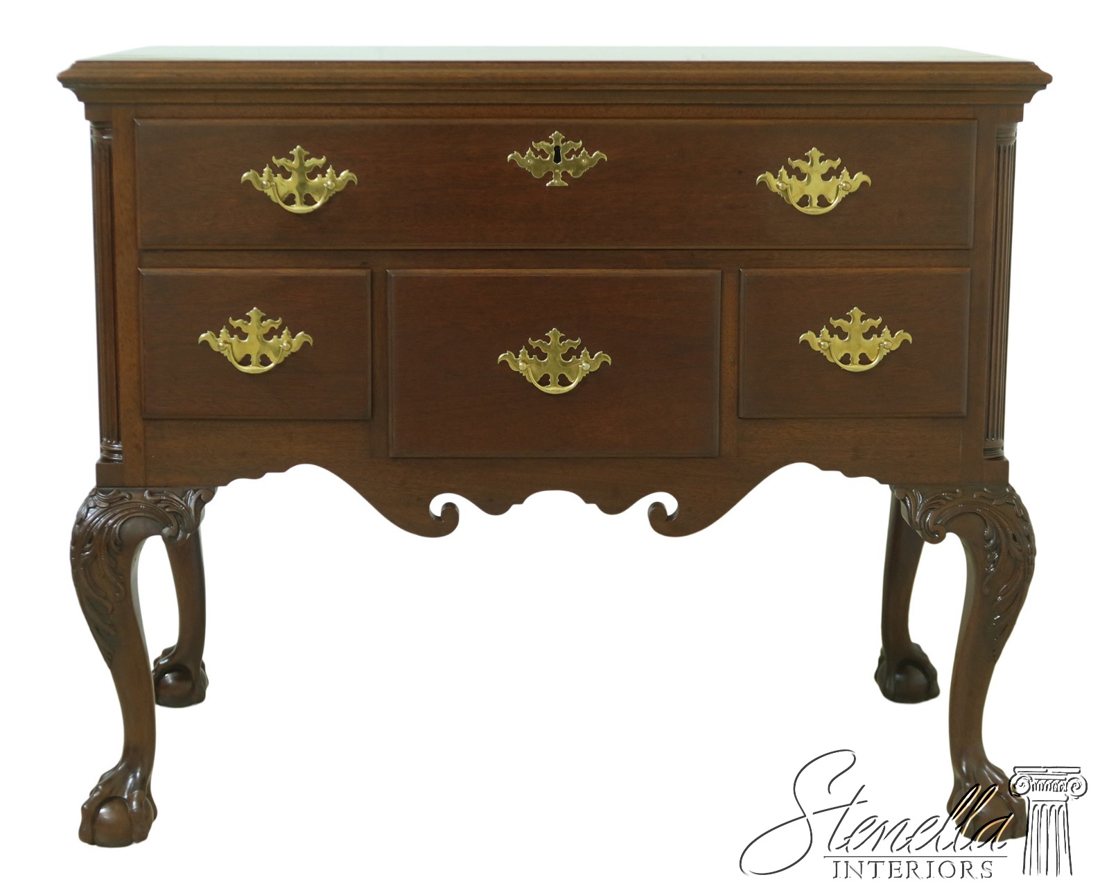 Chippendale style with fluted columns, carved cabriole legs with claw-and-ball feet. Adorned with acanthus leaf carvings. Brass hardware. One drawer over three drawers.