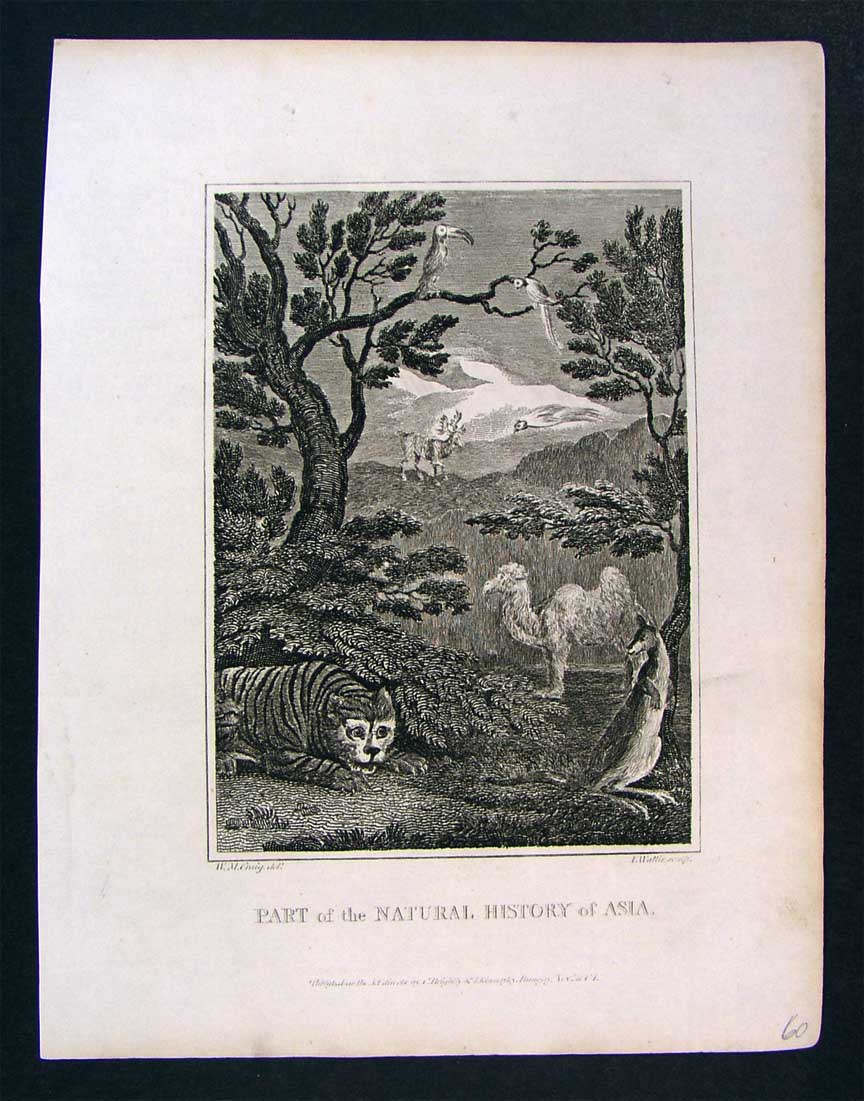 Description: It is an original antique engraved print over 195 years old from a 1813 edtion of Barclay's Dictionary published by Brightly in 1813, a copy of the title page is included. It is being sold as a single sheet, not mounted nor framed. An interesting print in the naive vain in that the artist doesn't seen to have a full understanding of the animals of Asia, which includes a Kangeroo unless Australia was considered part of Asia. The tiger looks more like an enlarged English house cat than a menancing Feline. But it is very nice over all.