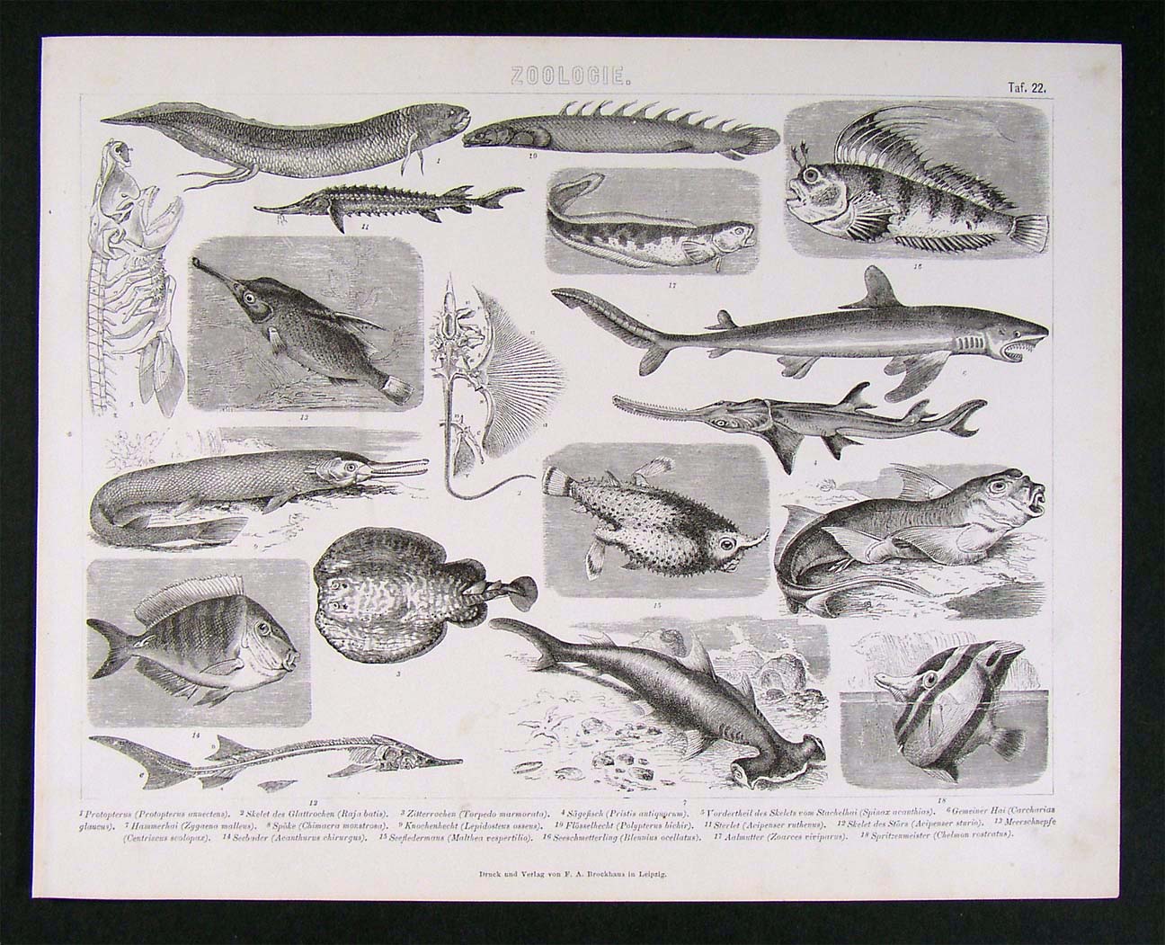 1874 Brockhaus Atlas Print - Fish Shark Flounder Gar