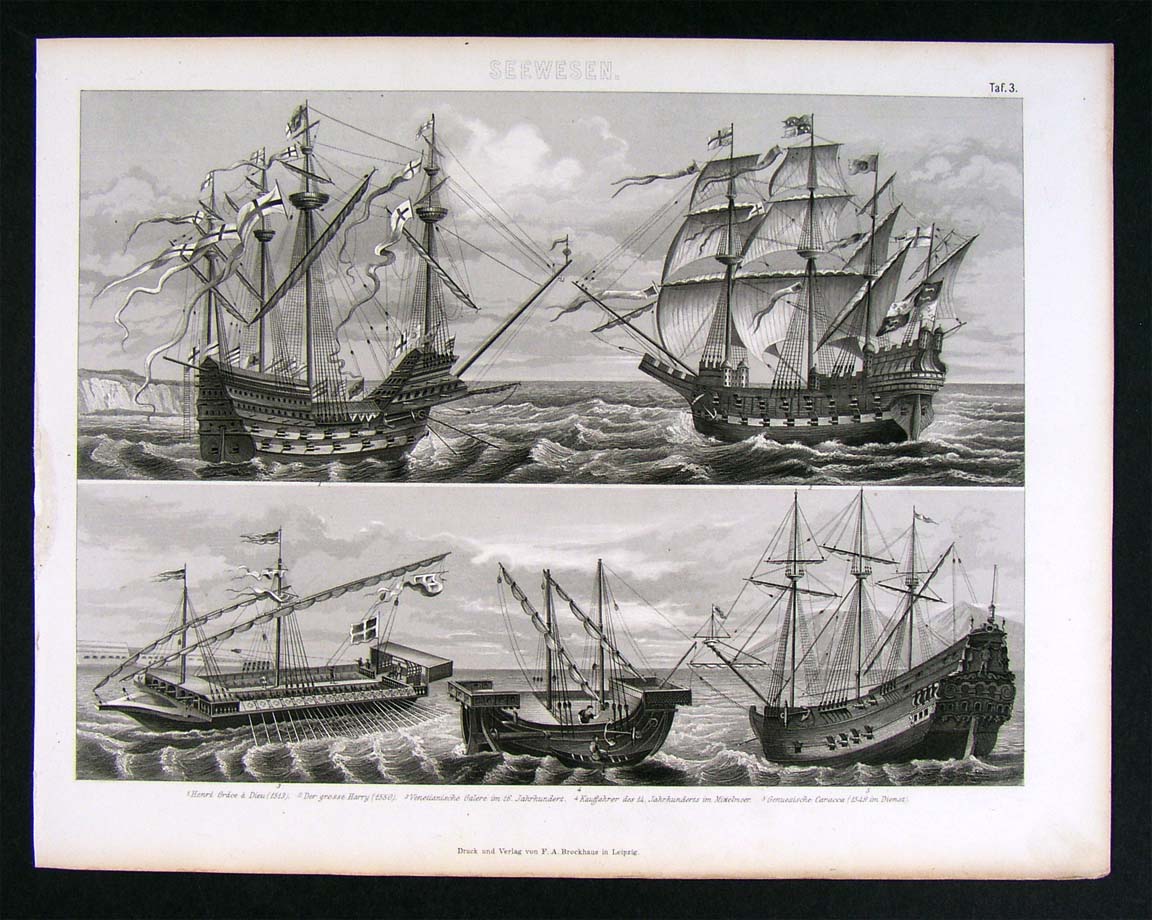 Description: It is an authentic antique steel engraved book plate print on paper over 135 years old. It is from the German Bilder Atlas, considered the most extensive lexicon of natural and scientific images of the 19th century, published in Leipzig by Brockhaus, 1874. It is labeled in German. A facsimile copy of the title page is included. It is being sold as a single sheet from the Atlas, not matted nor framed, as seen in the pic. Above shows the ships Henri Grace of God (1513) and the Great Harry (1550); below is a Venetian Galley, a 16th century merchant ship, and a Genoan Caracca. A nice selection of 16th century European ship types.