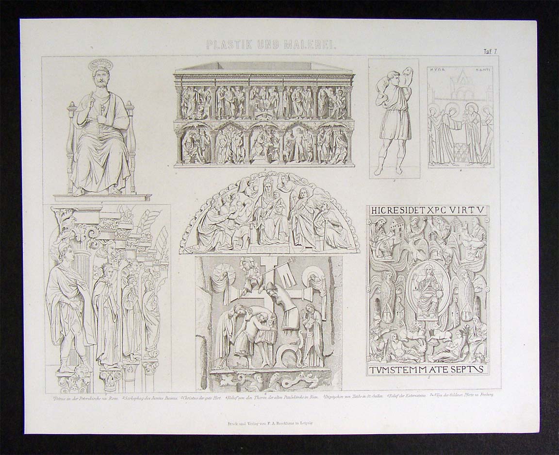 Description:  It is an authentic antique steel engraved book plate print on paper over 135 years old.  It is from the German Bilder Atlas, considered the most extensive lexicon of natural and scientific images of the 19th century, published in Leipzig by Brockhaus, 1874. It is labeled in German. A facsimile copy of the title page is included. It is being sold as a single sheet from the Atlas, not matted nor framed, as seen in the pic. It is a very linear rendering of the ancient work, basically as seen in the pic.