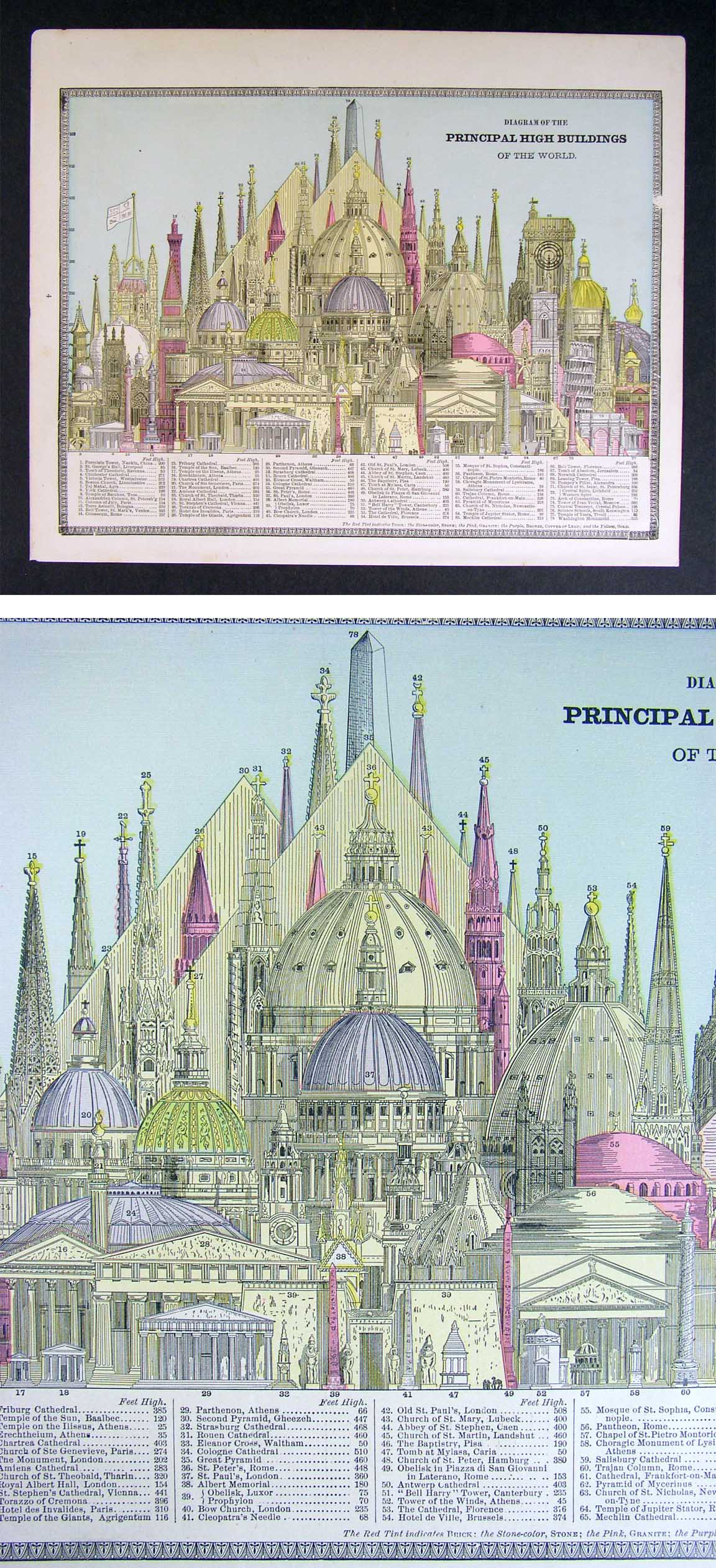 Description: It is an authentic engraved antique map over 125 years old from an early1883 edition of Cram's Unrivaled Family Atlas of the World (Chicago, 1883). A copy of the Atlas title page is included for authenticity. It is being sold as a single sheet, not mounted, matted nor framed, basically as seen in the pic, photographed against a dark background so you can see all the edges and actual condition. It has ceragraphic color, a wax engraving technique invented by Morris. An interesting diagram of the Principal High Buildings of the World with Washington's Monument shown as the highest at the time.
