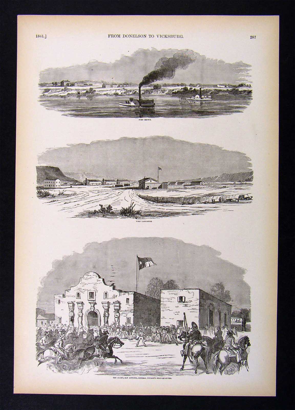 Title: The print shows Fort Brown (top); Fort Lancaster (center); the Alamo, which served as the Headquarters of General Twigg during the Civil War.