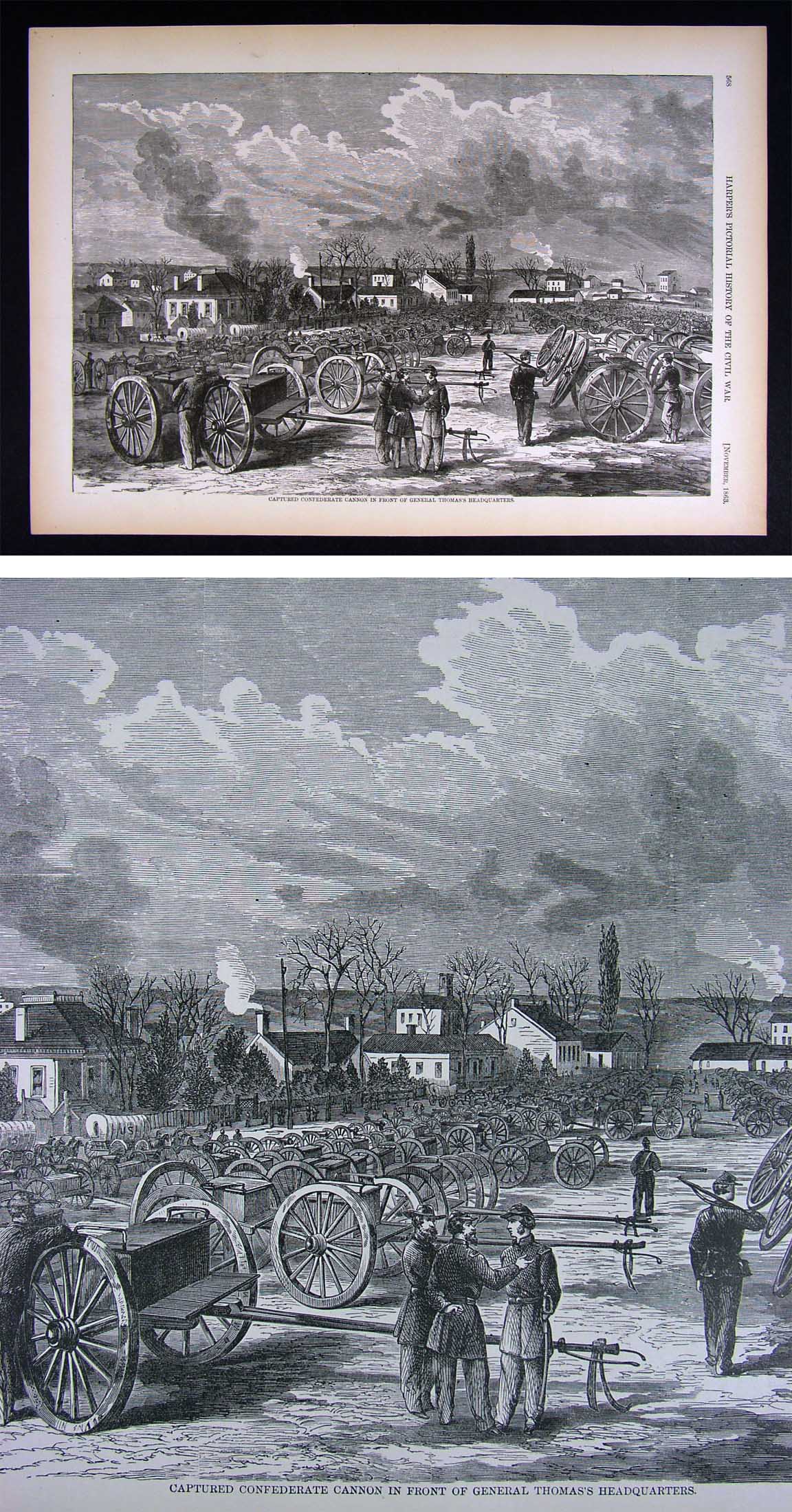 Description: It is an authentic antique Woodcut Print approximately 145 years old. It is from the first edition of Harper's Pictorial History of the Civil War, which was published by McDonnell Bros., Chicago, Ill., part one was published in 1866 and part II in 1868. With the first part completed in 1866, it was one of the first works to put into perspective the account of the Great Rebellion, complete with woodcut illustrations, most of which were drawn on the spot by such artists as Winslow Homer, Granville Perkins, Livingston Hopkins and others for Harper's Weekly which chronicled the Civil War on a weekly basis. A copy of the title page is included for authenticity. The print is not mounted, matted nor framed being sold as a single sheet as seen in the first pic. There are often smaller illustrations and text on the reverse. Overall, a very nicely preserved print that would frame up well!