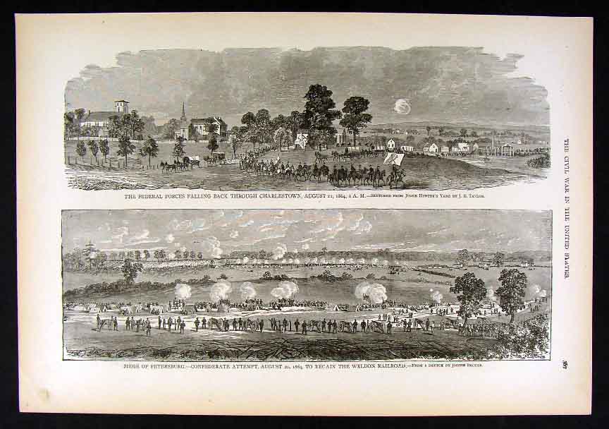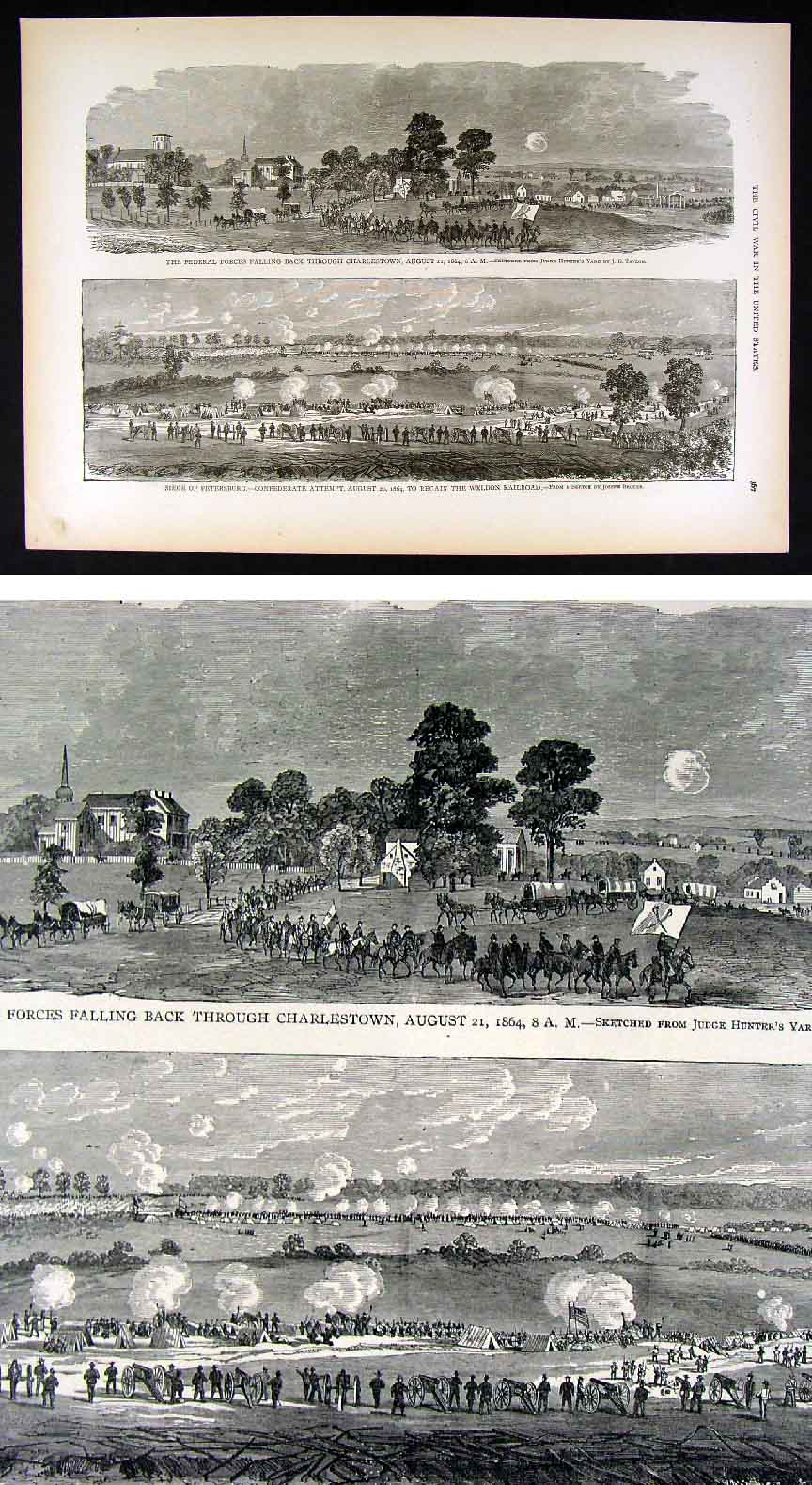Title: (top) The Federal Forces Falling Back through Charlestown, August 21, 1864. (below) Siege of Petersburg - Confederate Attempt, Aug. 20, 1864 to Regain the Weldon Railroad.