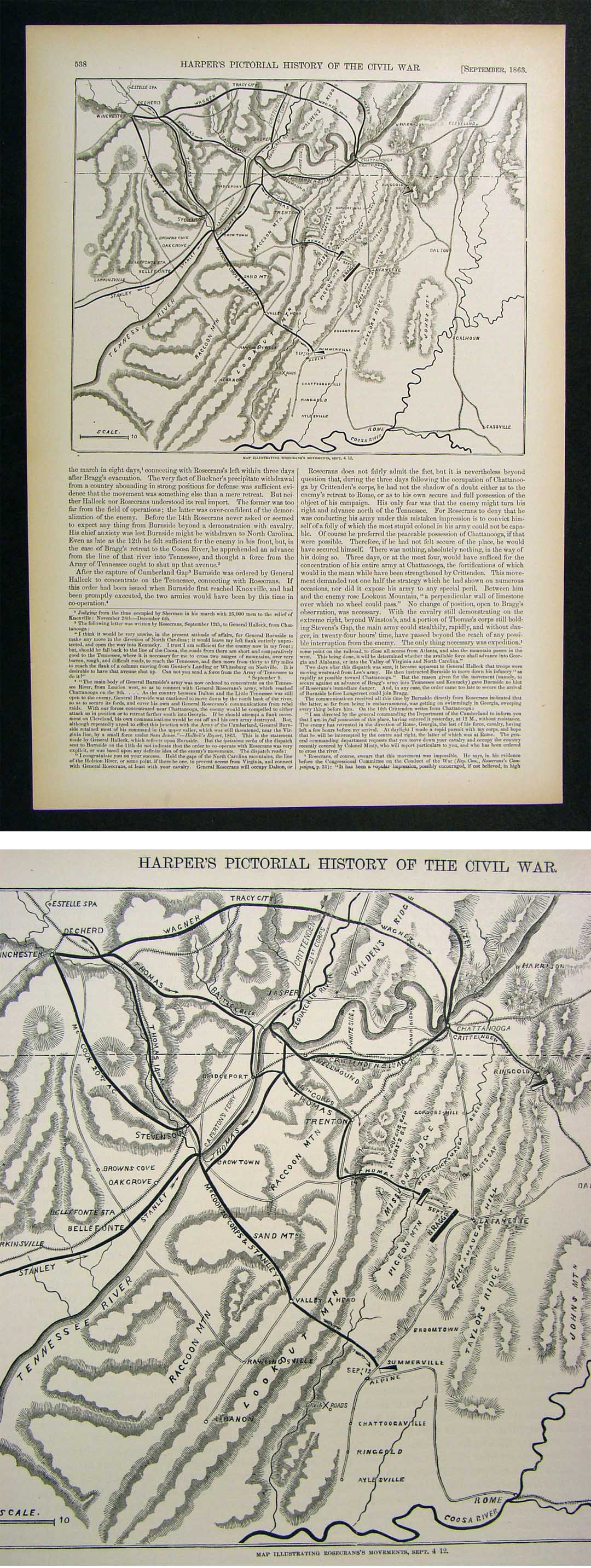 Description: It is an authentic antique woodcut map approximately 145 years old. It is from the first edition of Harper's Pictorial History of the Civil War, which was published by McDonnell Bros., Chicago, Ill., part one was published in 1866 and part II in 1868. With the first part completed in 1866, it was one of the first works to put into perspective the account of the Great Rebellion, complete with woodcut illustrations, most of which were drawn on the spot by such artists as Winslow Homer, Granville Perkins, Livingston Hopkins and others for Harper's Weekly which chronicled the Civil War on a weekly basis. A copy of the title page is included for authenticity. The map is not mounted, matted nor framed being sold as a single sheet as seen in the first pic. There is text on the reverse. Overall, a very nicely preserved print that would frame up well!
