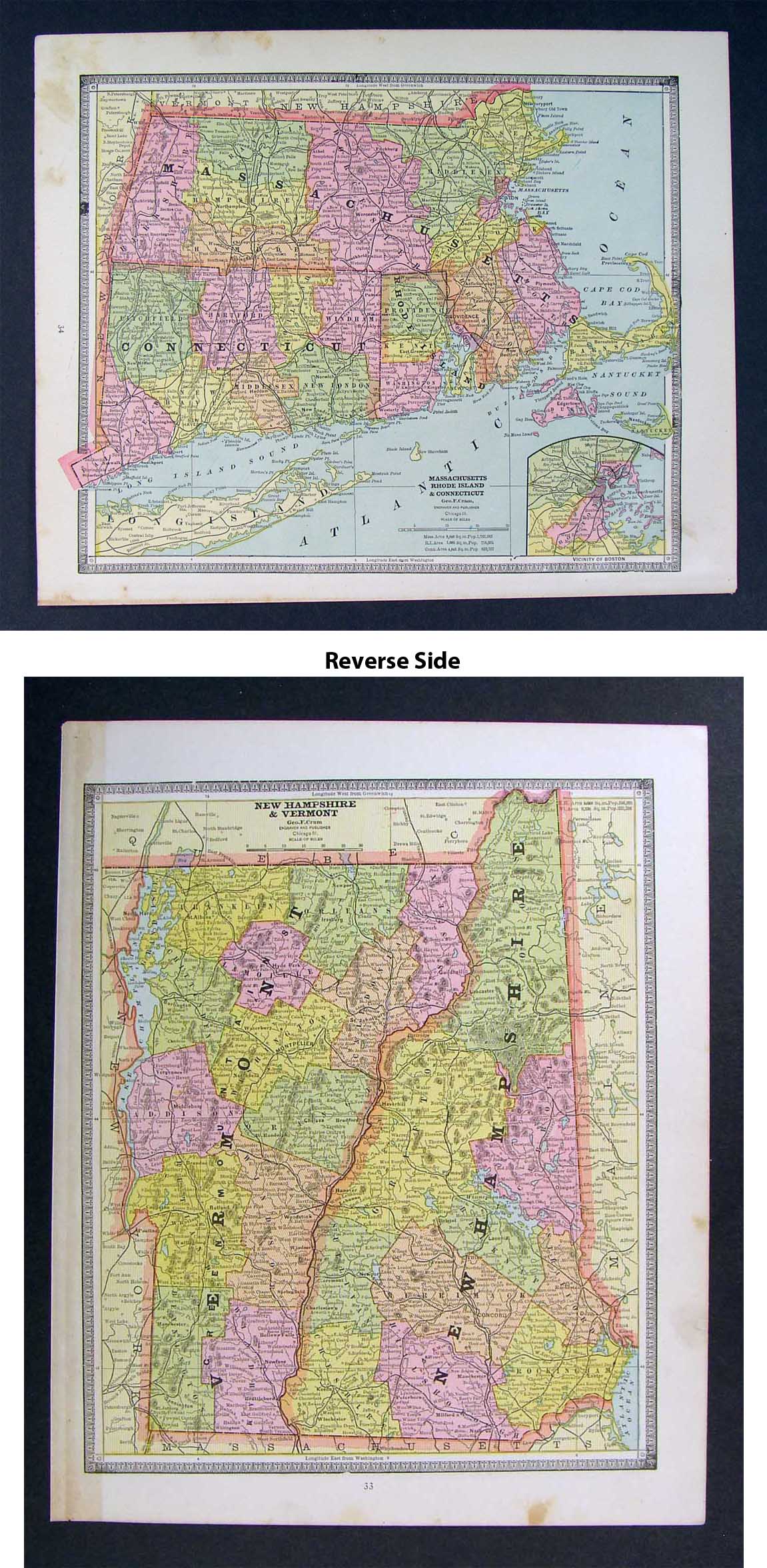 Description:  It is an authentic engraved antique map over 125 years old from an early1883 edition of Cram's Unrivaled Family Atlas of the World (Chicago, 1883). A copy of the Atlas title page is included for authenticity. It is being sold as a single sheet, not mounted, matted nor framed, basically as seen in the pic, photographed against a dark background so you can see all the edges and actual condition. It has ceragraphic color, a wax engraving technique invented by Morris. There is a map of Vermont and New Hampshire on the reverse.