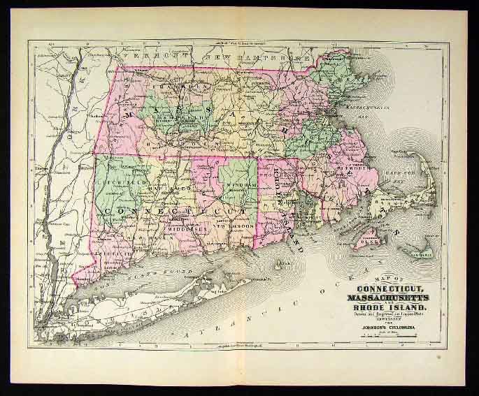 Description: It is an authentic antique copper engraved map with original handcoloring and a centerfold as issued. It is from Johnson's Universal Cyclopedia, 1886. A copy of the title page is included. The map is not mounted nor matted, being sold as a single sheet as seen in the first pic.