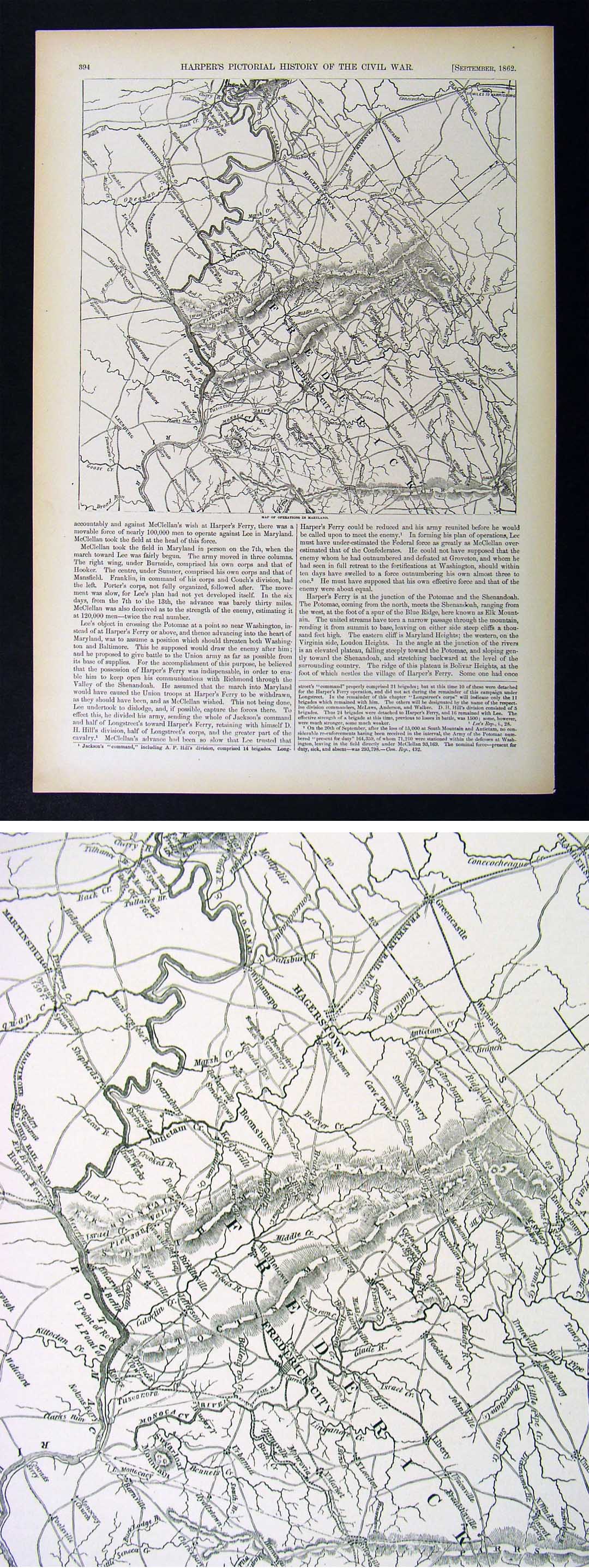 Description: It is an authentic antique woodcut map approximately 145 years old. It is from the first edition of Harper's Pictorial History of the Civil War, which was published by McDonnell Bros., Chicago, Ill., part one was published in 1866 and part II in 1868. With the first part completed in 1866, it was one of the first works to put into perspective the account of the Great Rebellion, complete with woodcut illustrations, most of which were drawn on the spot by such artists as Winslow Homer, Granville Perkins, Livingston Hopkins and others for Harper's Weekly which chronicled the Civil War on a weekly basis. A copy of the title page is included for authenticity. The map is not mounted, matted nor framed being sold as a single sheet as seen in the first pic. There is text on the reverse. Overall, a very nicely preserved print that would frame up well!