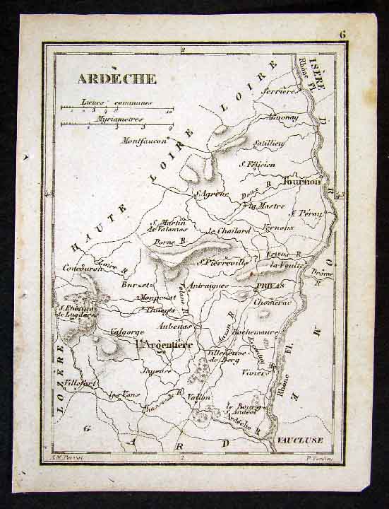 Description:  It is an original antique copper engraved map over 175 years old. It is by Aristide Michel Perrot and engraved by Pierre Antoine Tardieu for Perrot's Atlas Portatif de France (Paris, 1833).  A.M. Perrot's name appears in the bottom left and P.Tardieu appears in the bottom right. The map is not mounted nor matted, being sold as a single sheet as seen in the first pic. A nice miniature map with much detail.
