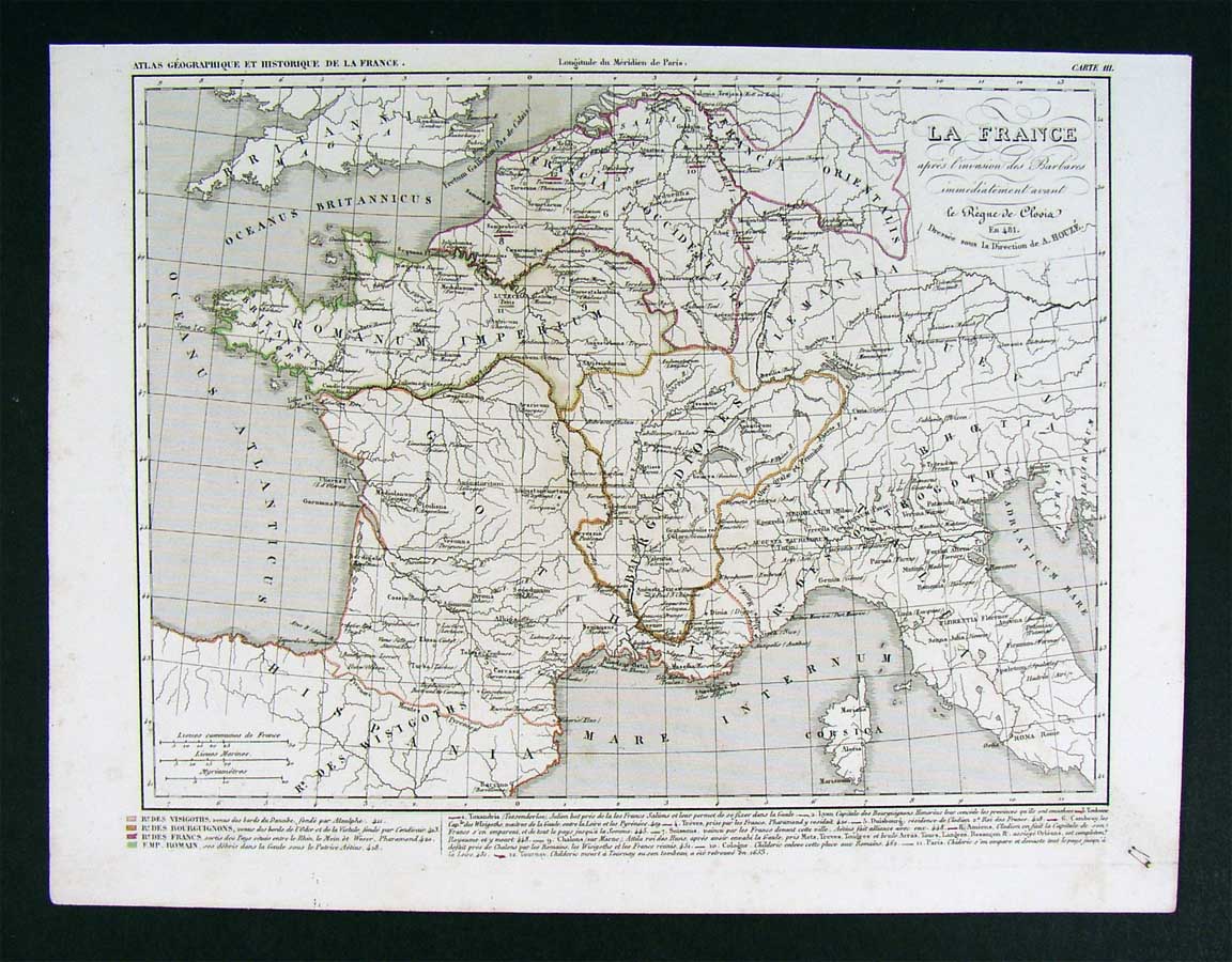 Description: It is an authentic engraved antique map approximately 165 years old with original handcolor outlining. It is from Houze's Atlas Universel Historique et Geographique (Paris: Dumenil, 1841). A copy of the Atlas title page with date is included for authenticity. The name of A. Houze appears in the title block, under whose directions the maps were designed and engraved. It is being sold as a single sheet, not mounted, matted nor framed, basically as seen in the pic, photographed against a dark background so you can see all the edges and actual condition. The map was actually printed in 1841, but depicts an earlier historical period, prepared by Houze, a member of the Societe de Geographie in Paris. A great map for anyone interested in this historical period. Overall a very nice example printed on strong paper with original handcolor in great shape.