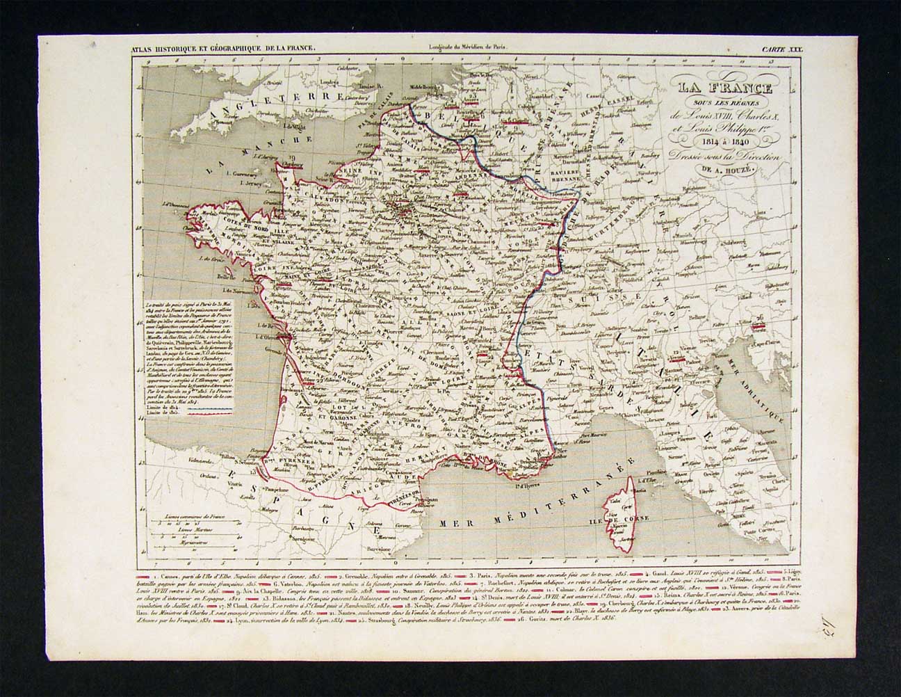 Description: It is an authentic engraved antique map approximately 165 years old with original handcolor outlining. It is from Houze's Atlas Universel Historique et Geographique (Paris: Dumenil, 1841). A copy of the Atlas title page with date is included for authenticity. The name of A. Houze appears in the title block, under whose directions the maps were designed and engraved. It is being sold as a single sheet, not mounted, matted nor framed, basically as seen in the pic, photographed against a dark background so you can see all the edges and actual condition. The map was actually printed in 1841, but depicts an earlier historical period, prepared by Houze, a member of the Societe de Geographie in Paris. A great map for anyone interested in this historical period. Overall a very nice example printed on strong paper with original handcolor in great shape.