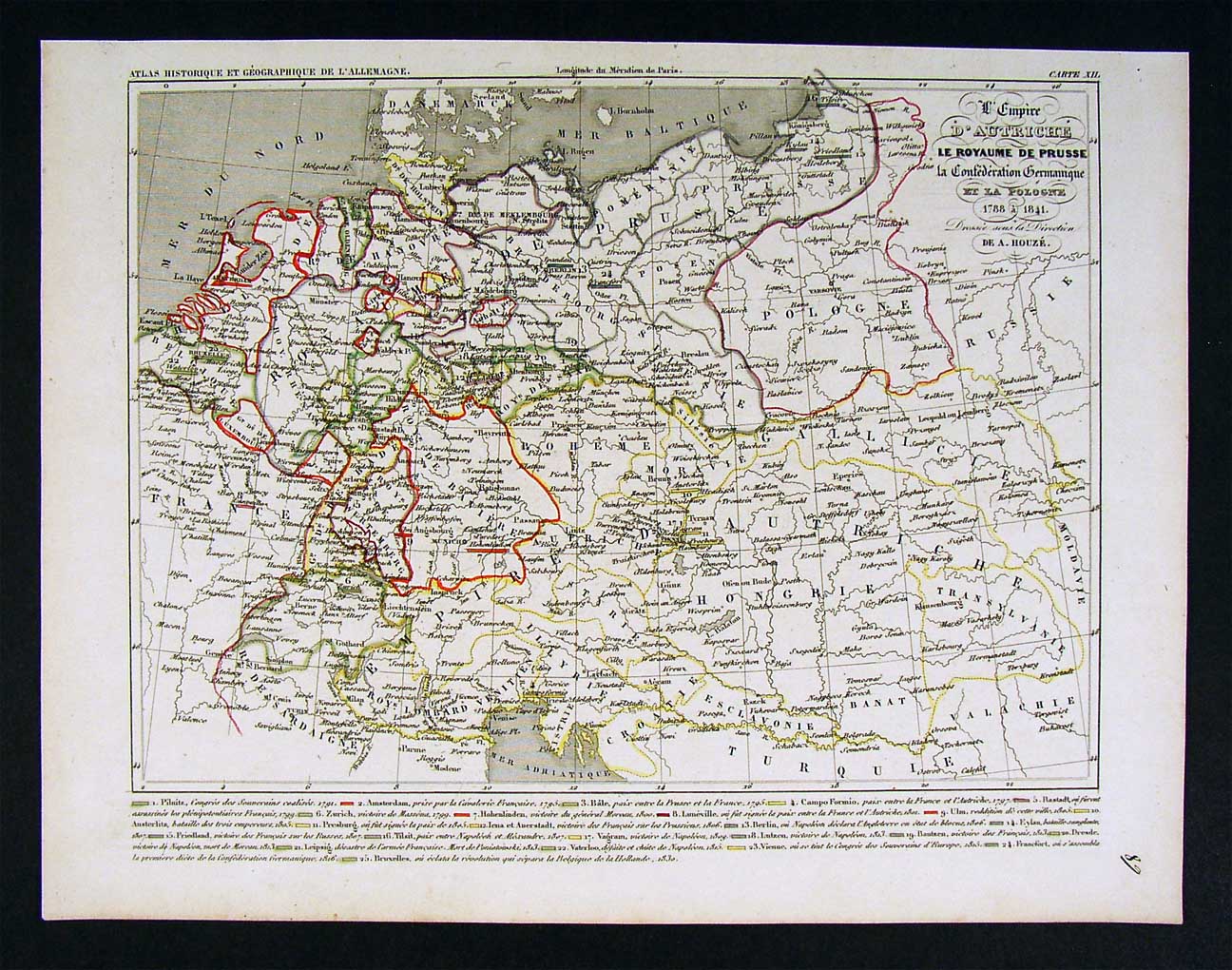 Description: It is an authentic engraved antique map approximately 165 years old with original handcolor outlining. It is from Houze's Atlas Universel Historique et Geographique (Paris: Dumenil, 1841). A copy of the Atlas title page with date is included for authenticity. The name of A. Houze appears in the title block, under whose directions the maps were designed and engraved. It is being sold as a single sheet, not mounted, matted nor framed, basically as seen in the pic, photographed against a dark background so you can see all the edges and actual condition. The map was actually printed in 1841, but depicts an earlier historical period, prepared by Houze, a member of the Societe de Geographie in Paris. A great map for anyone interested in this historical period. There is a nice summary of the main historical events in the margin below the map with corresponding numbers to their locations on the map.. Overall a very nice example printed on strong paper with original handcolor in great shape.