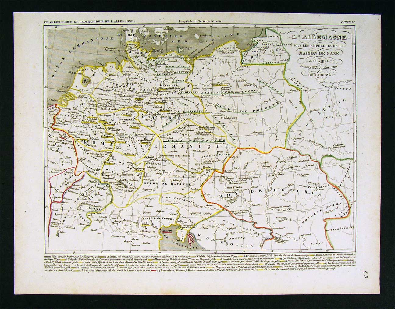 Description: It is an authentic engraved antique map approximately 165 years old with original handcolor outlining. It is from Houze's Atlas Universel Historique et Geographique (Paris: Dumenil, 1841). A copy of the Atlas title page with date is included for authenticity. The name of A. Houze appears in the title block, under whose directions the maps were designed and engraved. It is being sold as a single sheet, not mounted, matted nor framed, basically as seen in the pic, photographed against a dark background so you can see all the edges and actual condition. The map was actually printed in 1841, but depicts an earlier historical period, prepared by Houze, a member of the Societe de Geographie in Paris. A great map for anyone interested in this historical period. There is a nice summary of the main historical events in the margin below the map with corresponding numbers to their locations on the map.. Overall a very nice example printed on strong paper with original handcolor in great shape.