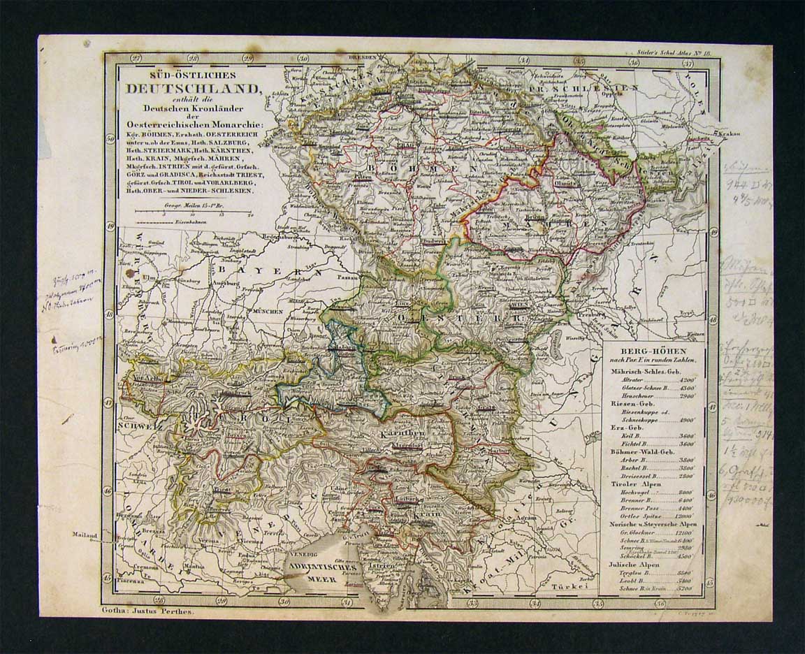 Description: It is an original copper engraved antique map over 150 years old with original hand coloring as issued and the plate marks embossed in the margin. It is from Adolf Stieler's Schul-Atlas Uber alle Theile der Erde published in Gotha by Justus Perthes, 1853. A copy of the title page is included for authenticity. The name of the atlas is in the upper right corner and the publisher's name appears in the bottom center margin. The map is not mounted nor matted, being sold as a single sheet as seen in the first pic. These are the smaller maps from the school atlas, we also have some of the larger Stieler maps from the Hand Atlas in other listings.
