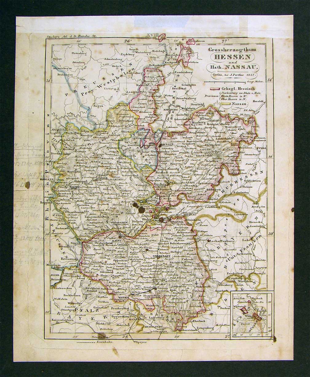 Condition: The map is in Poor to Fair condition with overall tonal aging, basically as seen in the pics, blank on the reverse with original handcoloring as issued. The pic basically shows the condition very well. As can be seen there is smudging, some stains, spotting, writing in the margin, underlining and a visible repair on the top margin. Overall, it has a very rich patina for those looking for a map with a real aged quality. Pics are of the actual map.