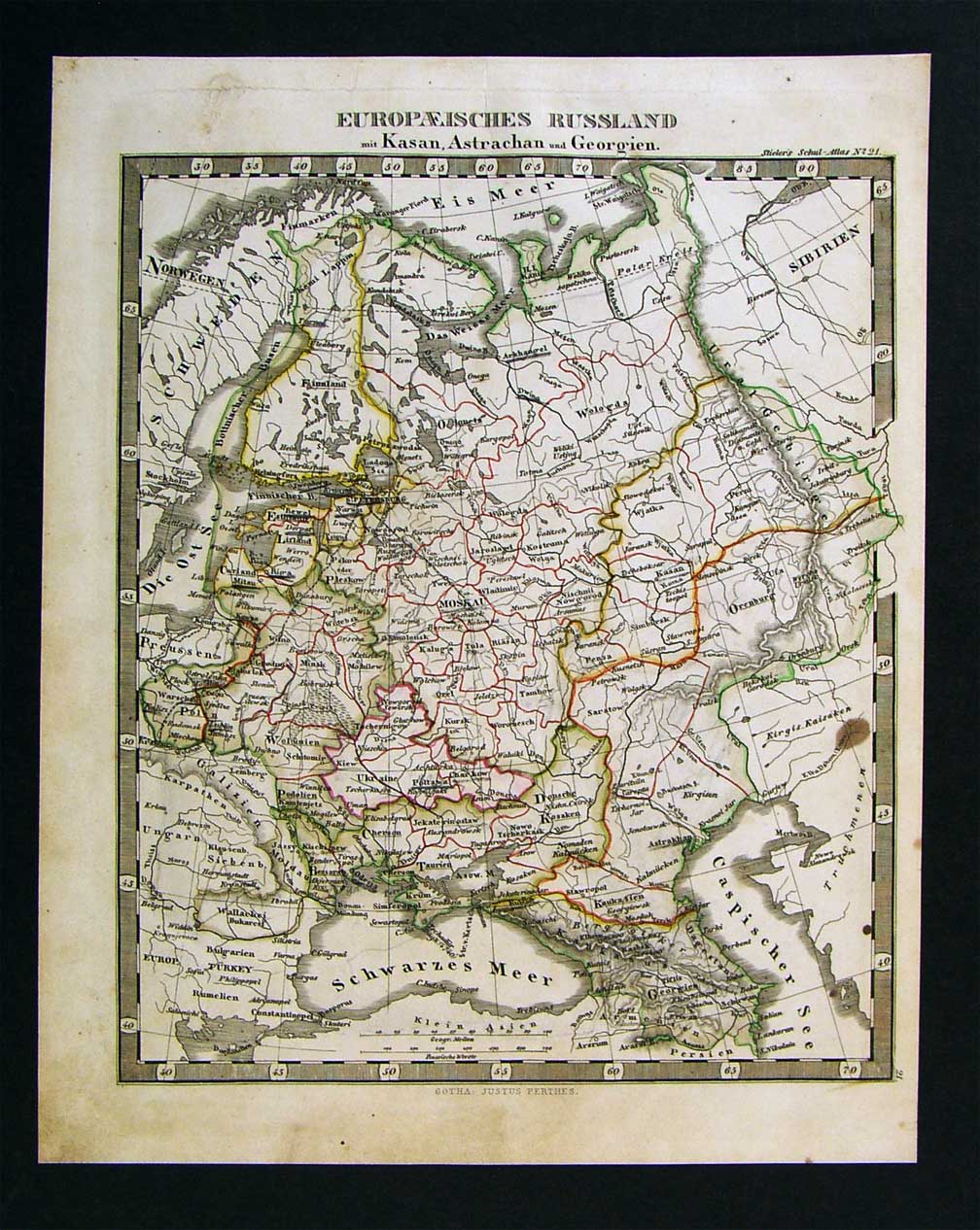 Description: It is an original copper engraved antique map over 150 years old with original hand coloring as issued and the plate marks embossed in the margin. It is from Adolf Stieler's Schul-Atlas Uber alle Theile der Erde published in Gotha by Justus Perthes, 1853. A copy of the title page is included for authenticity. The name of the atlas is in the upper right corner and the publisher's name appears in the bottom center margin. The map is not mounted nor matted, being sold as a single sheet as seen in the first pic. These are the smaller maps from the school atlas, we also have some of the larger Stieler maps from the Hand Atlas in other listings.