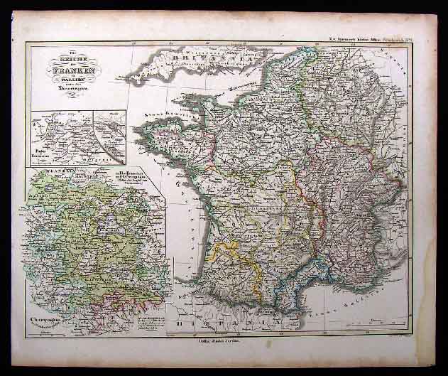 Description: It is an original engraved antique historical map with original handcoloring designed by Karl von Spruner with vibrant handcoloring as issued. It is from an 1854 edition of Spruner's Historisch Geographischer Atlas, (Gotha: Justus Perthes, 1854). It is from an enlarged edition with no centerfold. It is a map of Ancient Gaul with insets of Champagne and Pagus Parisiacus or Ancient Paris. Overall, a Beautiful Map that will Frame up Well!
